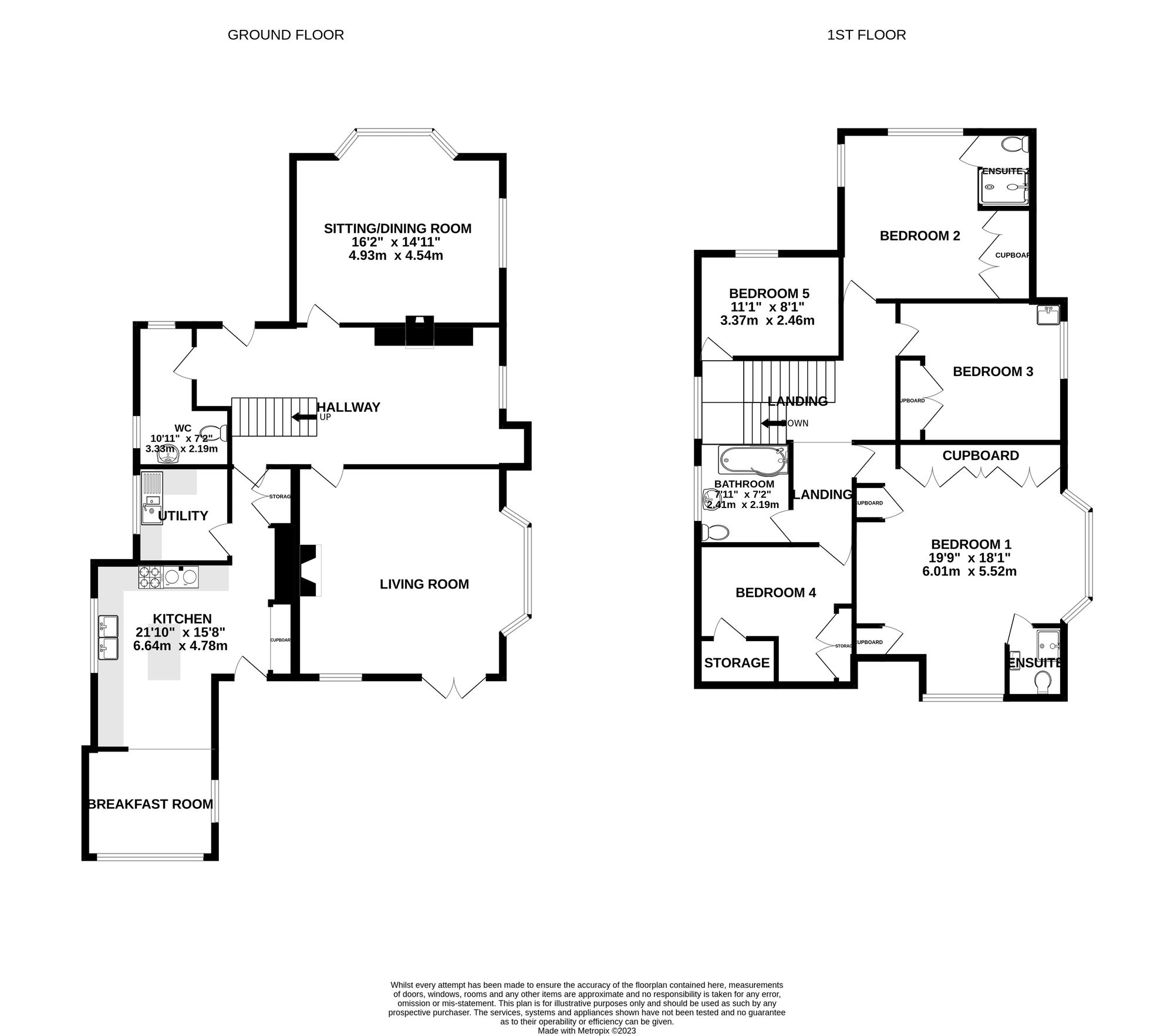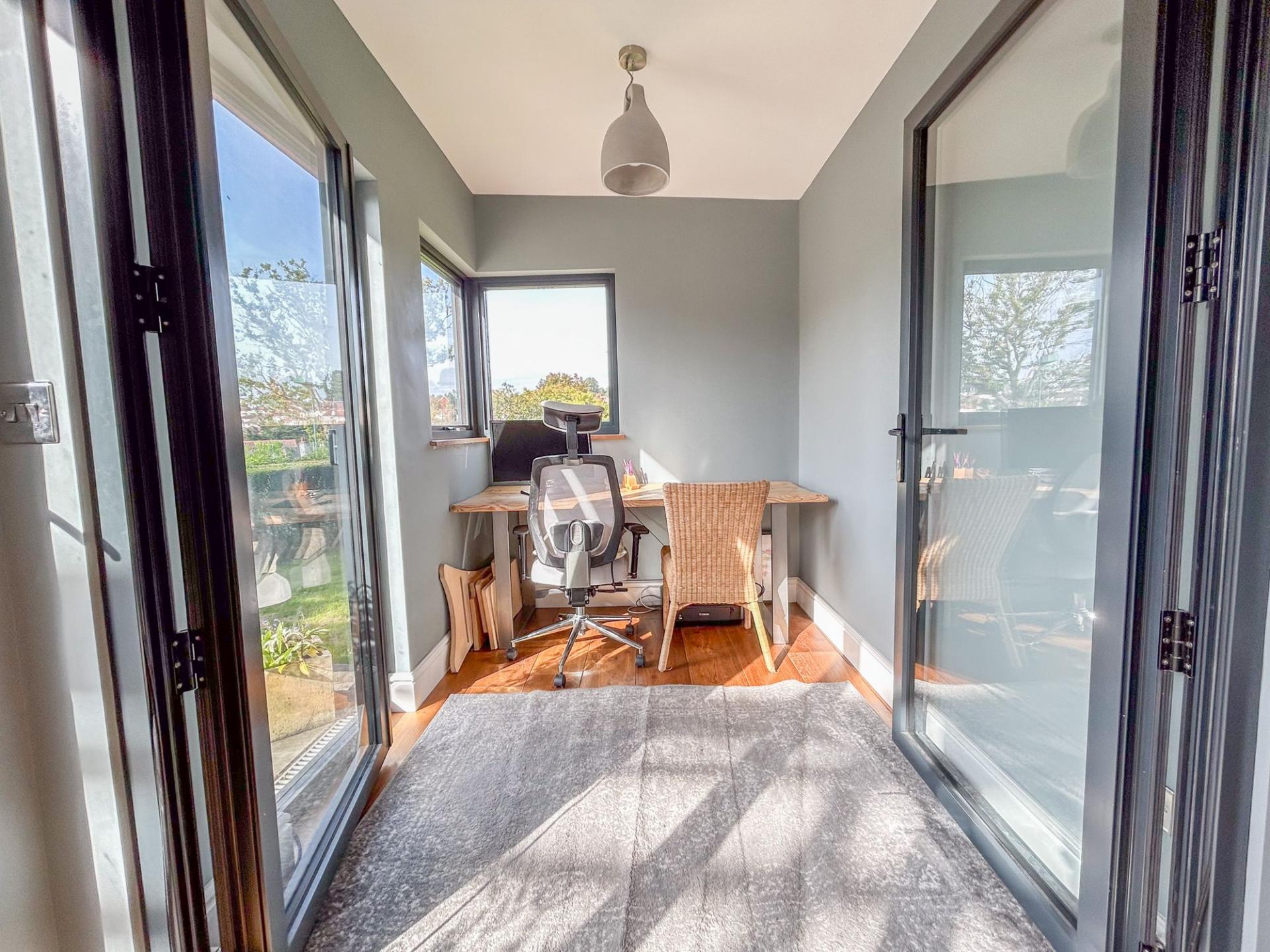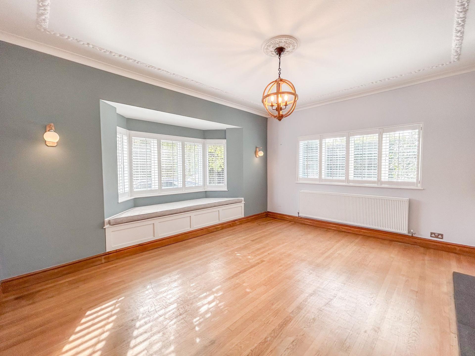 To the first floor there are five bedrooms, all of which are generous double rooms. Four of the bedrooms benefit from fitted storage, ideal for utilising space. The principal and second bedrooms both enjoy ensuite shower rooms, while the family bathroom has a large bath suite and ambient floor lighting. The principal bedroom has a bay-window, mirroring that of the living room below, with a quaint, secondary bay-window, where a dressing table fits perfectly.