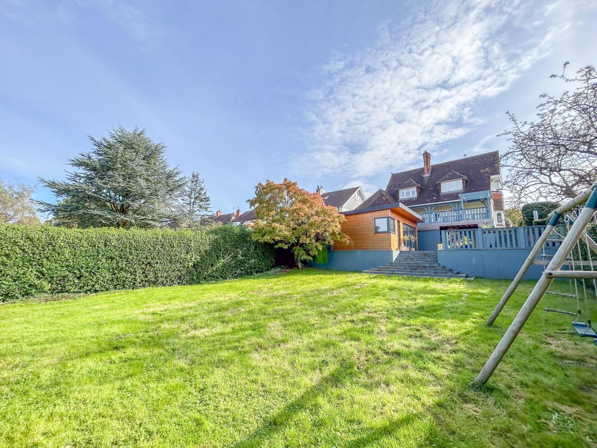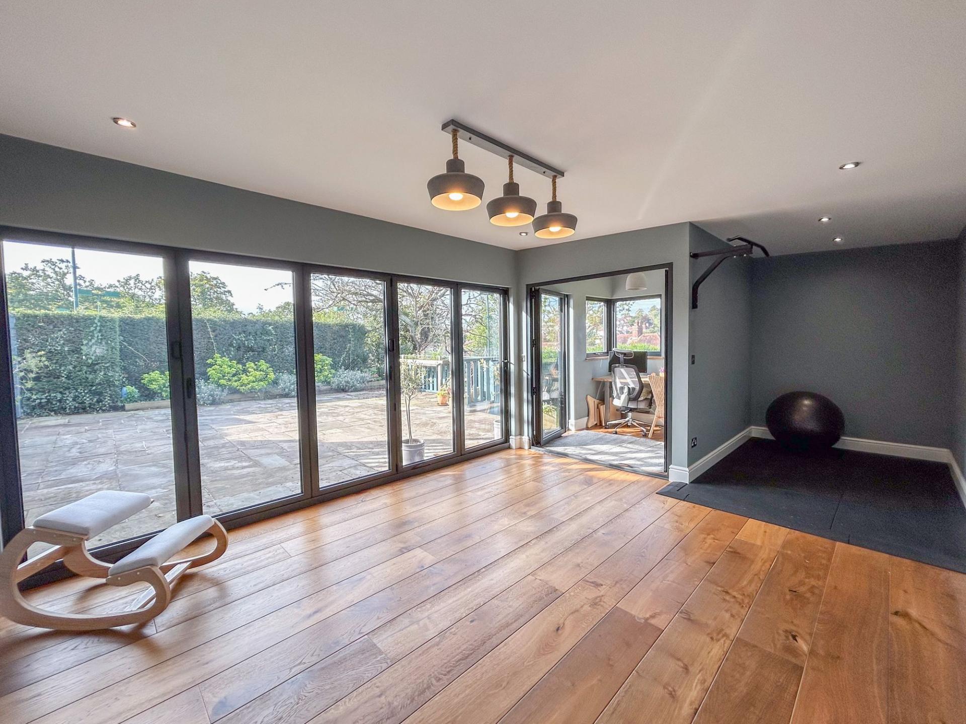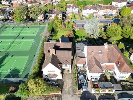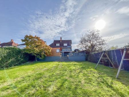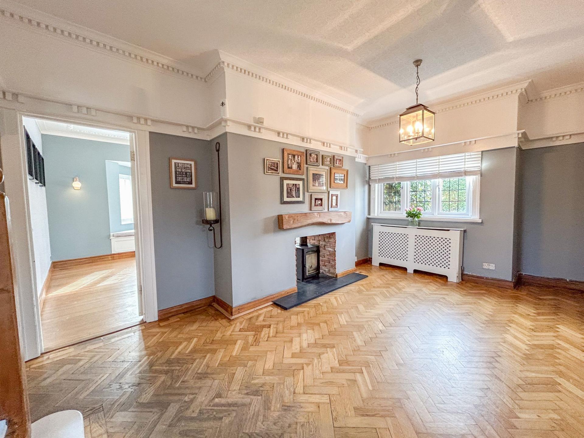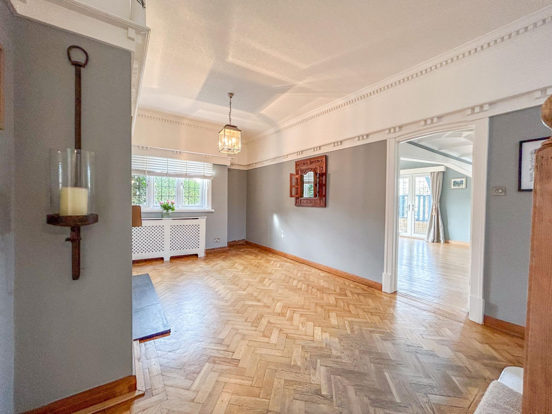 With character throughout, the property is well-proportioned with ample living space for family living and entertaining, with expansive lawned gardens and a double garage at the rear. A driveway to the fore allows the property to accommodate several vehicles. Welcomed into a spacious hallway, period features can be found throughout, with ornate ceiling mouldings, coving and parquet flooring, while modern elements tastefully juxtapose the original features, with new lattice windows complimenting the original style and a dual log burning fire. There are two large bay-aspect reception rooms to the ground floor, which could both be living rooms or one a dining room, while the kitchen also offers space for a breakfast table. The kitchen benefits from light blue shaker style wall and base units with a red Aga at the heart. There are a range of features to include a dual Belfast sink, central island and a wine cooler. From the kitchen, the garden can be accessed, which offers a large decking area, providing superb views overlooking the tennis courts. Below, there is a patio area, where the outbuilding can be found, offering space for a home office and gym. Beyond, there is an extensive lawn, minimally overlooked and providing access to the double garage. There is a useful utility room from the kitchen and a convenient cloakroom from the hallway.