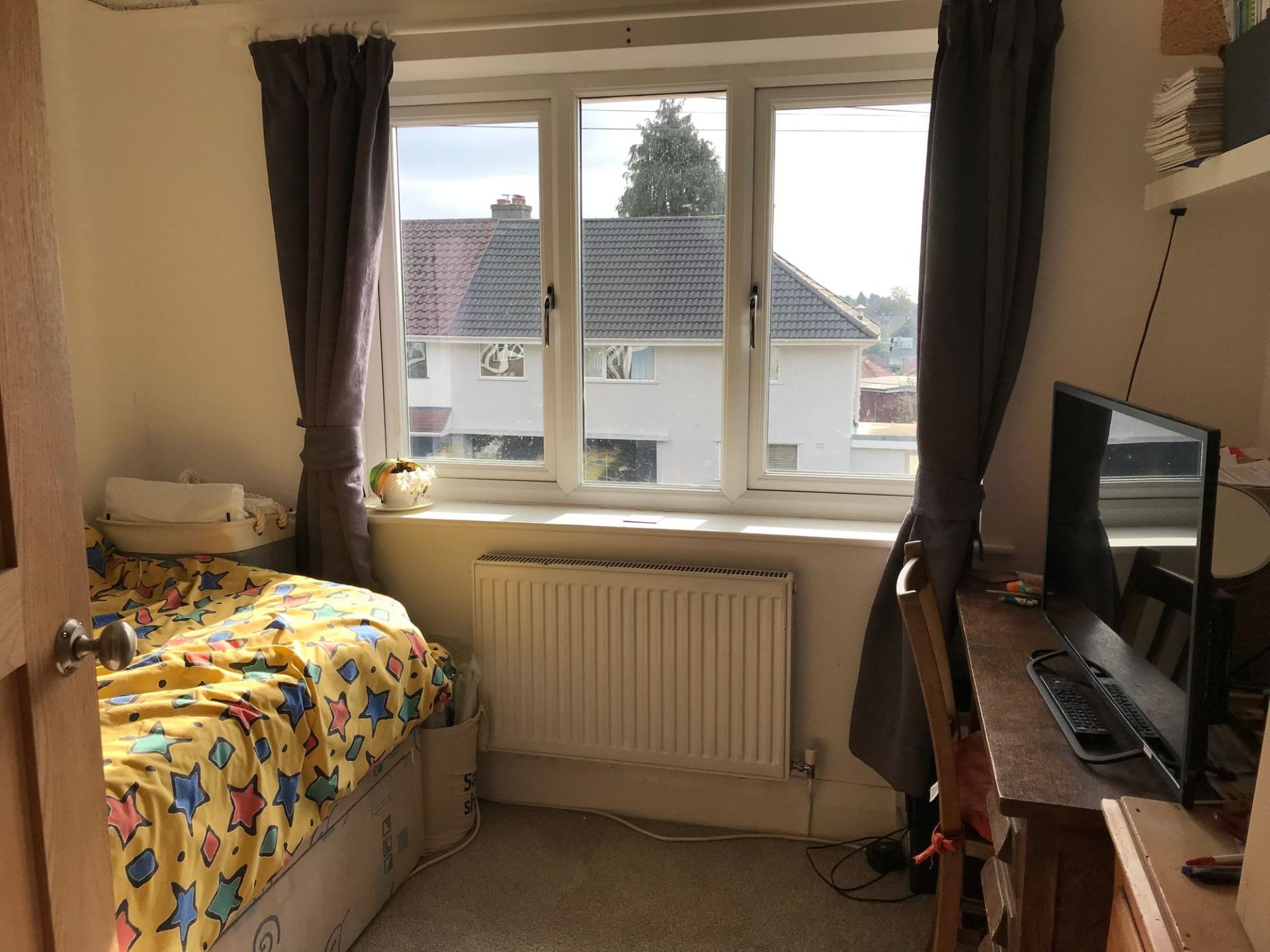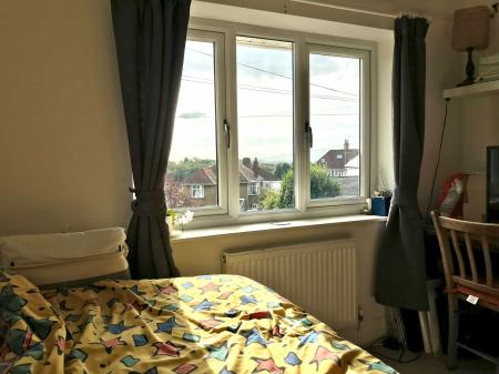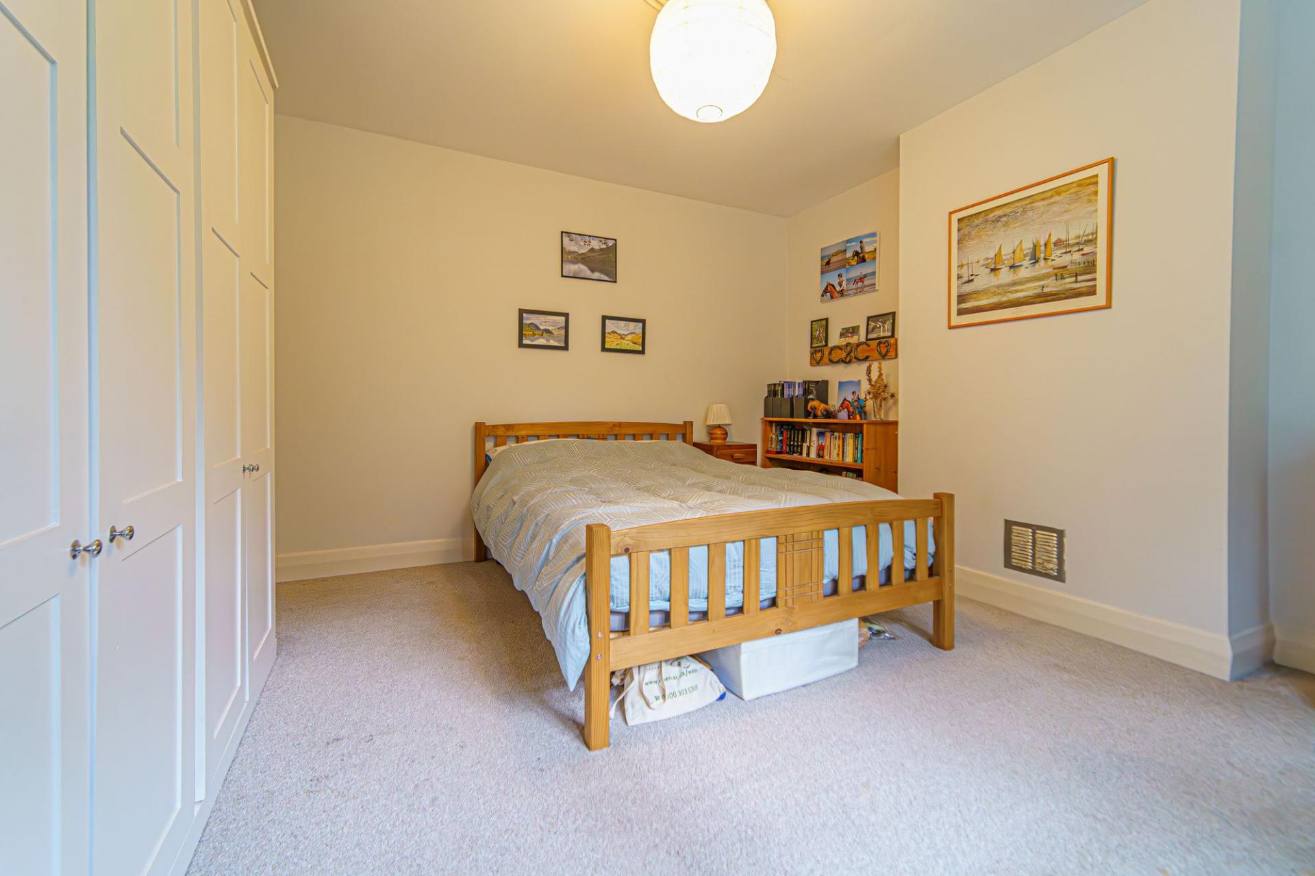 Heading upstairs, the first of the two generously sized double bedrooms boasts the same original stained glass bay windows found on the ground floor, offering plenty of natural light. The second double room looks out into the trees and leaves of the back garden and beyond, up towards Ridgeway. Both double bedrooms are equipped with integrated storage to optimise space and functionality. The third bedroom is a cozy single room that can also be used as a home office, dressing room, or nursery.