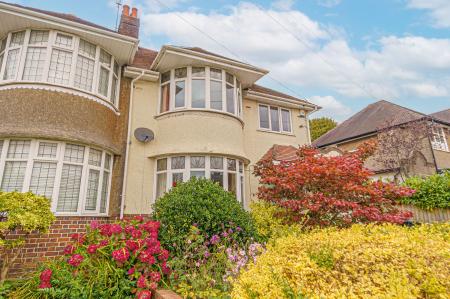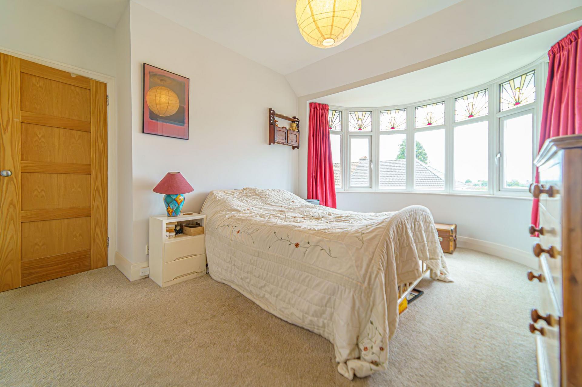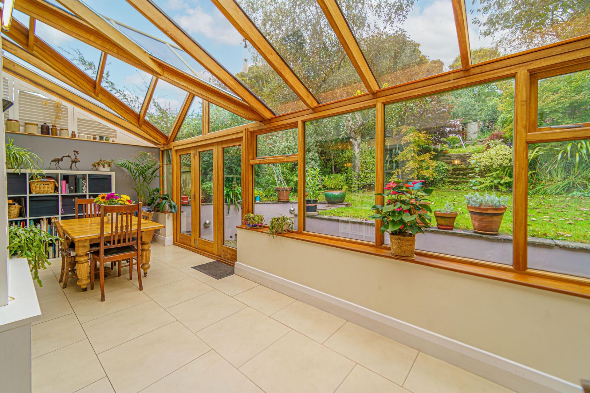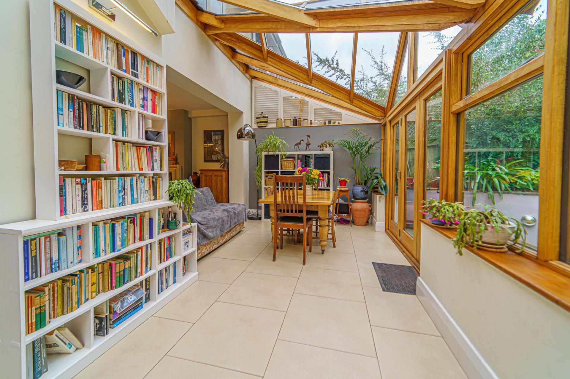 Heading upstairs, the first of the two generously sized double bedrooms boasts the same original stained glass bay windows found on the ground floor, offering plenty of natural light. The second double room looks out into the trees and leaves of the back garden and beyond, up towards Ridgeway. Both double bedrooms are equipped with integrated storage to optimise space and functionality. The third bedroom is a cozy single room that can also be used as a home office, dressing room, or nursery.