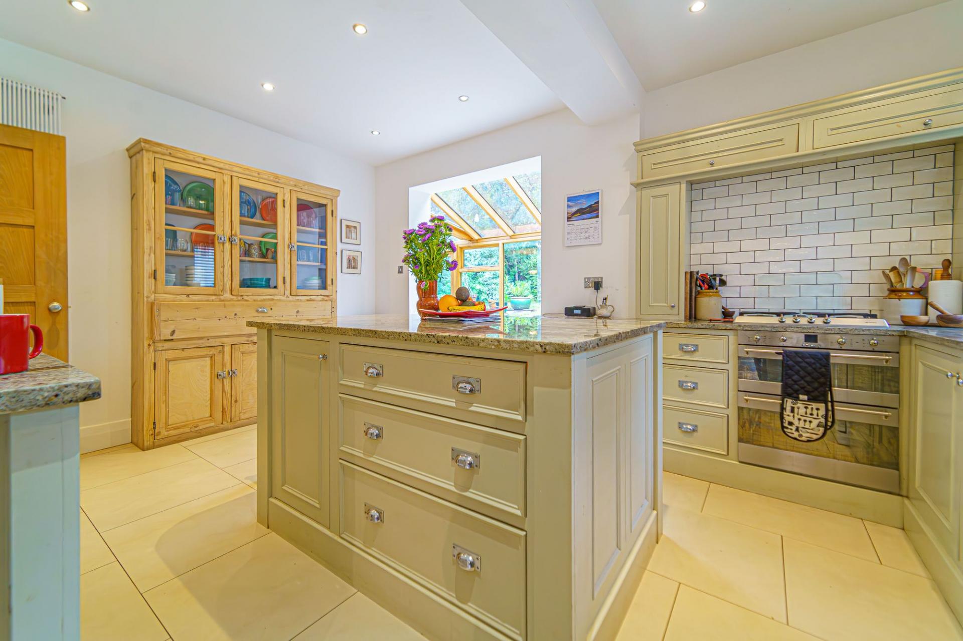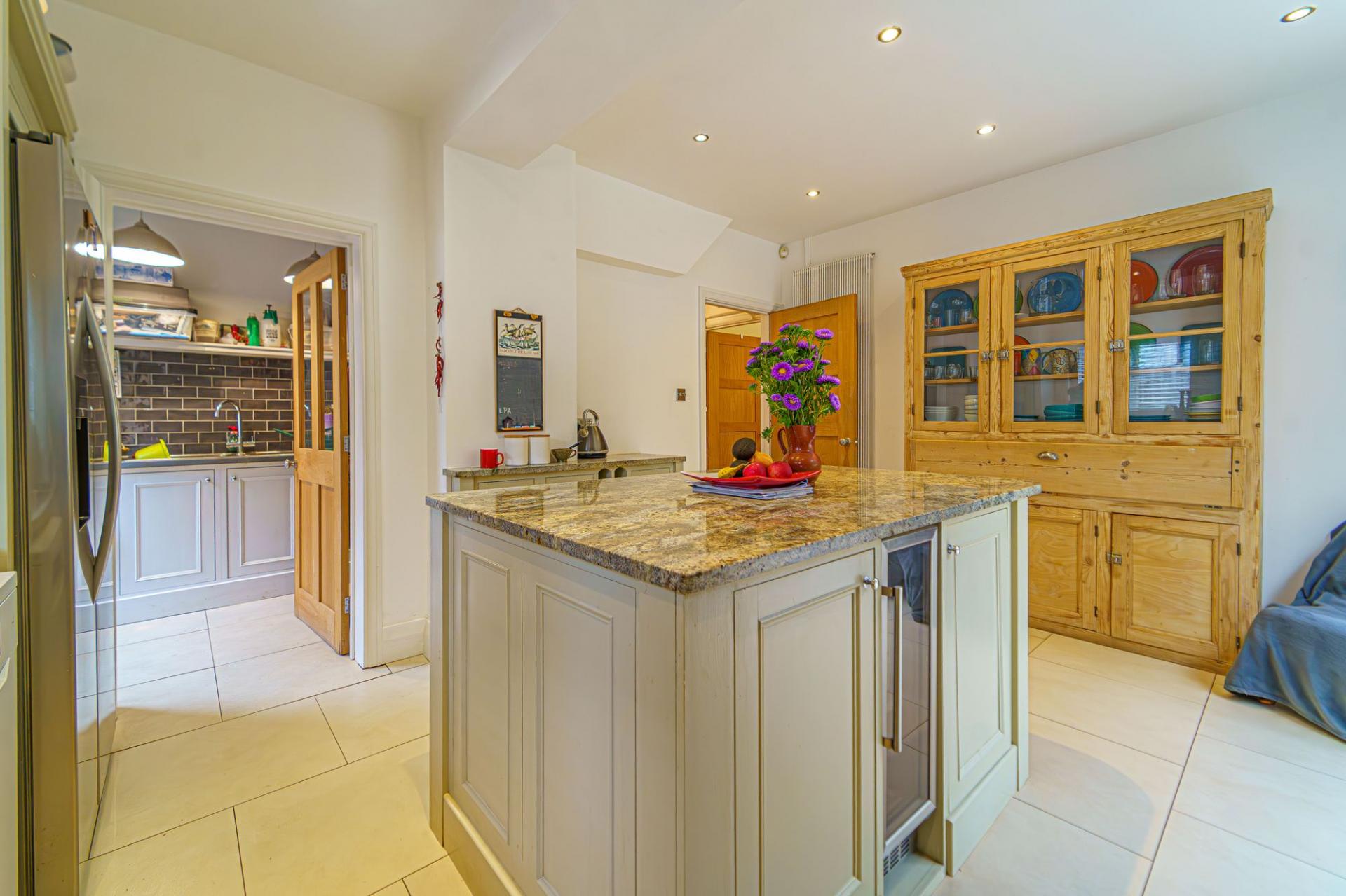 The kitchen is well-equipped with generous storage options, a central island with breakfast bar seating, and marble work tops. Integrated appliances include a 4-ring gas hob, oven/grill, and wine cooler. Adjacent to the kitchen, the former garage has been partitioned to create a spacious utility room, adding extra convenience for busy family life, and a separate storage area which is accessible from both the hallway and the front driveway.