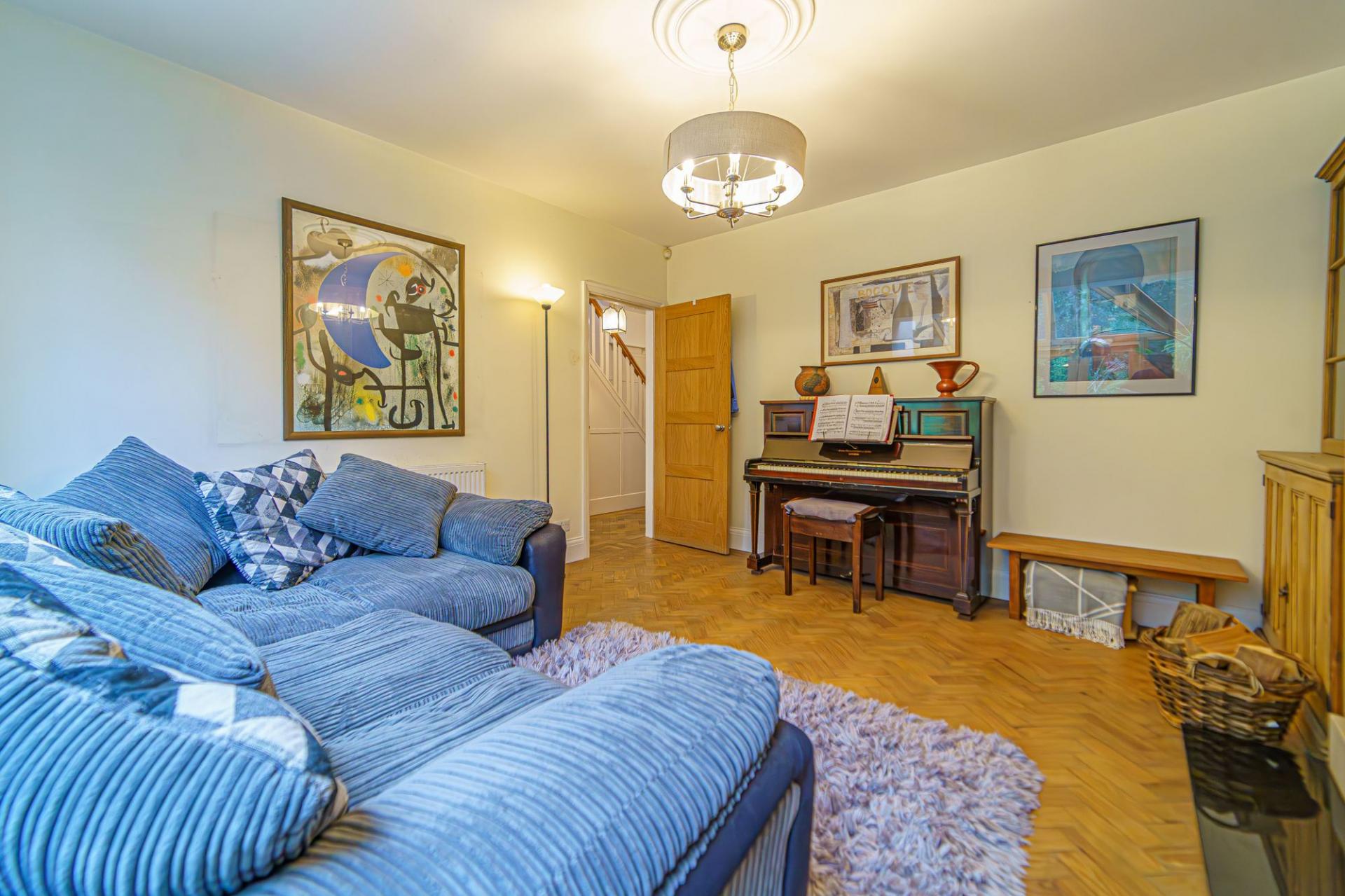Upon entering the home, you are greeted by a welcoming hallway featuring original panelling and solid oak block flooring, the herringbone pattern extending in pitch pine throughout much of the ground floor. The spacious front living room is beautifully illuminated by stained glass bay windows, complemented by a charming gas fireplace that adds a warm, inviting touch.