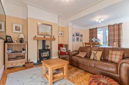 On the ground floor, you enter through a welcoming hallway, providing access to the main living areas and stairs leading up to the first floor. To the left is the charming living room, featuring parquet flooring, a bay-fronted window that fills the space with natural light, and a feature fireplace that adds character and warmth. To the rear of the home is the impressive open-plan kitchen/family room. The kitchen is styled in a beautiful shaker/cottage design, offering ample unit and worktop space along with a stylish range cooker. This flows into a generous seating and dining area, with the seating section further enhanced by a cosy log burner, creating a perfect family hub.