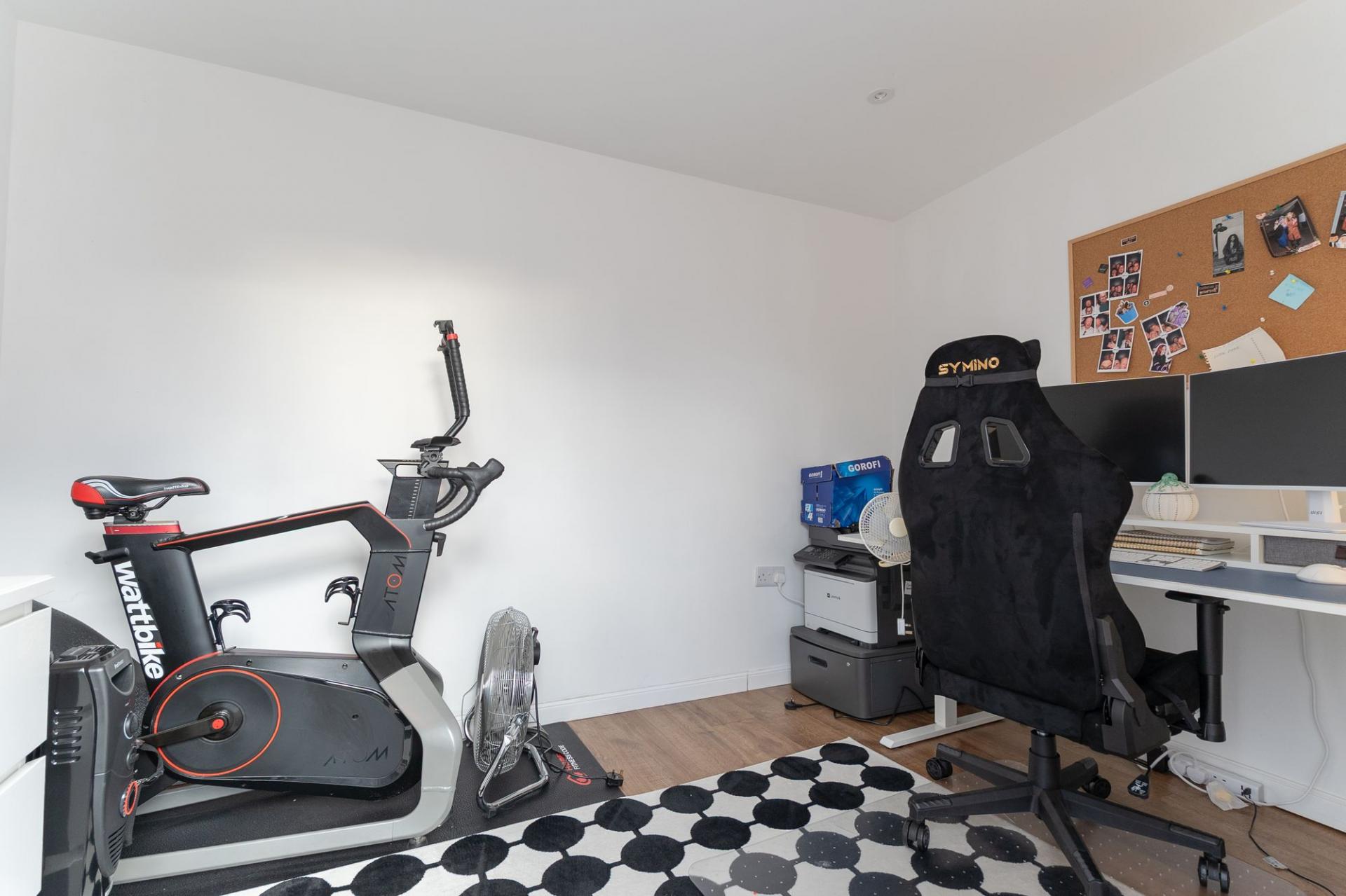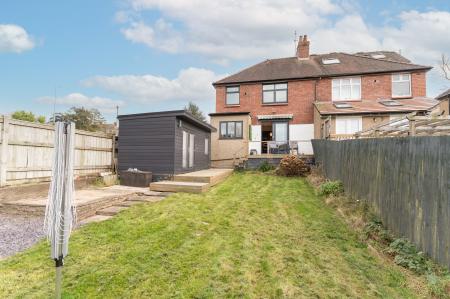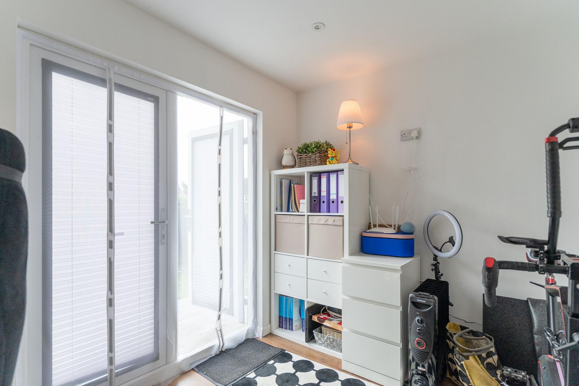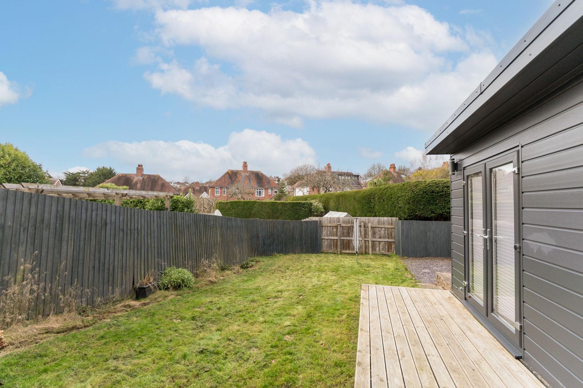 Stepping outside we have the wonderful rear garden, fully enclosed and consisting of a large grass lawn, accented with patio, pebble stone and decked spaces, including a brilliant deck from the kitchen that overlooks the garden. The outdoor space is perfect for a variety of outdoor activities, such as al-fresco dining, sunbathing, and offers plenty of space to welcome guests for dinner parties and barbeques. There is also a purpose built summer house used as a stunning office space, perfect for offering a separate workspace from the house, as well as a storage. We can also find another secluded patio at the front of the house, adjacent to the tandem driveway to park two vehicles.