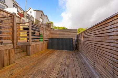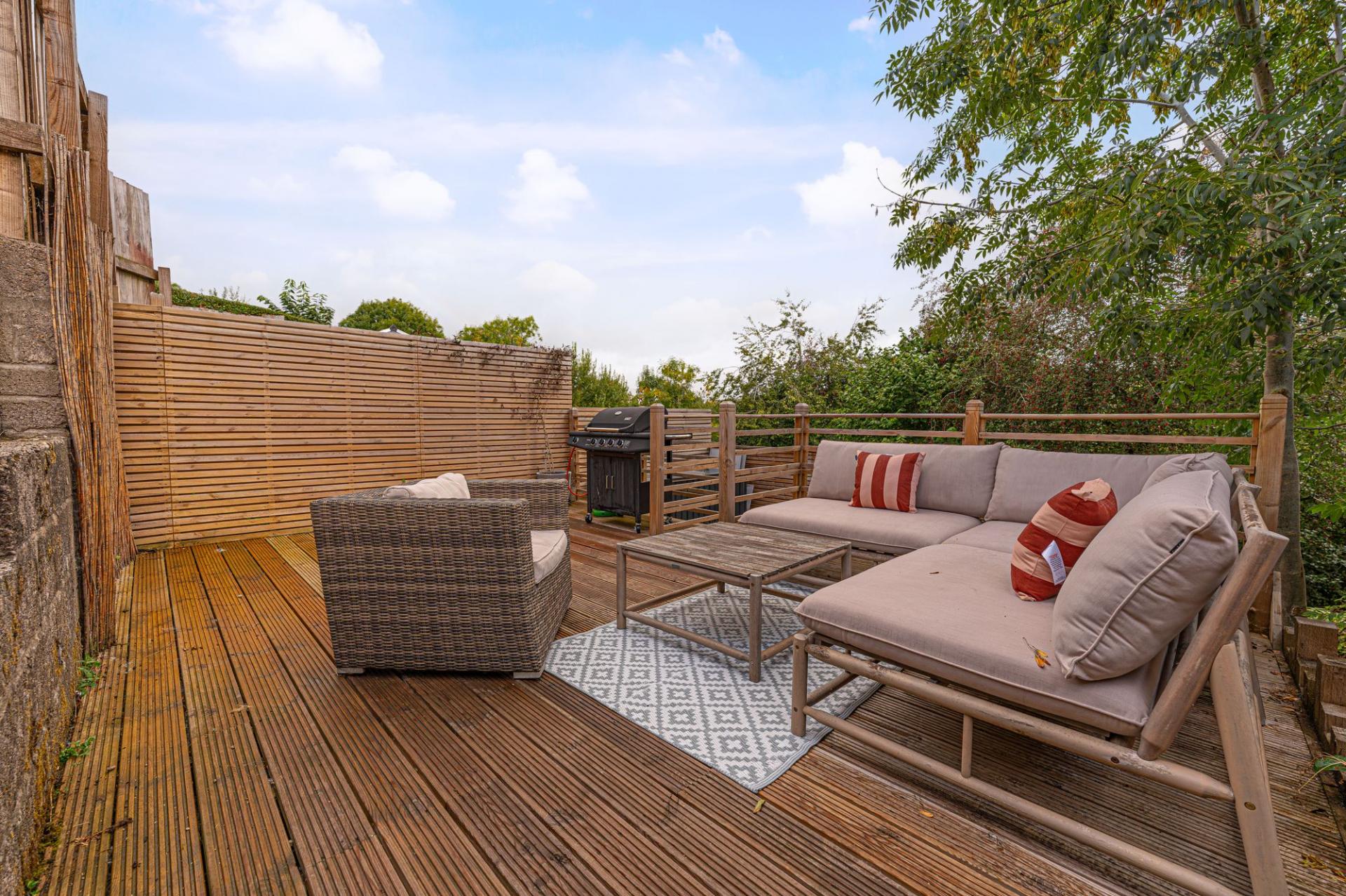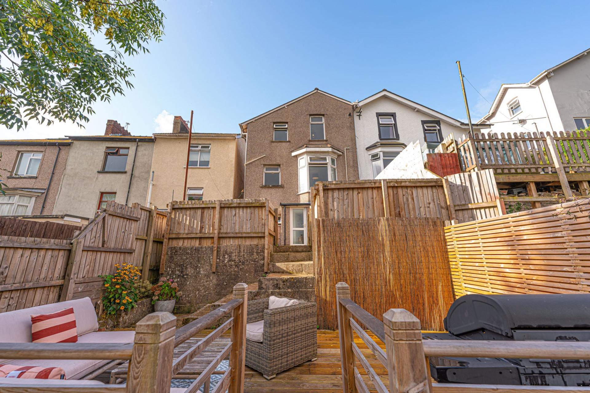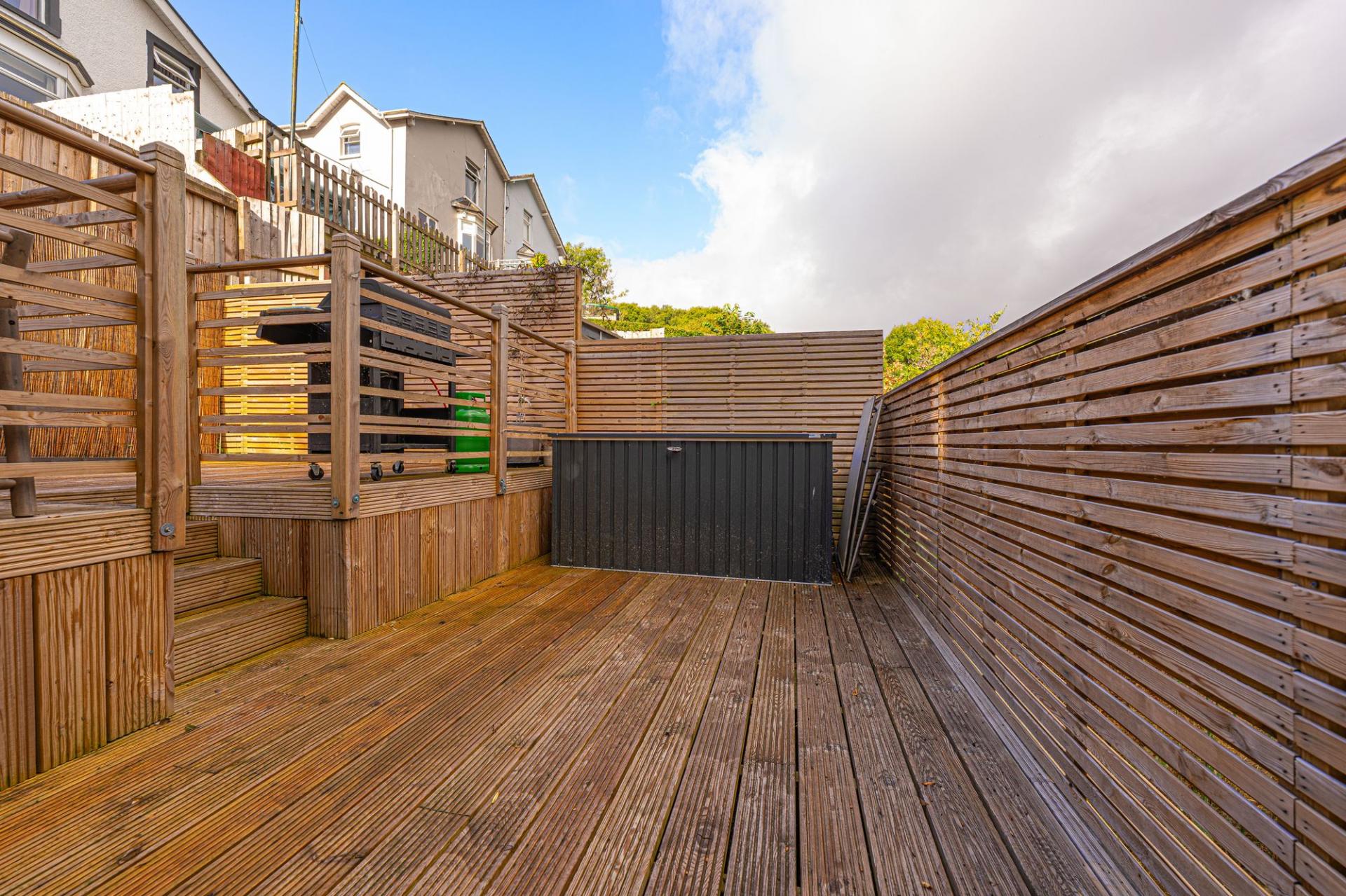 Stepping outside we have the lovely rear garden, which is comprised of a lawn and pebble stone area from the house, which steps down to a multi-tiered wooden deck, which is perfect for lounging in the sunshine and al-fresco dining, and offers plenty of space for entertaining guests. Beyond the deck there is a sizeable wild area of the garden plot that could offer great potential for landscaping and further development of this large outdoor retreat. The property also features a gated pathway to connect the garden to the street level, where on road parking is available.