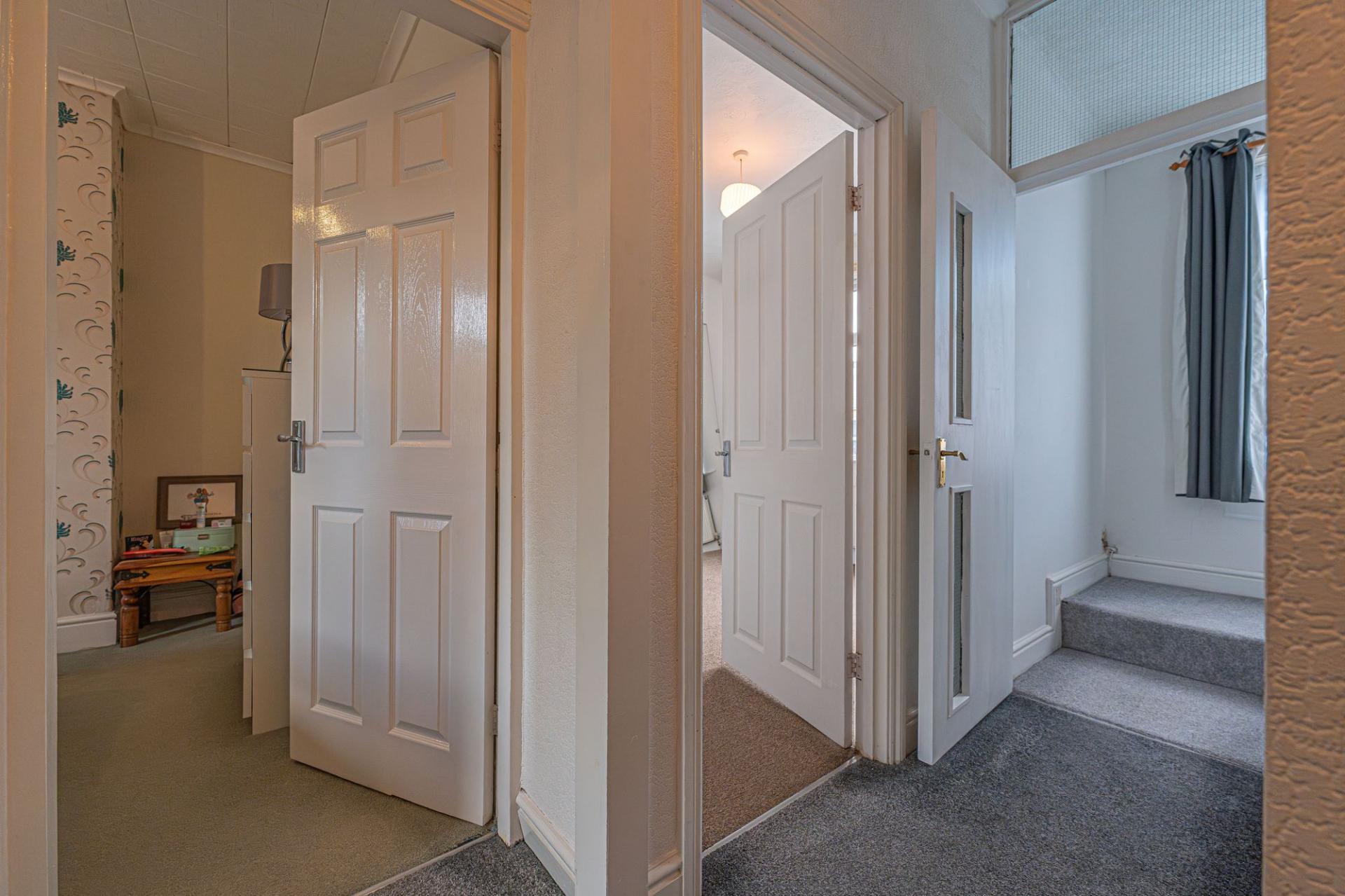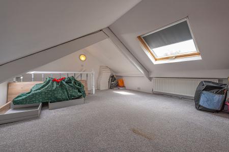 To the first floor we find the first two bedrooms, which are both well sized double rooms, with the rear facing bedroom having the added benefit of a helpful walk in wardrobe for optimal storage, while also retaining the former plumbing to allow for a potential en-suite conversion. The main family bathroom is fitted with a bath suite and overhead shower, and is found from the hallway alongside a staircase to the second floor, where the third double bedroom is located, with velux windows for plenty of light.