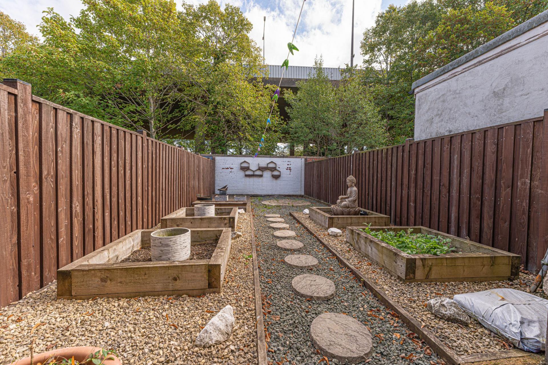Stepping outside, we arrive at the fully enclosed rear garden, which features a low-maintenance design comprised of pebble stone, raised planting beds, and a decked seating area, making it a tranquil retreat for lounging in the fresh air, or welcoming guests for tea/coffee or dining al-fresco style. On road parking is available to the front of the house.