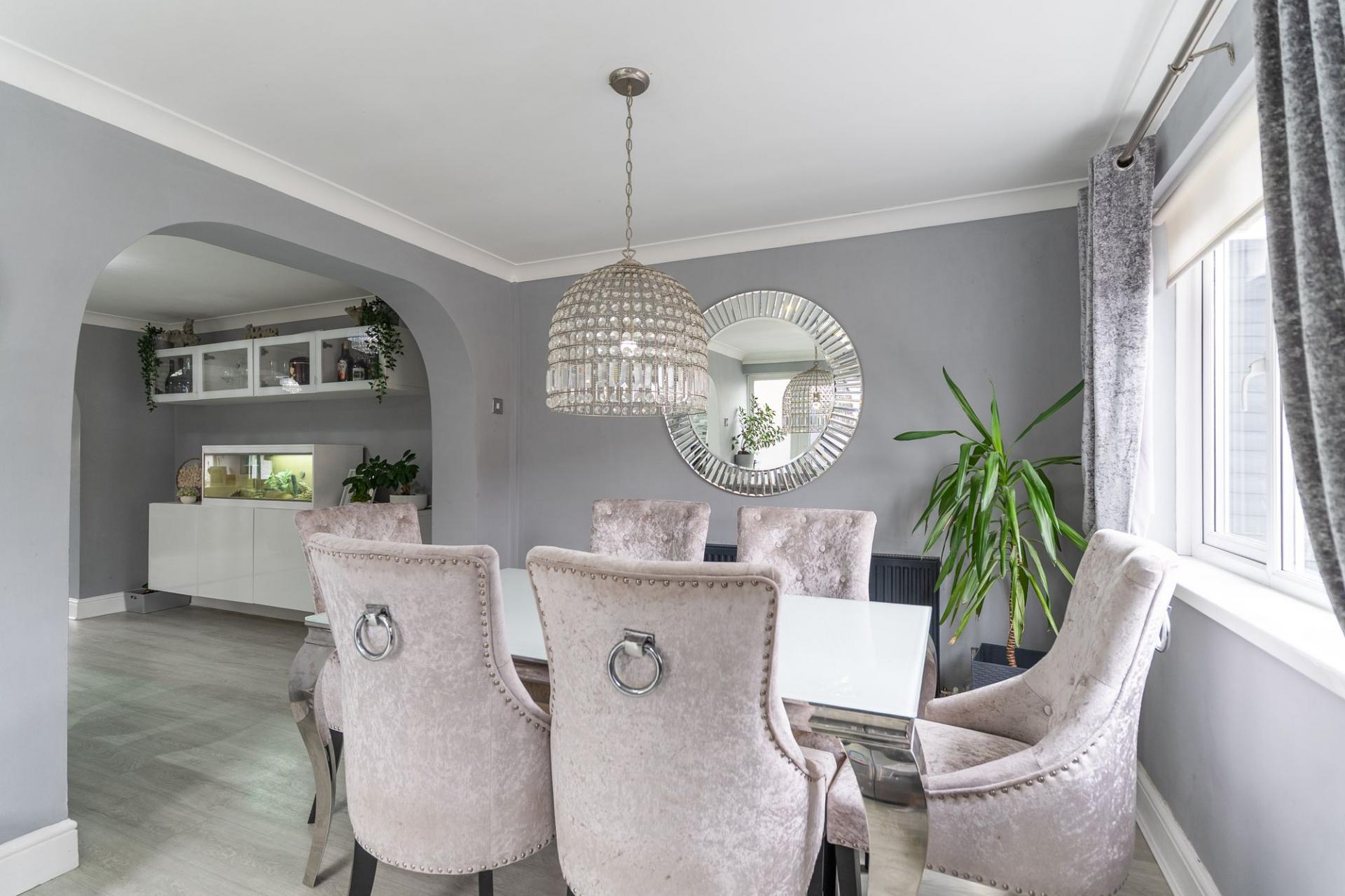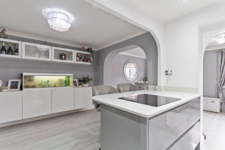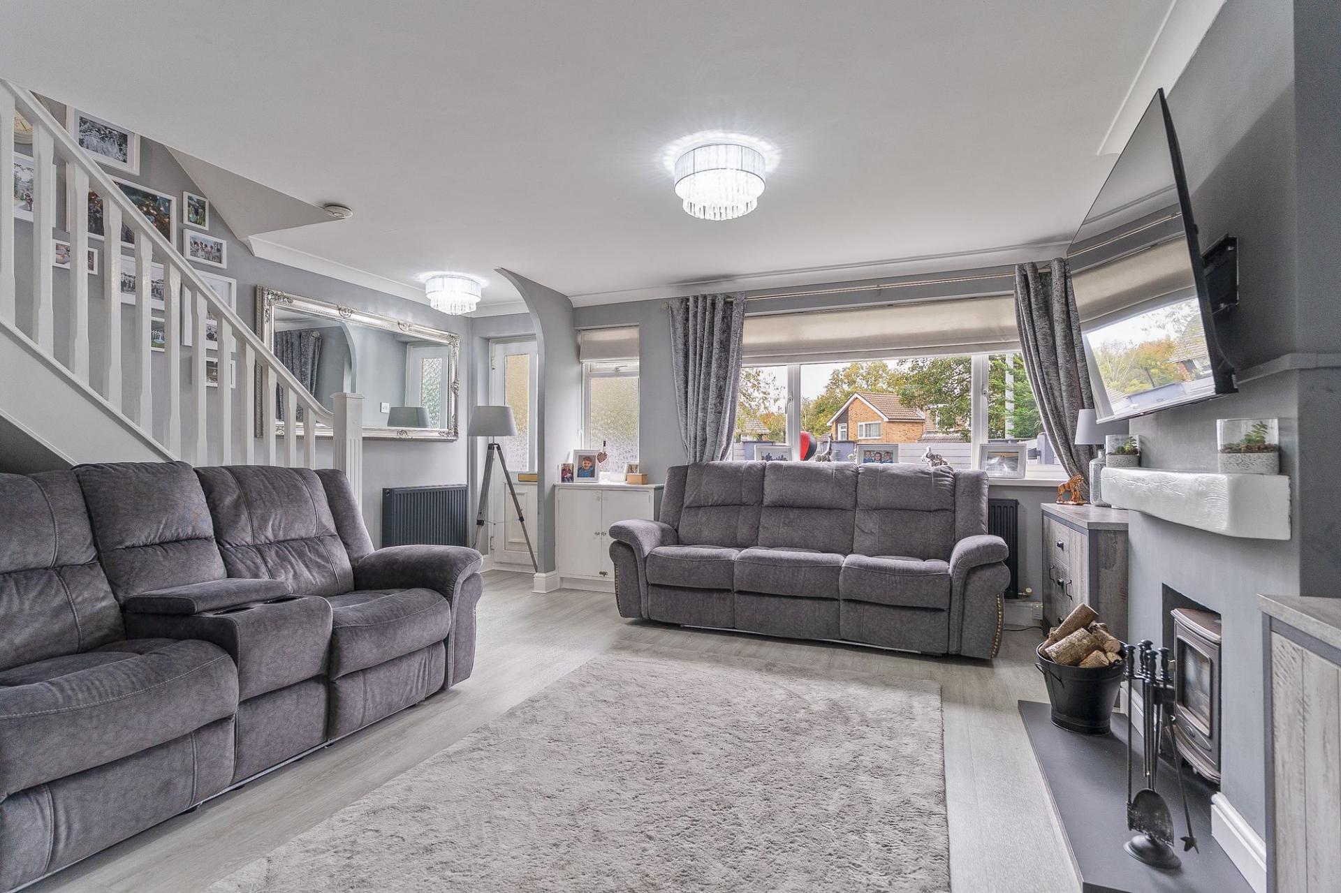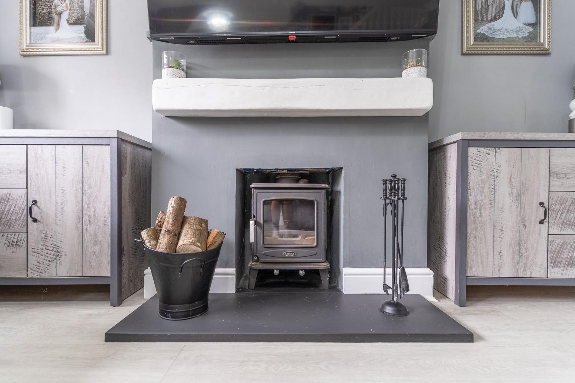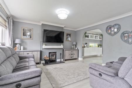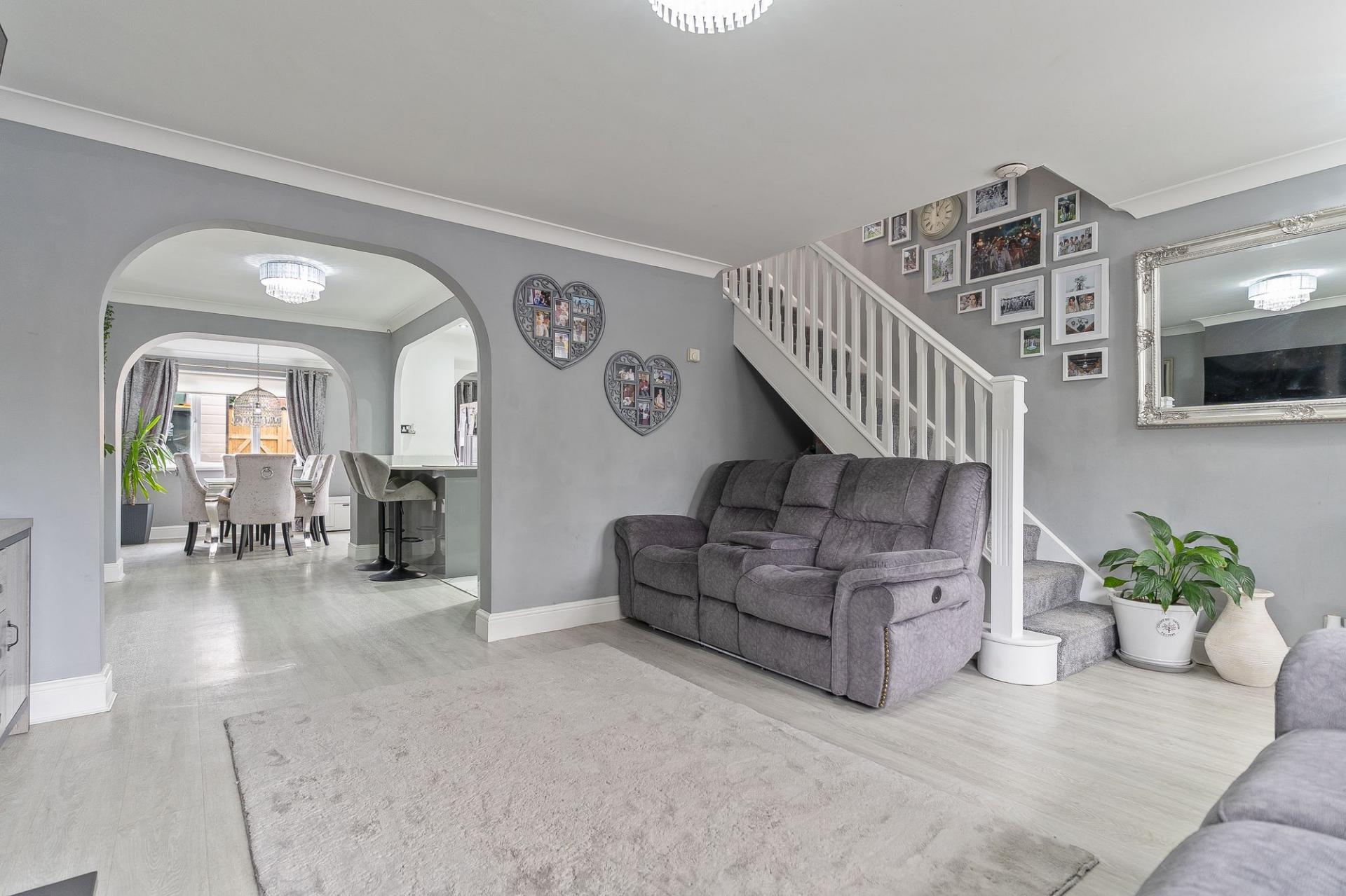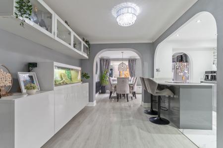 The ground floor of the property features a naturally bright and spacious open-plan layout, designed with family living in mind. To the front, the generous lounge enjoys a welcoming atmosphere, complete with a feature dual-fuel log burner fire and an open staircase leading to the first floor. At the heart of the home lies the modern fitted kitchen and breakfast area, finished to an exceptional standard with high-quality integrated Bosch appliances, including a double oven, microwave, and dishwasher. The kitchen also benefits from sleek quartz worktops, an instant hot water tap, and a stylish breakfast bar, creating a perfect space for casual dining. To the rear, the dining area provides an excellent setting for family meals or entertaining, and includes a large American-style fridge/freezer.