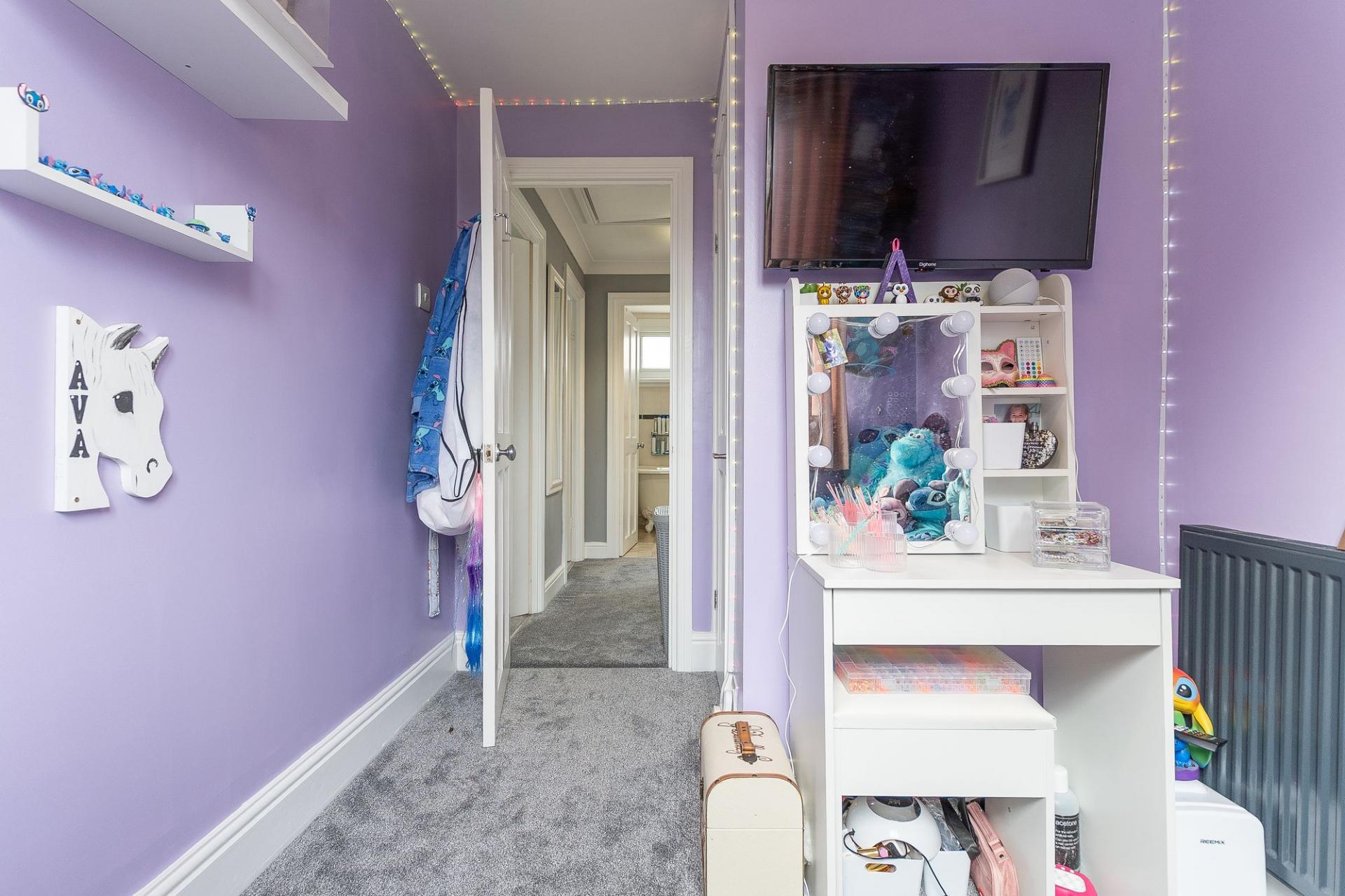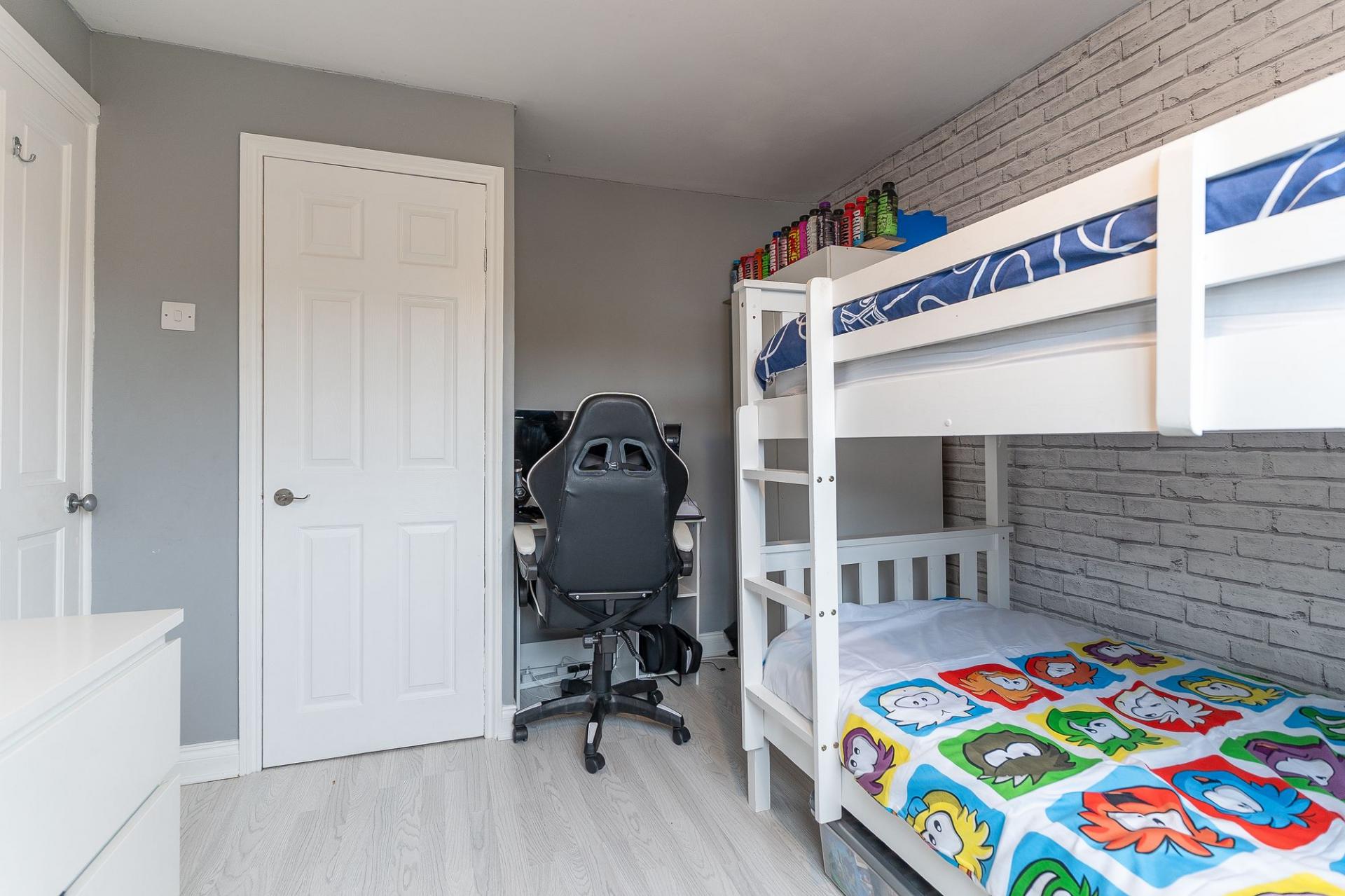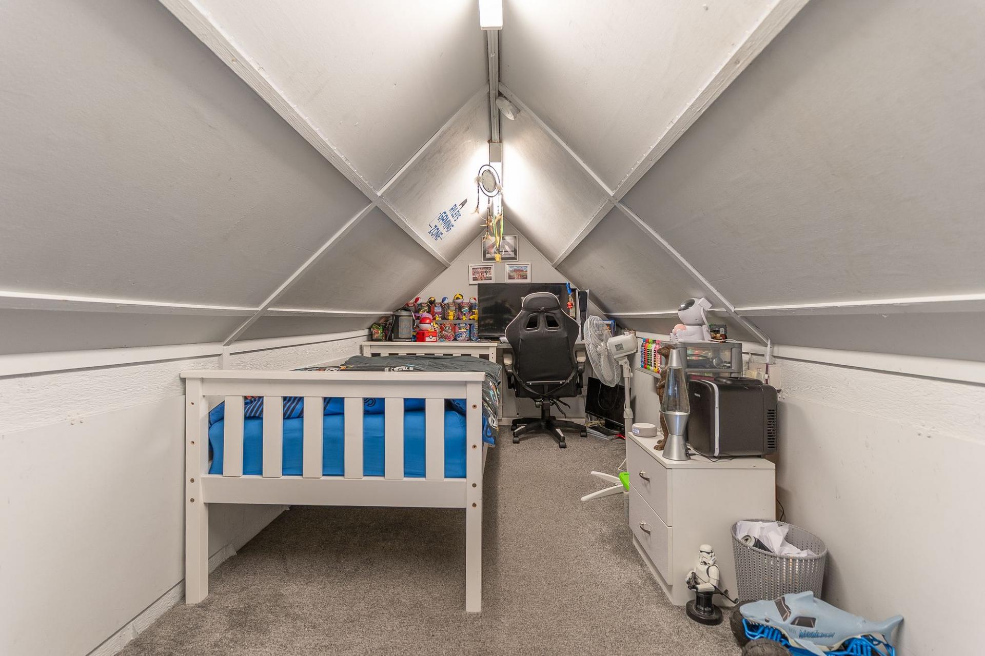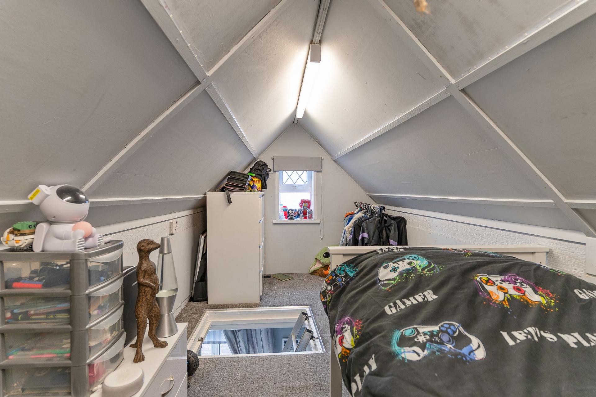 Upstairs, there are three well-proportioned bedrooms, comprising two doubles and a single room, all presented to a high standard. The family bathroom is modern and well maintained, offering a clean and functional space. The loft has been fitted with a window and carpeted, presenting a versatile area that could be used as an office, playroom, or additional storage, offering further flexibility for a growing family.