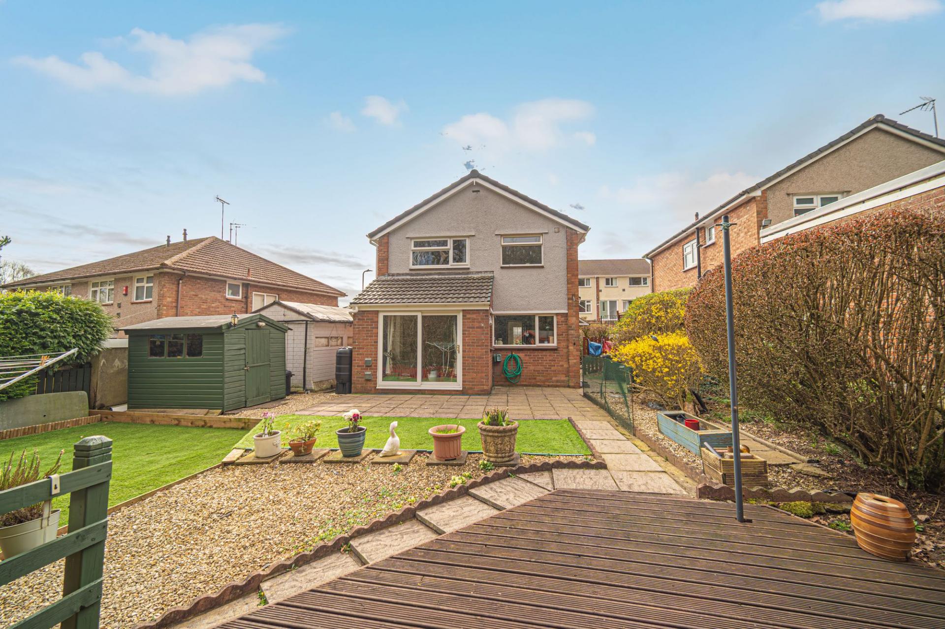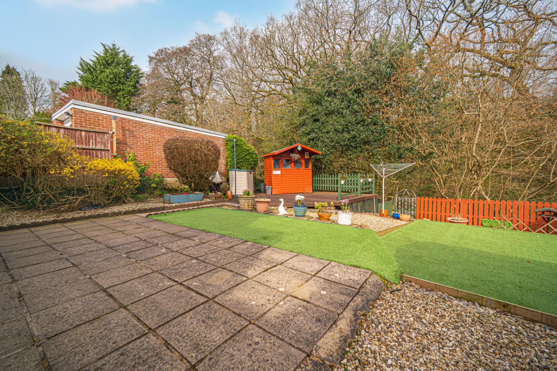 Stepping outside we have the garden, which is set on an impressive plot, with land extending past the fence line and down to the natural Brooke leading to the woodlands, offering an abundance of outdoor space for relaxing, enjoying various garden activities, as well as being perfectly suited for welcoming guests. The garden is also wonderfully low maintenance, while being comprised of a blend of several patio spaces, accented by pebble stone, turf lawn and a marvellous wooden deck, showcasing numerous spaces perfect for al-fresco dining and sunbathing. The garden is also home to a storage shed and a summerhouse cabin, which can both provide storage for garden furniture, while the latter can be utilised as a lovely garden retreat, or even be converted into a incredible bar. There is also a flat patio area at the bottom of the garden where children can play and enjoy sports, for keen gardeners to grow flowers or their own vegetables or even the possibility of a small studio or annexe which could be utilised as a gym, art studio , home business or extra living space, subject to planning permission (STPP) (No formal applications have been made).