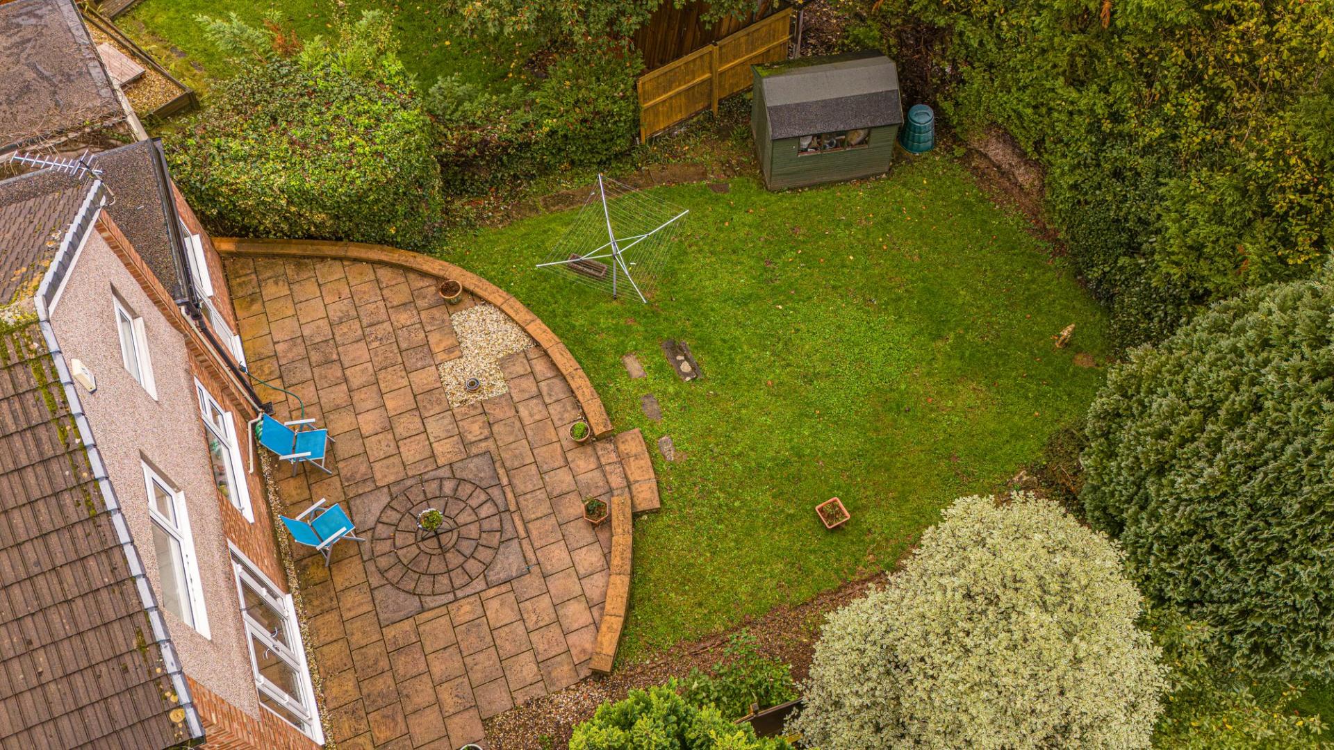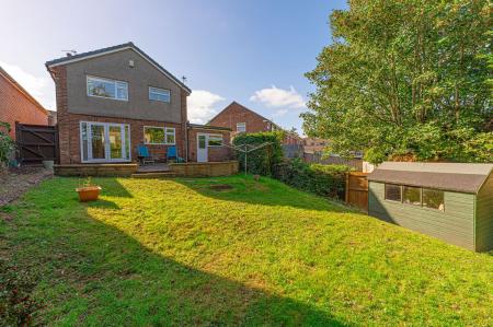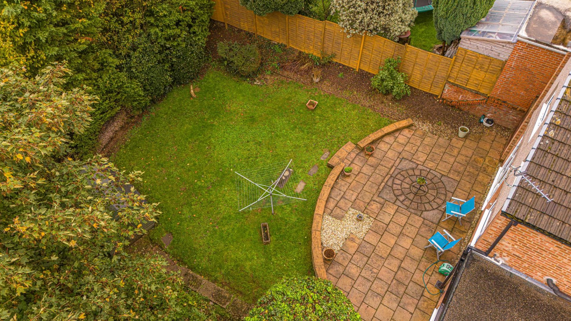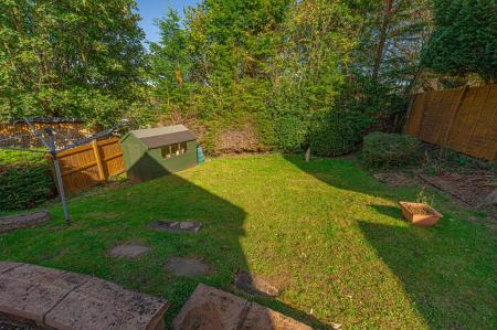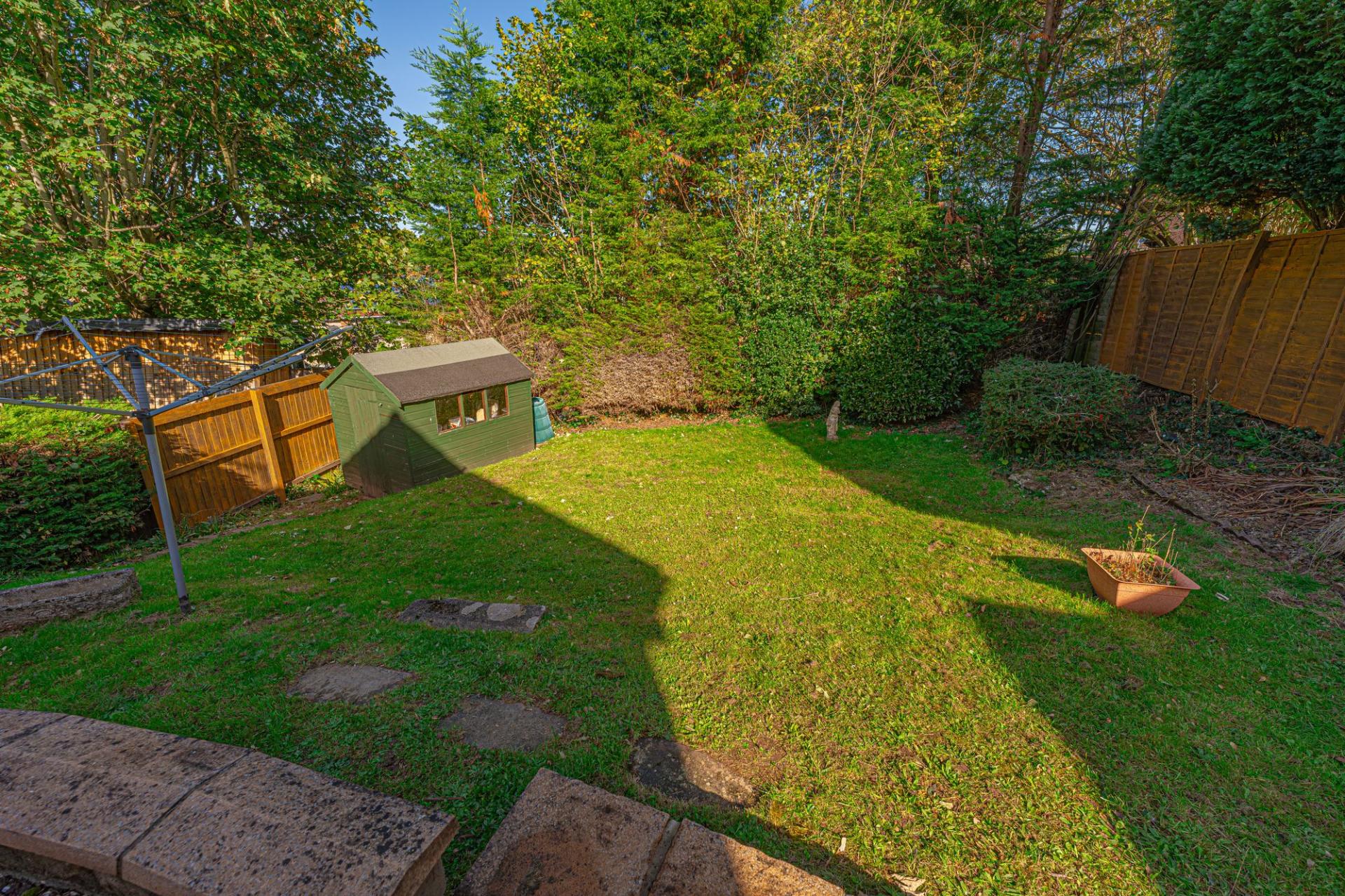 Stepping outside we arrive at the fully enclosed rear garden, which sits on a generously sized plot, with plenty of space to suit the whole family, while being perfect for entertaining guests. The garden consists of a large patio connected to the house - ideal for al-fresco dining and lounging, while a grass lawn extends beyond, where we can also find a useful storage shed.
