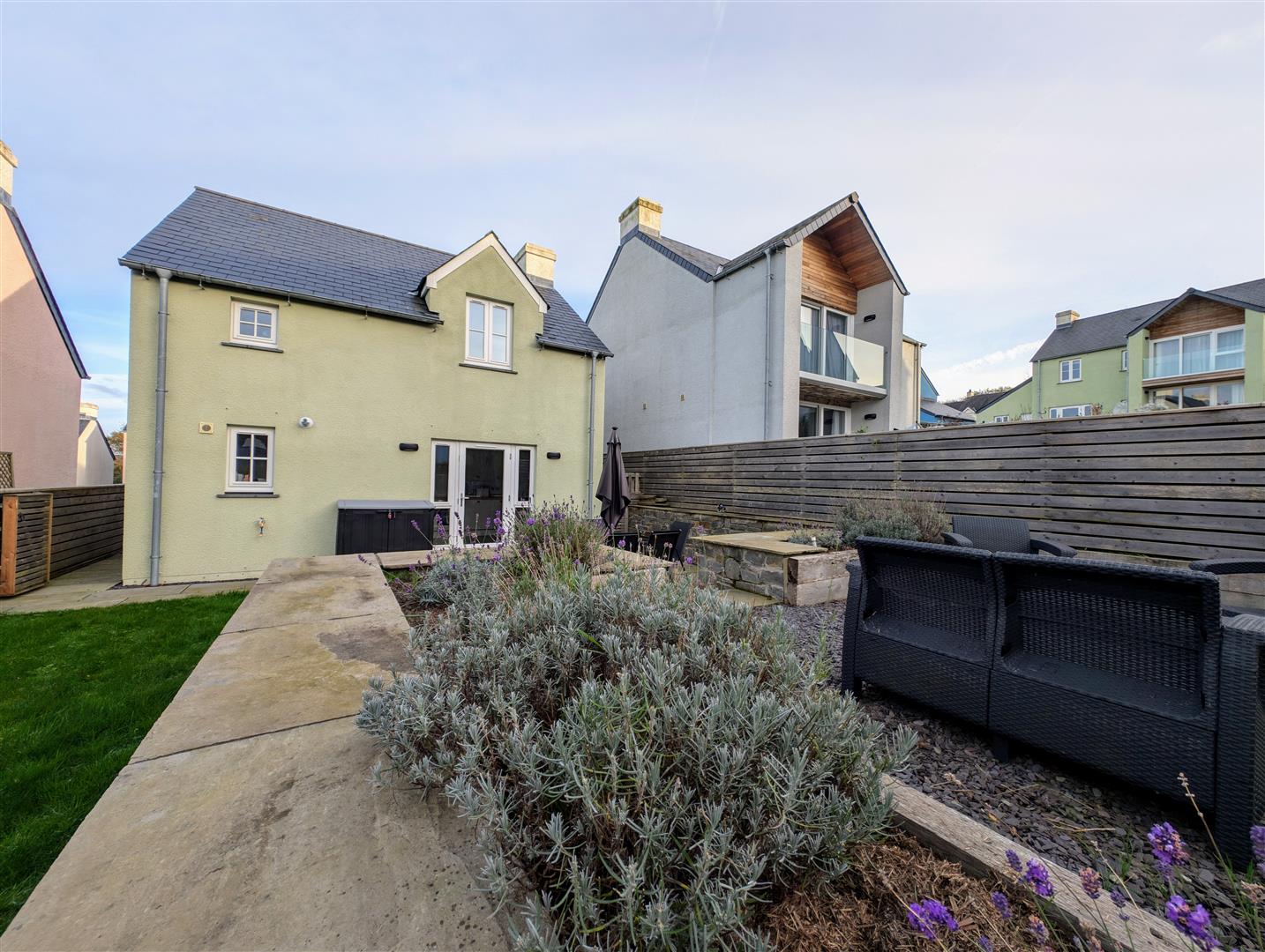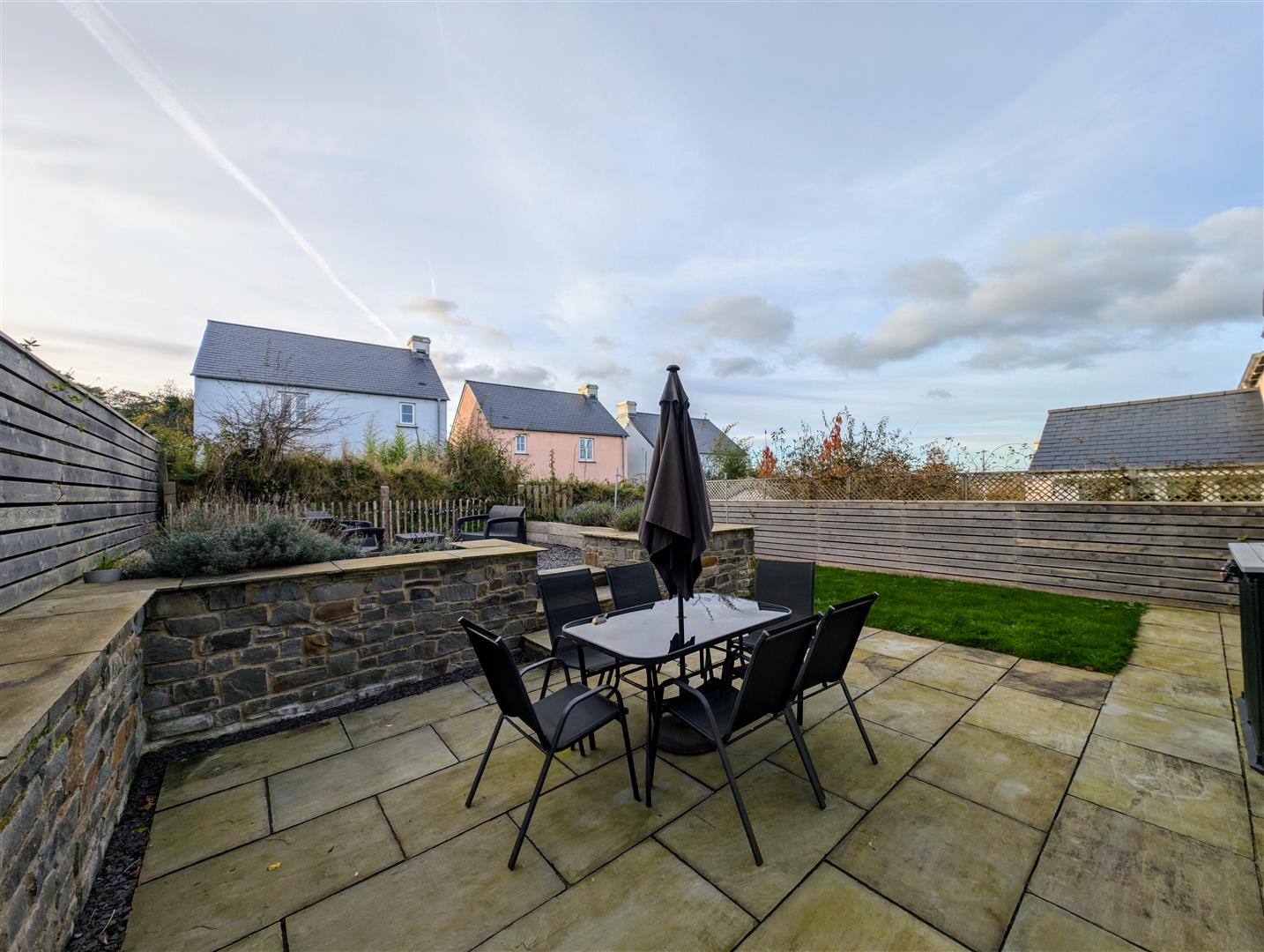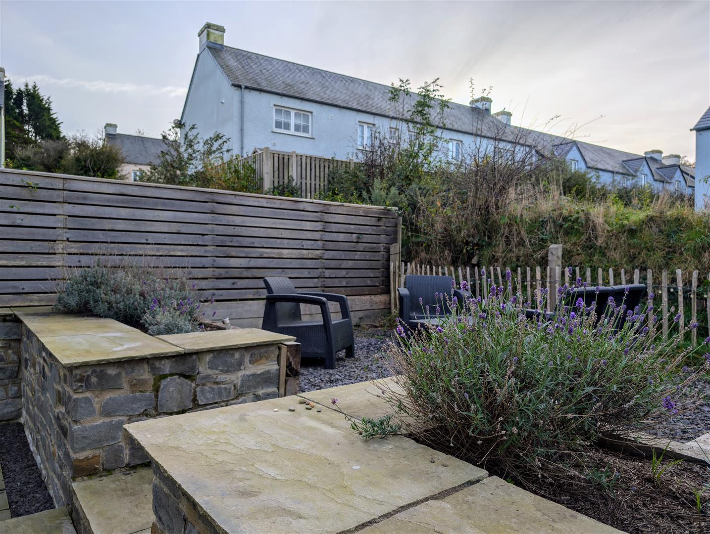- Easily maintained Gardens with Lawned Areas, Raised Slate Chip Beds and Indian Sandstone Paved Patios.