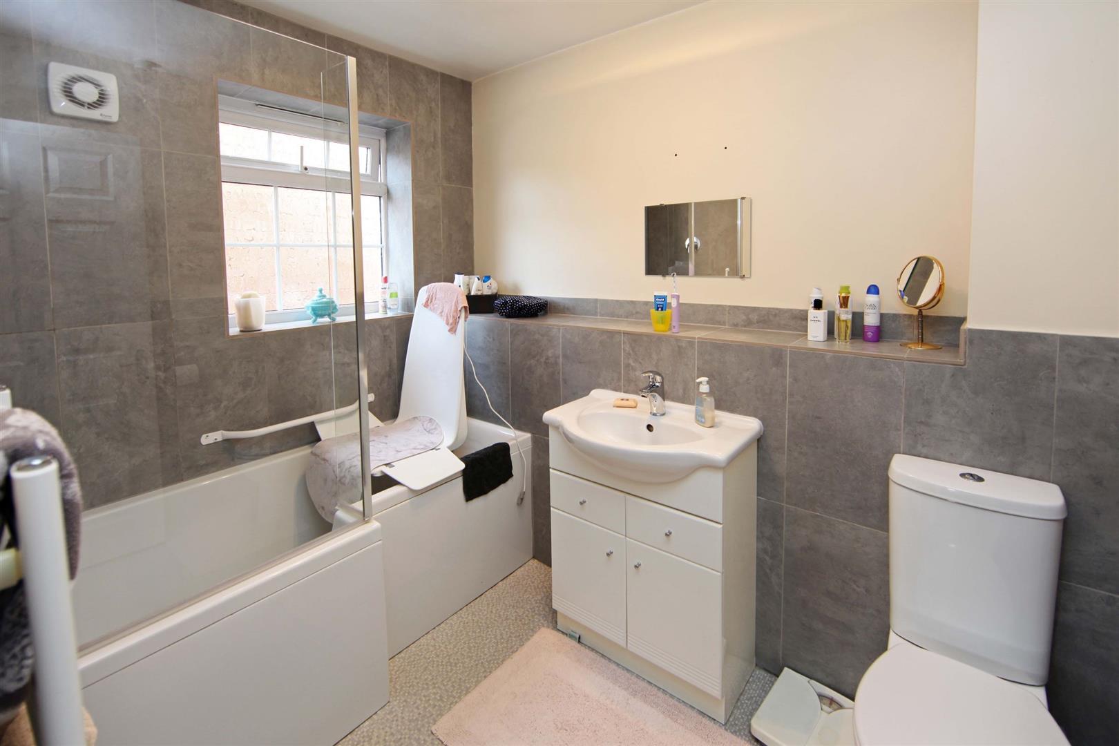 Modern Family Bathroom - P shaped bath with mains feed shower over. Low-level flush WC and wash hand basin with vanity cupboard below. Tower radiator. Half height wall-tiling and uPVC framed patterned double glazed window.