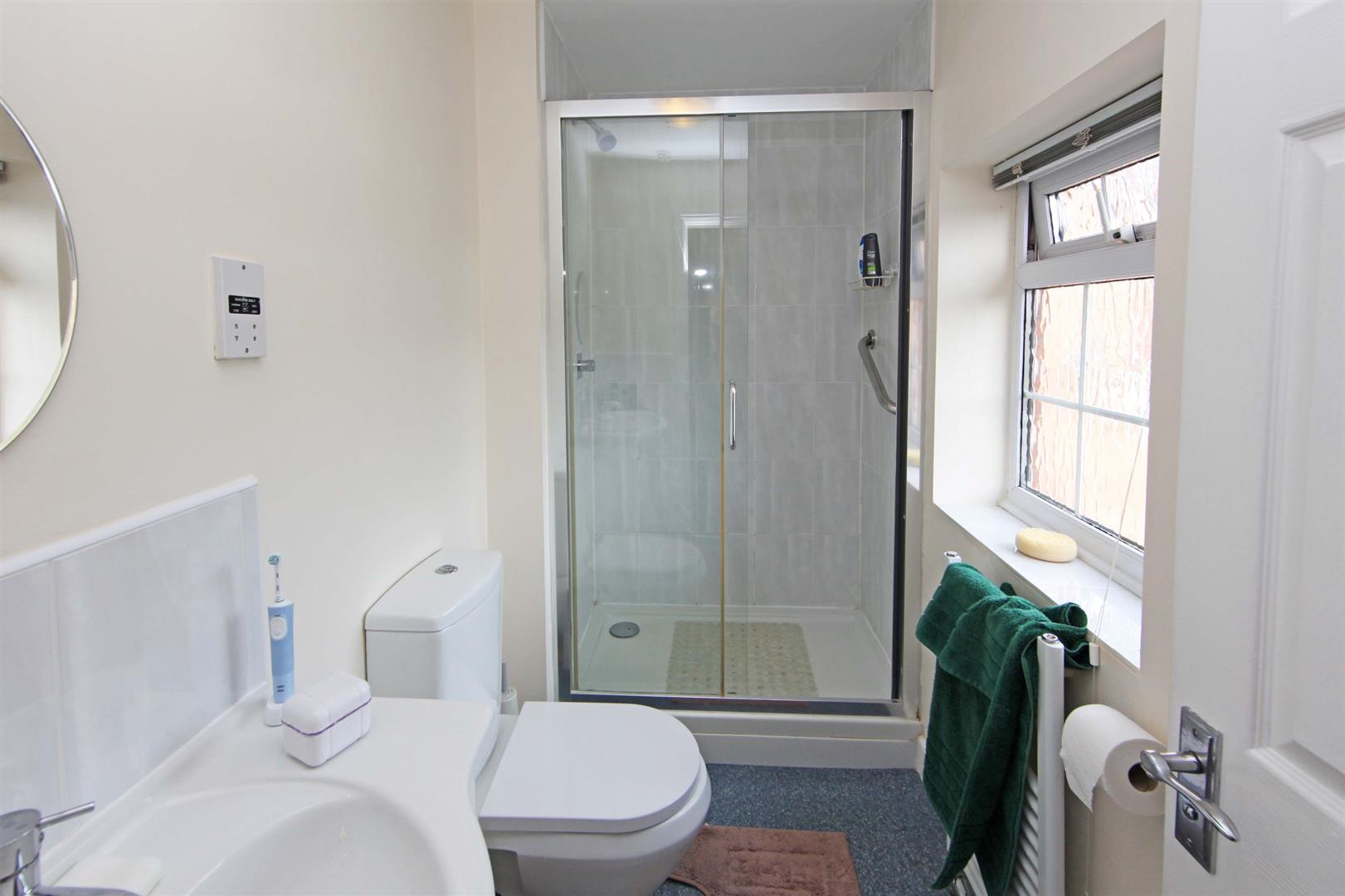 En-Suite - Tiled shower cubicle with mains fed shower. Low-level flush WC and wash hand basin with vanity cupboard below. Tower radiator. uPVC framed patterned double glazed window.