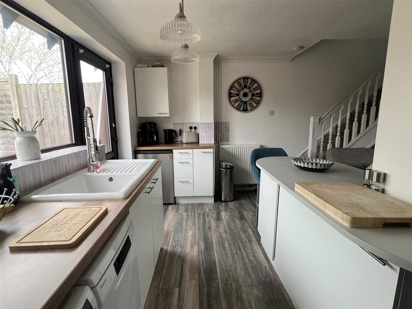 Kitchen - 4.43 x 1.91 (14'6" x 6'3") - Base and wall mounted units comprising cupboards and drawers with contrasting work surfaces over. Stainless steel sink with drainer. Space for cooker, washing machine, dryer and dishwasher. Combination boiler. Rear aspect double glazed window and courtesy door to garden.