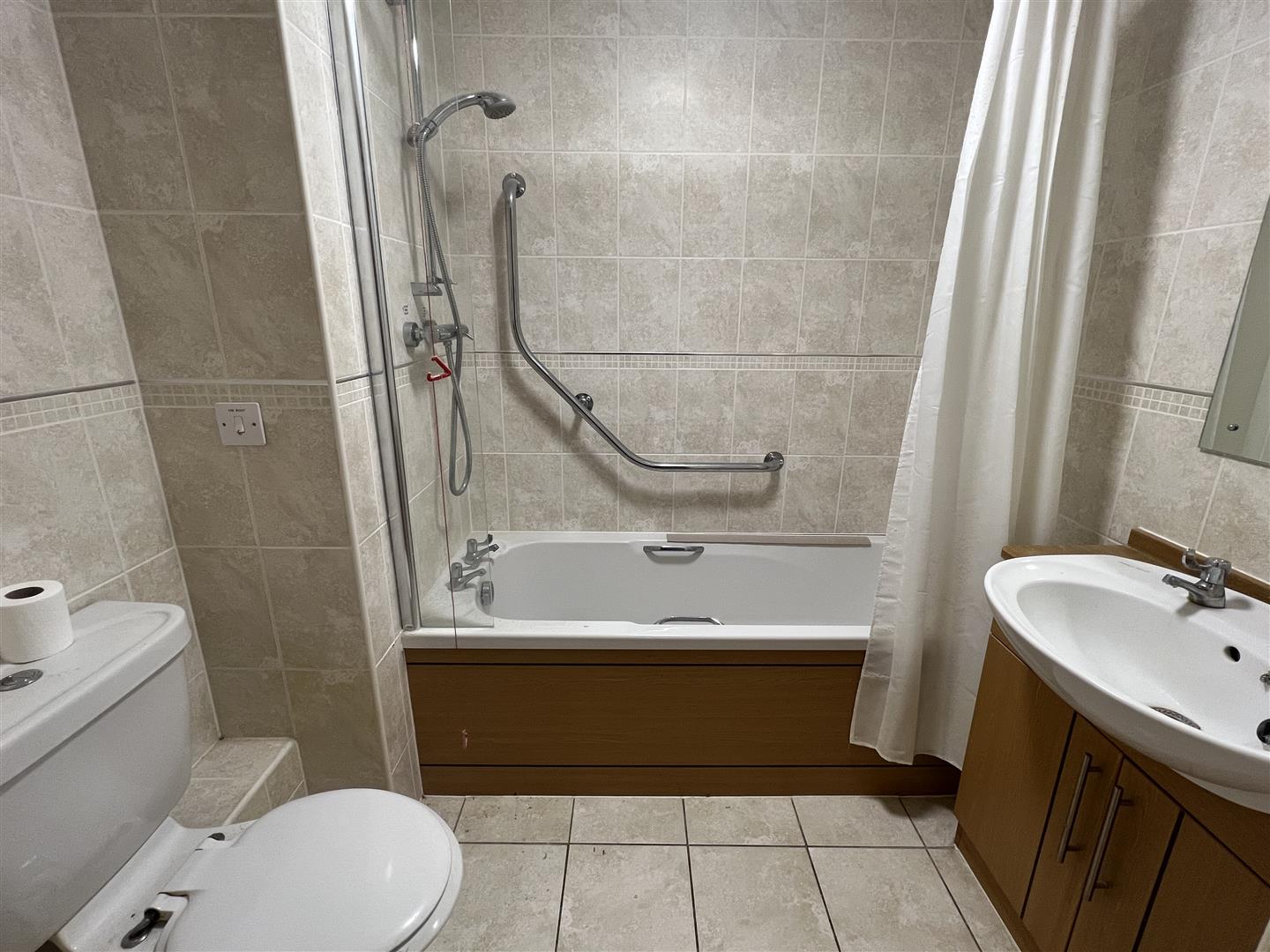 Bathroom - Being fully-tiled with bath having a mains fed shower head above. Wash hand basin with cupboard below and low-level flush WC.