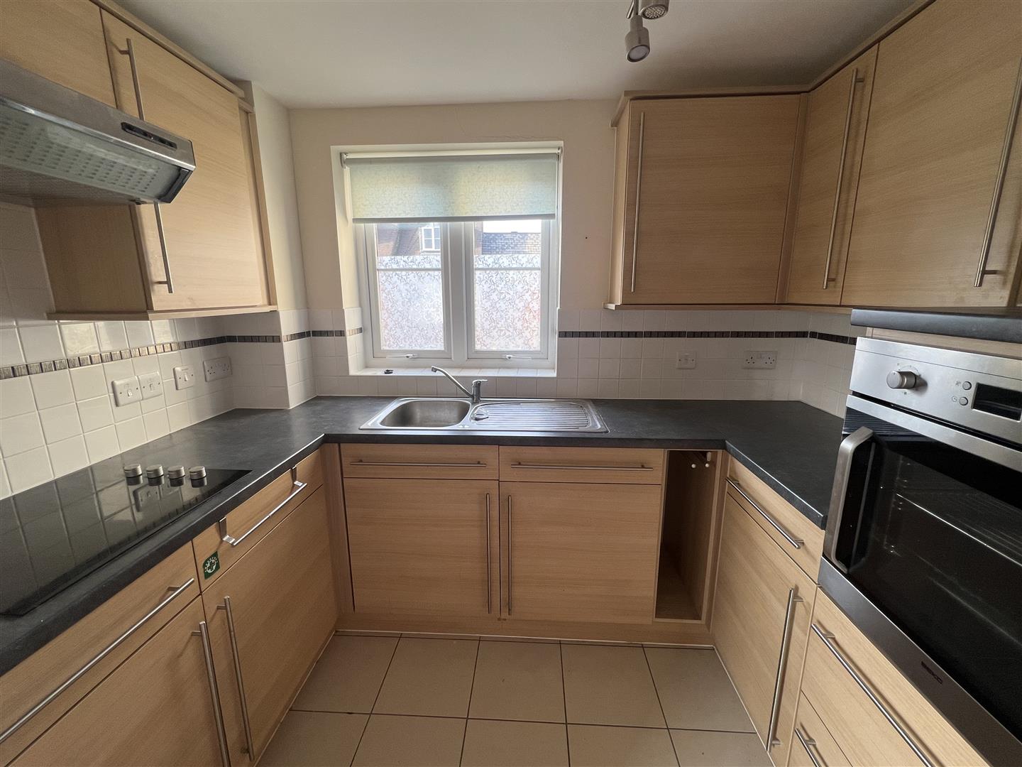 Fully-Fitted Kitchen - 2.64 x 1.86 (8'7" x 6'1") - Base and wall mounted units comprising cupboards and drawers with contrasting work surfaces above. Integrated oven, fridge and freezer. Separate ceramic hob with extractor fan above. Side aspect double glazed window.