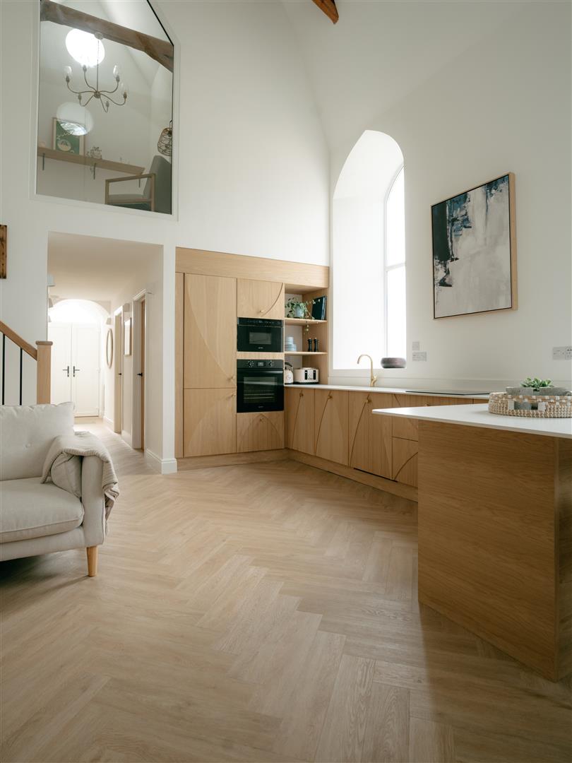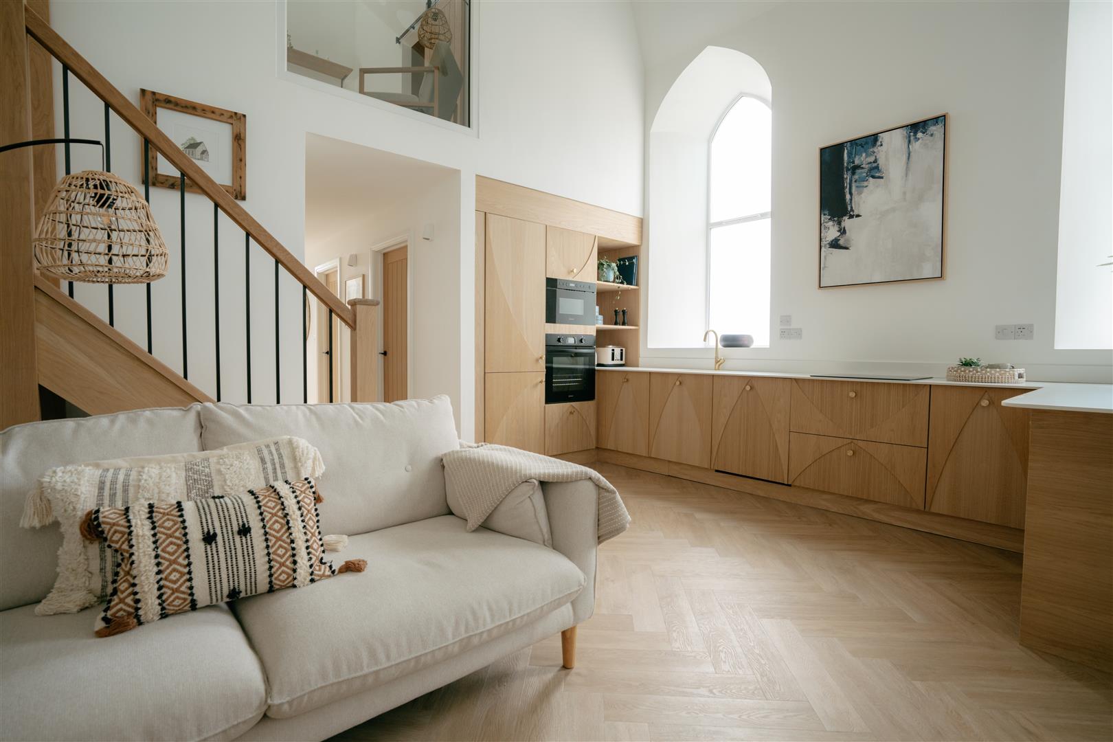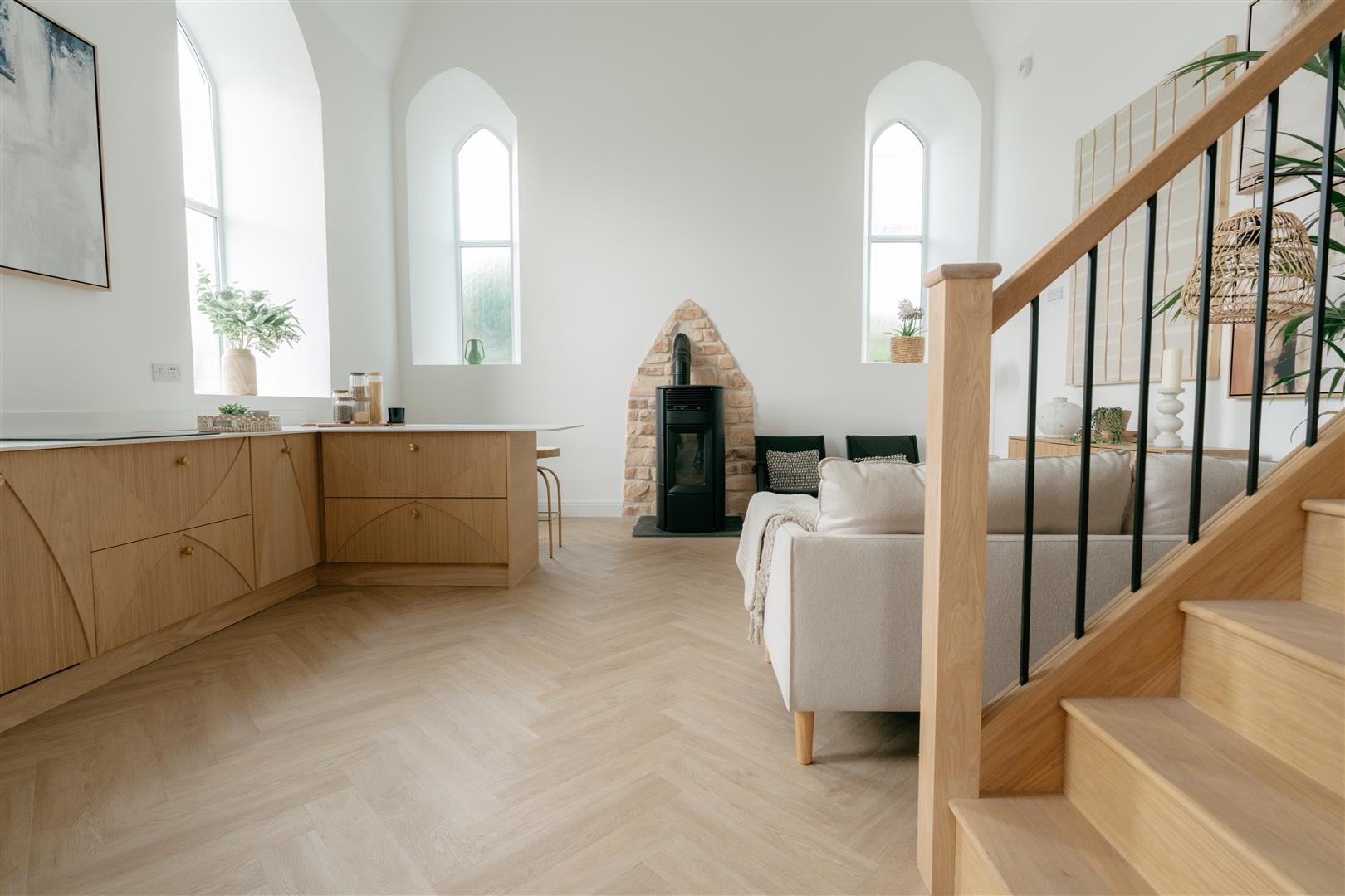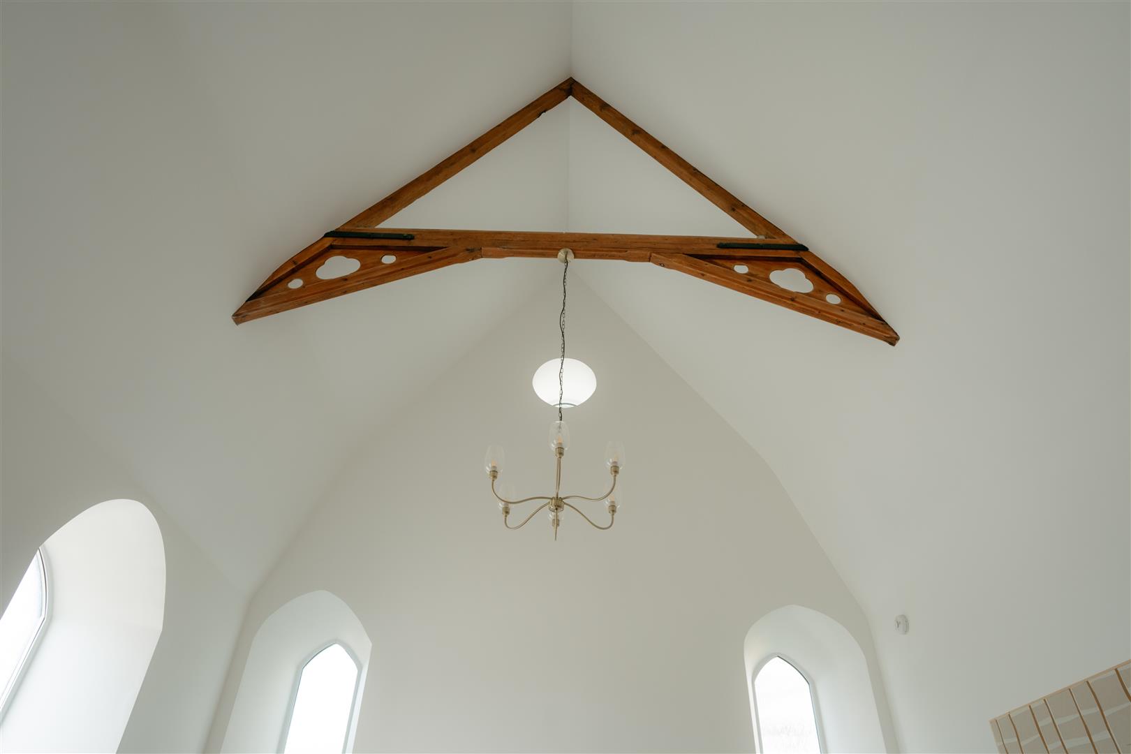 Open Plan Living Room - 5.20 x 5.44 (17'0" x 17'10") - This spectacular space is the heart of the property, filled with character whereby the charm of this Chapel, and its vast proportions, can be enjoyed completely. The vaulted ceiling showcases exposed roof trusses to which a chandelier has been suspended. The numerous point arched windows allow light to flood into the room accentuating the beautifully crafted oak kitchen and smooth contours of the structure, whilst providing all important privacy due to their frosted finish.