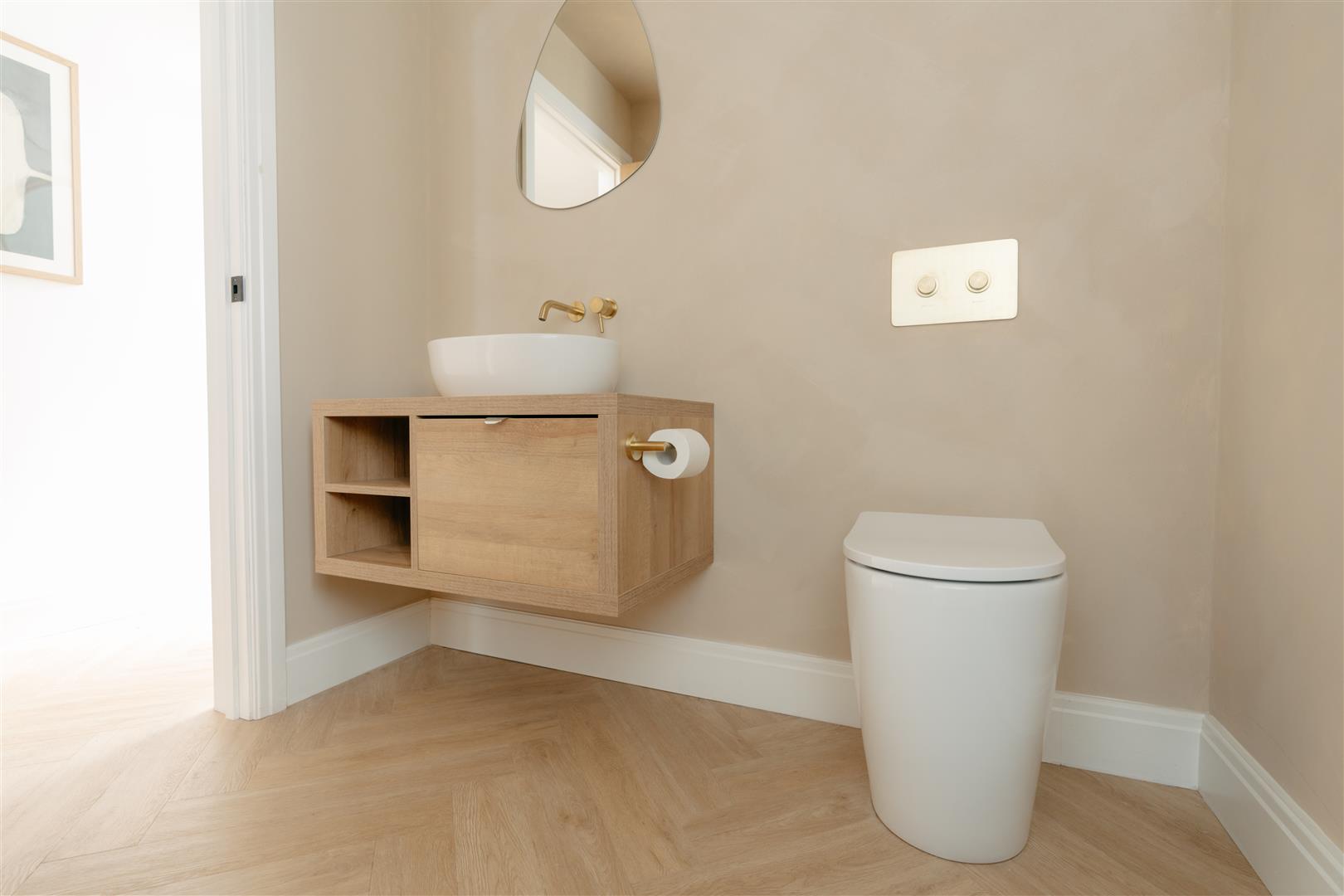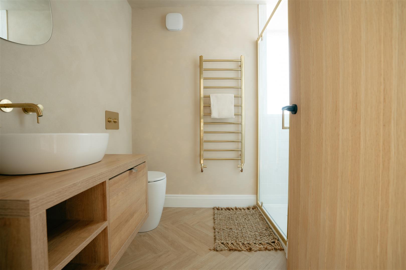 Shower Room - 2.18 x 1.89 (7'1" x 6'2") - Expertly finished downstairs shower room with overhead rainfall shower. White basin with gold tap over a 'floating' wooden storage unit. Matching white WC. Gold fixtures and wall mounted heated towel rail.