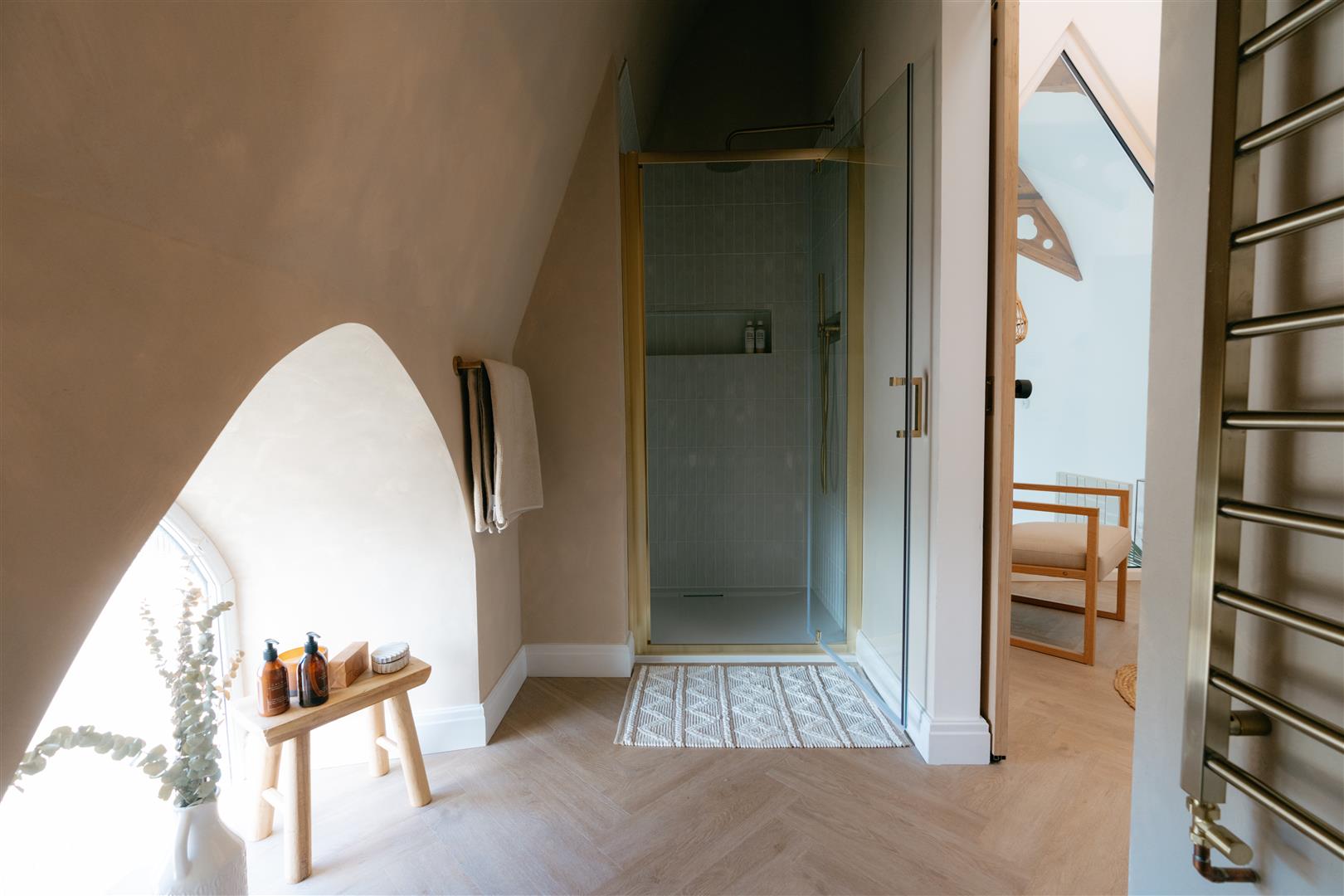 En-Suite - 3.77 x 1.24 (12'4" x 4'0") - An indulgent shower suite with overhead rainfall shower with tiled surround and inset shelf. A characterful window allows light into the suite. White WC and hand wash basin with mixer tap and storage to the side. Gold fixtures and fittings.