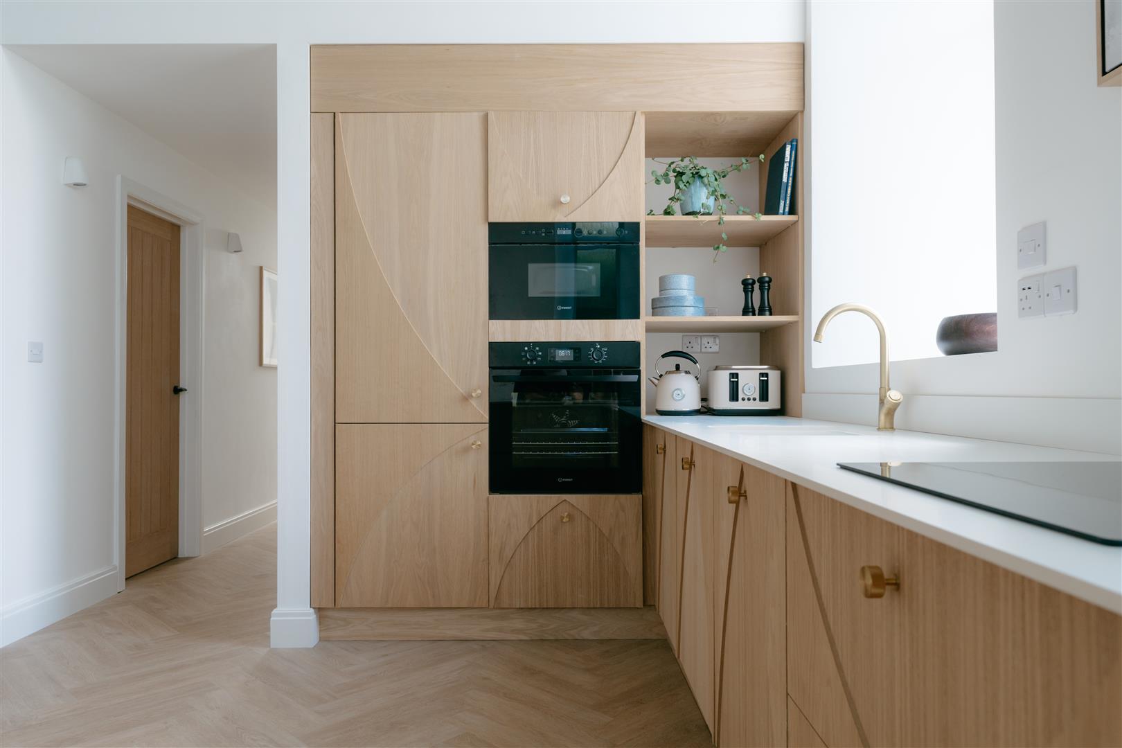 The kitchen has a unique carved design incorporating an array of base level units, providing ample storage in addition to a built in fridge/freezer and tower style oven/microwave. Gold mixer tap over an undermount sink. Induction hob with Quartz white worktop with matching splashback. The kitchen also benefits from a sociable breakfast bar.