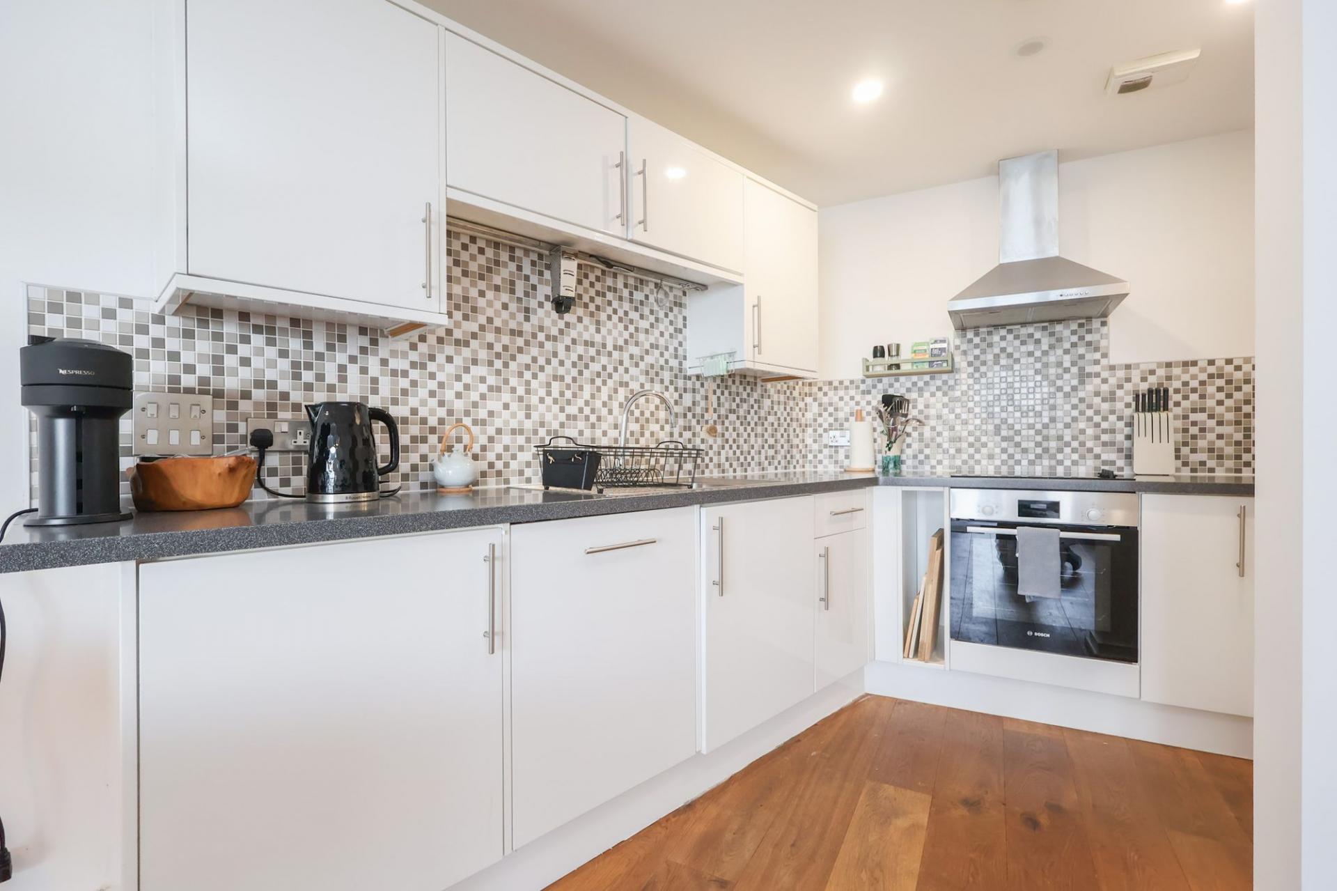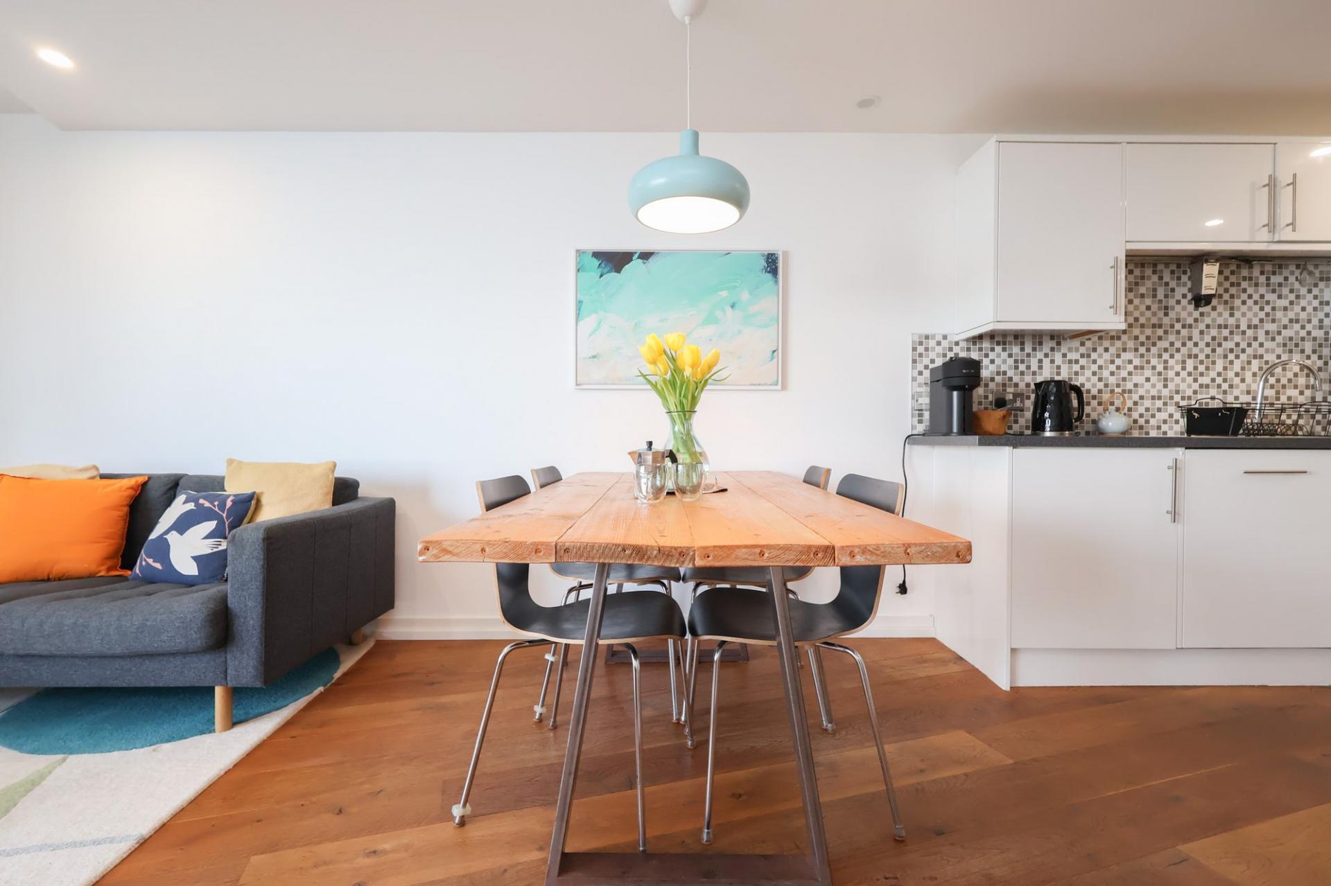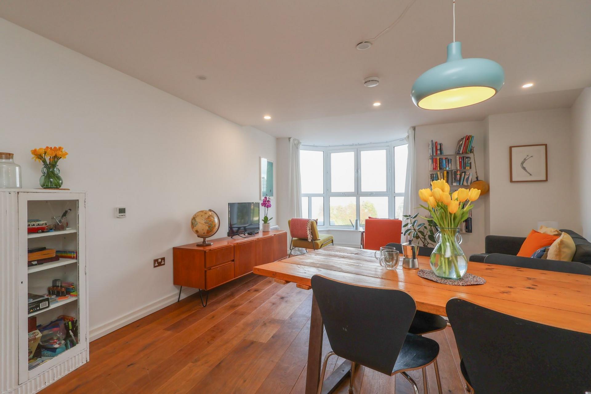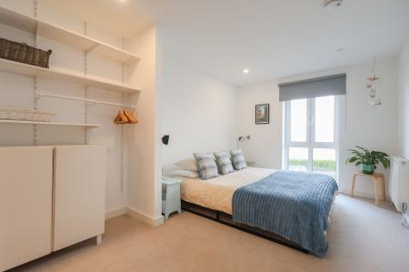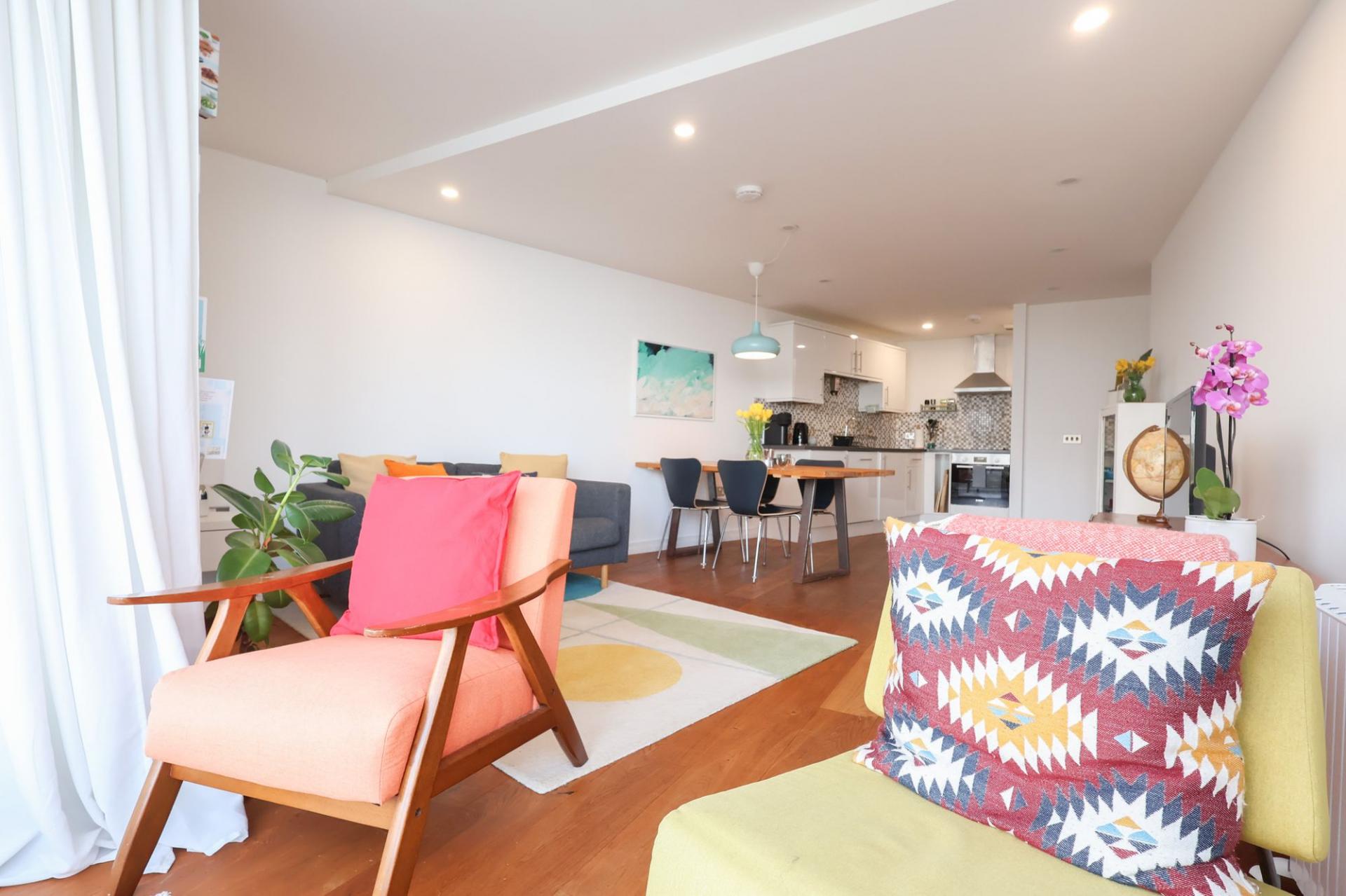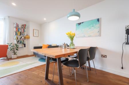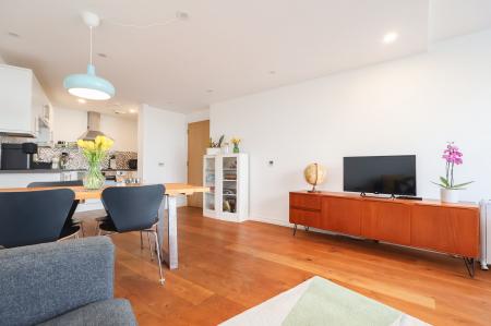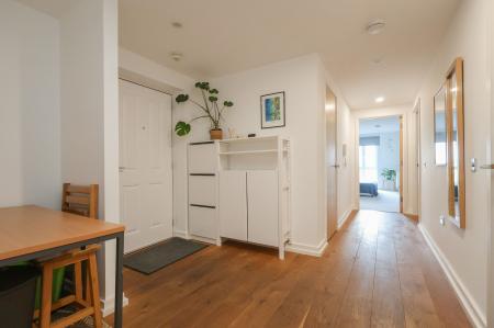 Entering into the apartment, a large, and inviting hallway has fitted storage and gorgeous oak flooring which is continued into the main living space.