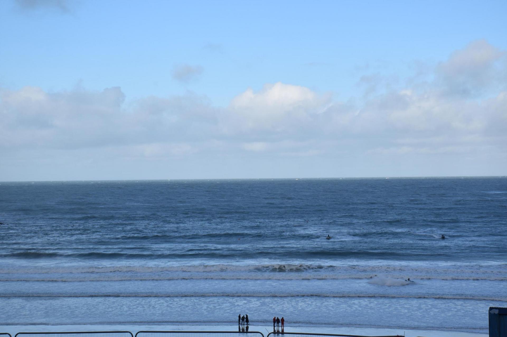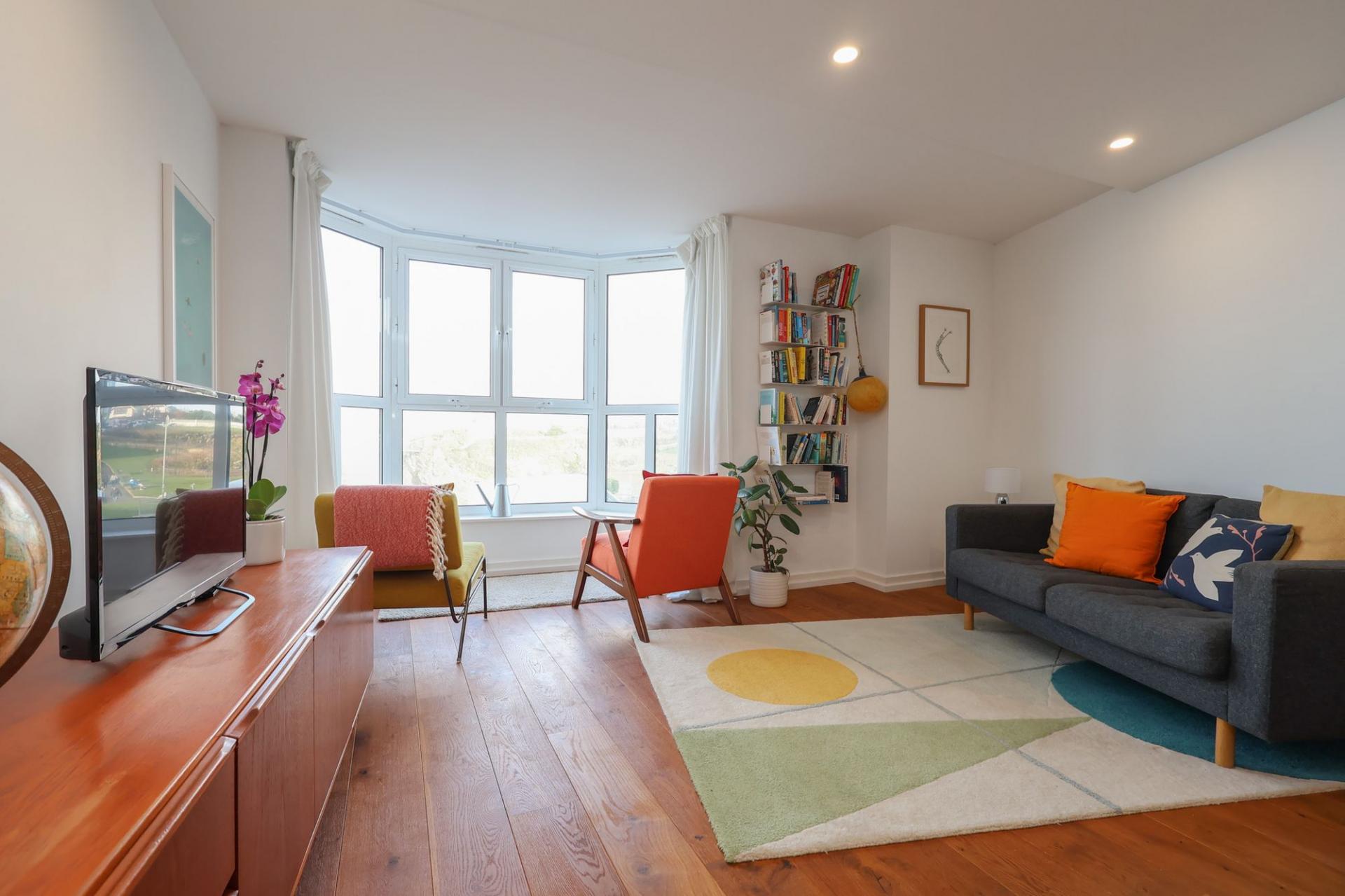 A STUNNING FLOOR LUXURY APARTMENT WITH UNINTERUPTED SEA AND COAST VIEWS OVER TOWAN BEACH, NEWQUAY HARBOUR AND THE ICONIC ISLAND. TWO DOUBLE BEDROOMS, TWO BATHROOMS.