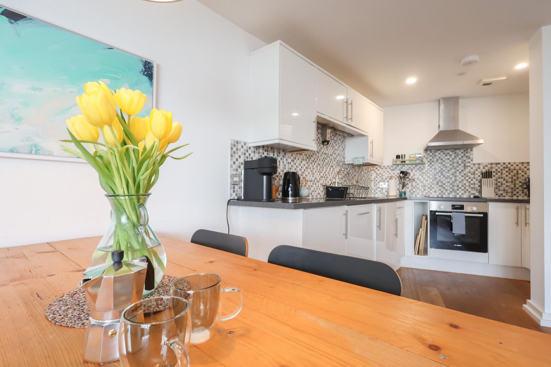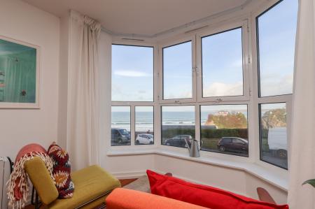 The living space looks to the front with large bay windows taking in the very best of the gorgeous views, a fantastic open plan room with ample space for living and dining furniture with a neat, modern kitchen fitted towards the rear. The kitchen has white units, co ordinating work surfaces and a full complement of integrated appliances.