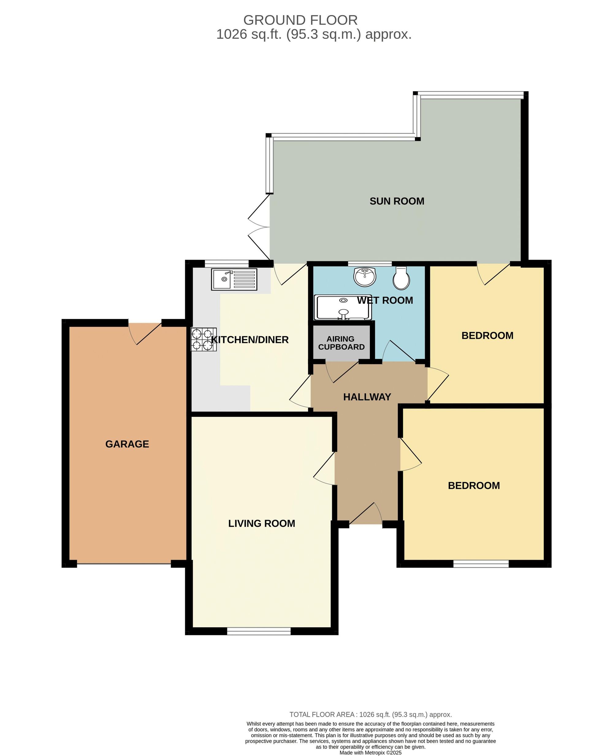 Further along the hallway, there is a modernized wet room bathroom, a second double bedroom, and a well-equipped kitchen. However, the true highlight of this home is the impressive 18-foot sunroom, which spans the length of the property. This versatile space serves as an additional reception area, perfect as a dining room or a second sitting room to enjoy views of the sun-soaked garden beyond. Thoughtfully designed, it also functions as a wraparound space, accessible from both the kitchen and second bedroom for added convenience.