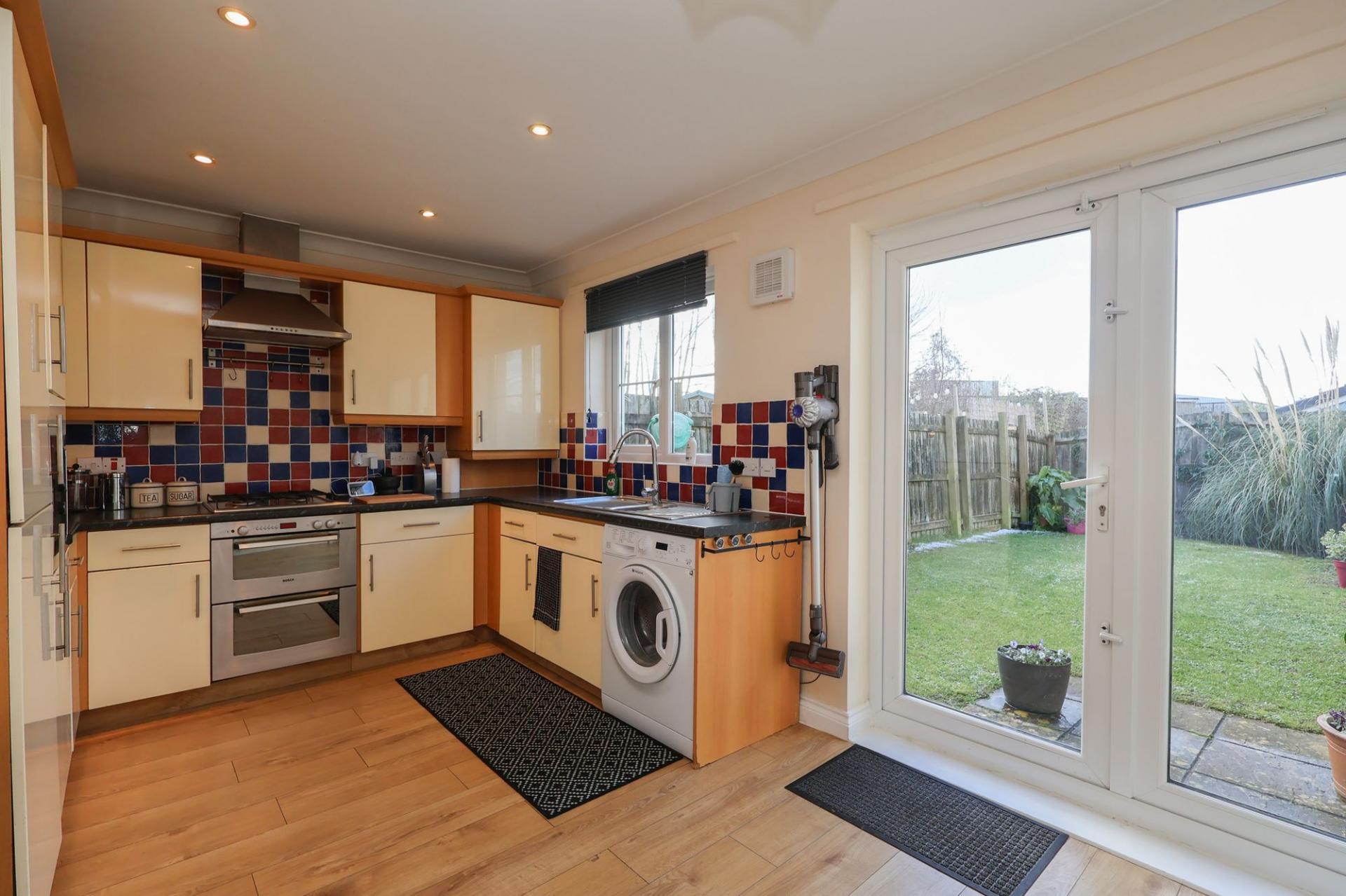 Spanning the full width of the rear of the property, the kitchen/diner is a standout feature. French doors open directly onto the south-westerly facing garden, flooding the space with natural light and creating an excellent indoor-outdoor connection. The kitchen is fitted with a range of sleek gloss wall and base units with complementary worktops and a stainless-steel sink. Integrated appliances include a double oven with gas hob and extractor hood, dishwasher, fridge freezer and grill, with space provided for a washing machine. A wall-mounted combi boiler is also housed here. The room comfortably accommodates a dining table and benefits from a useful understairs storage cupboard.