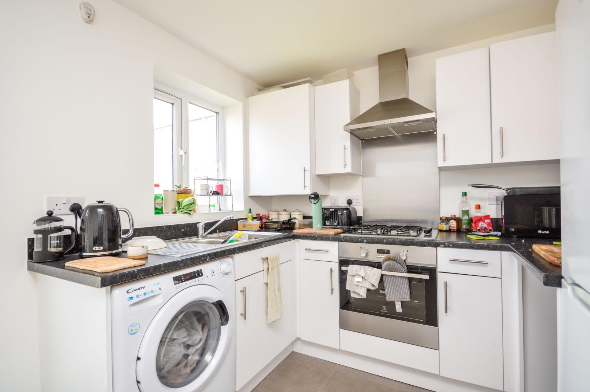 The ground floor features a large, welcoming living room with soft carpeting and neutral décor, creating a calm and inviting space to relax. The bright and airy kitchen/diner is fitted with sleek white units and integrated gas hob and electric cooker, and a freestanding fridge/freezer. French doors open directly onto a private garden.