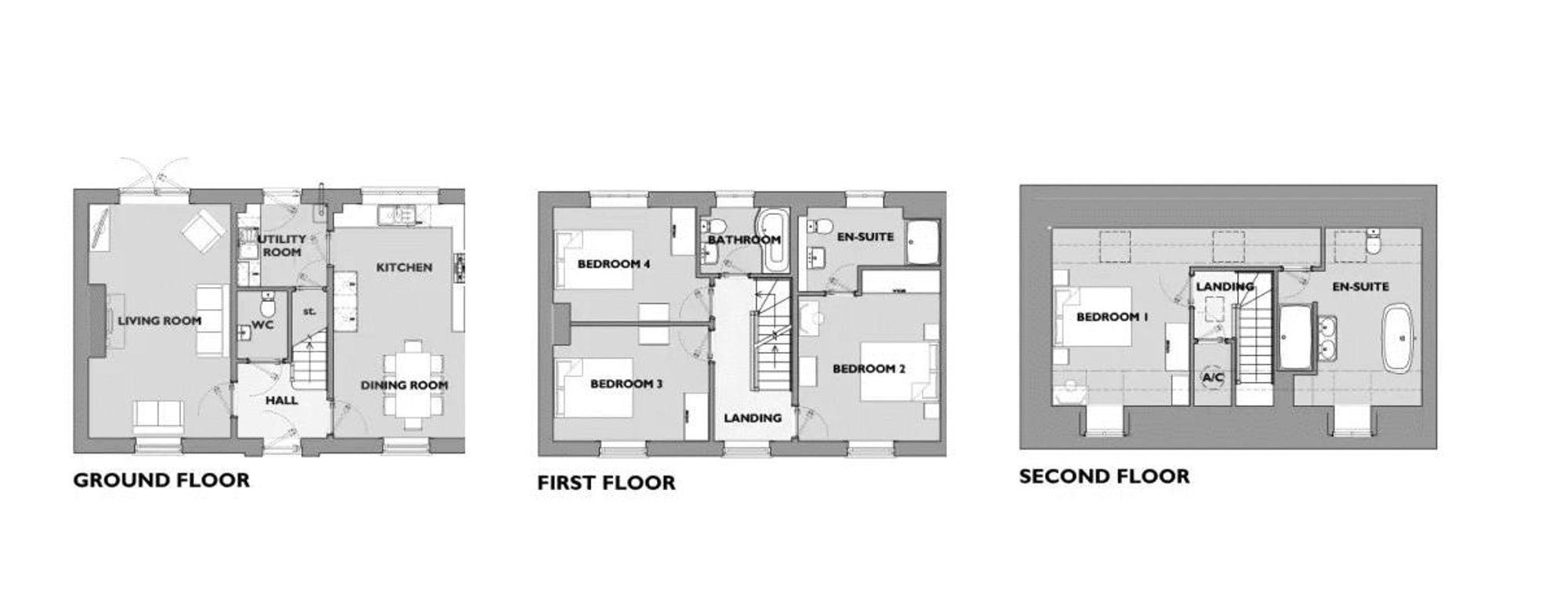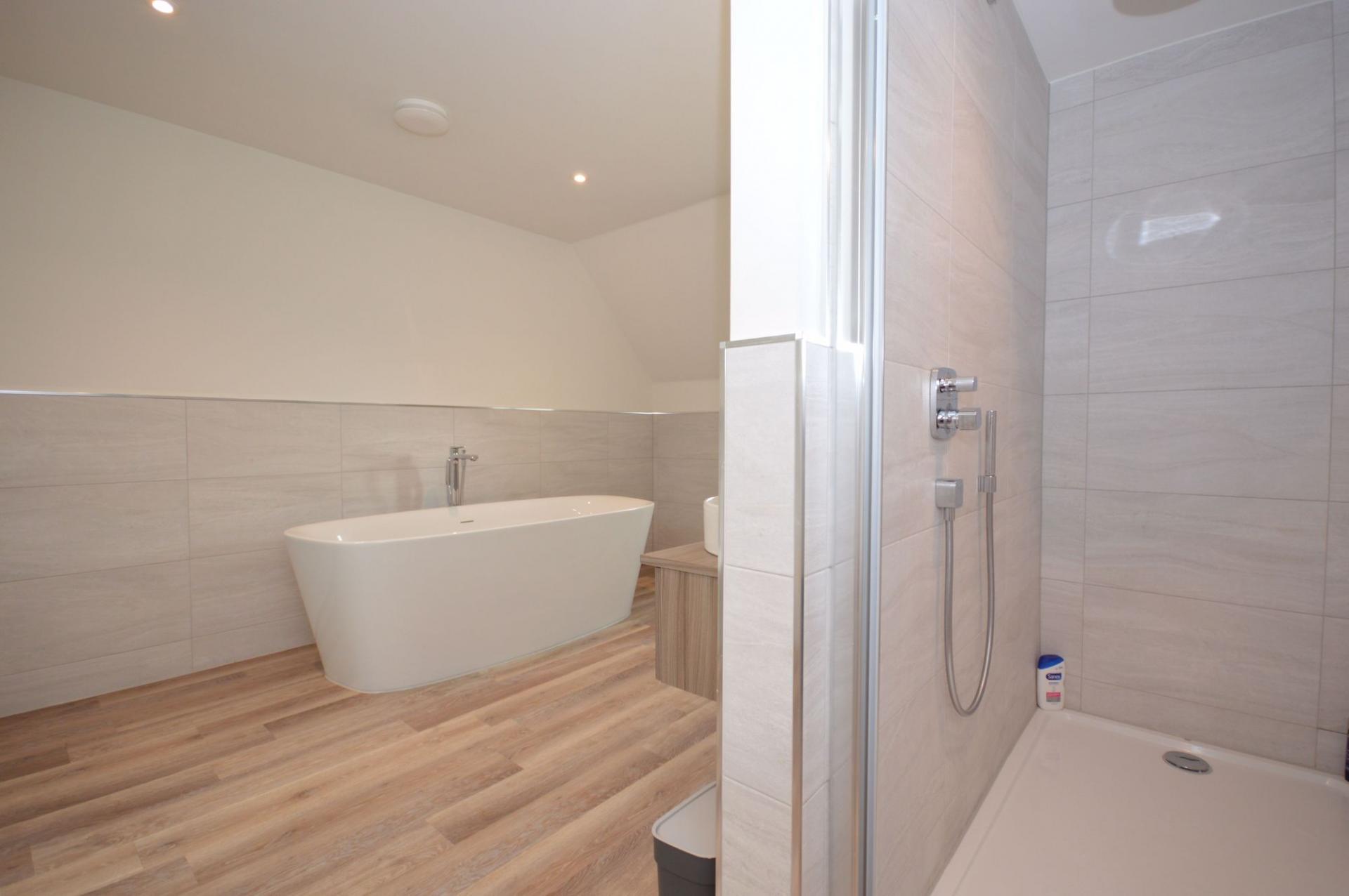 Heading back to the hallway and up the stairs to the first floor, you will find an immaculately finished family bathroom. With part-tiled walls, a modern white bathroom suite, and a p-shaped bath complete with a mains-fed shower overhead, this space is both stylish and functional. The first floor also houses three generously sized double bedrooms, one of which benefits from its own private ensuite. This ensuite is finished to an exceptional standard, featuring a built-in double shower cubicle with a luxurious mains-fed shower.
