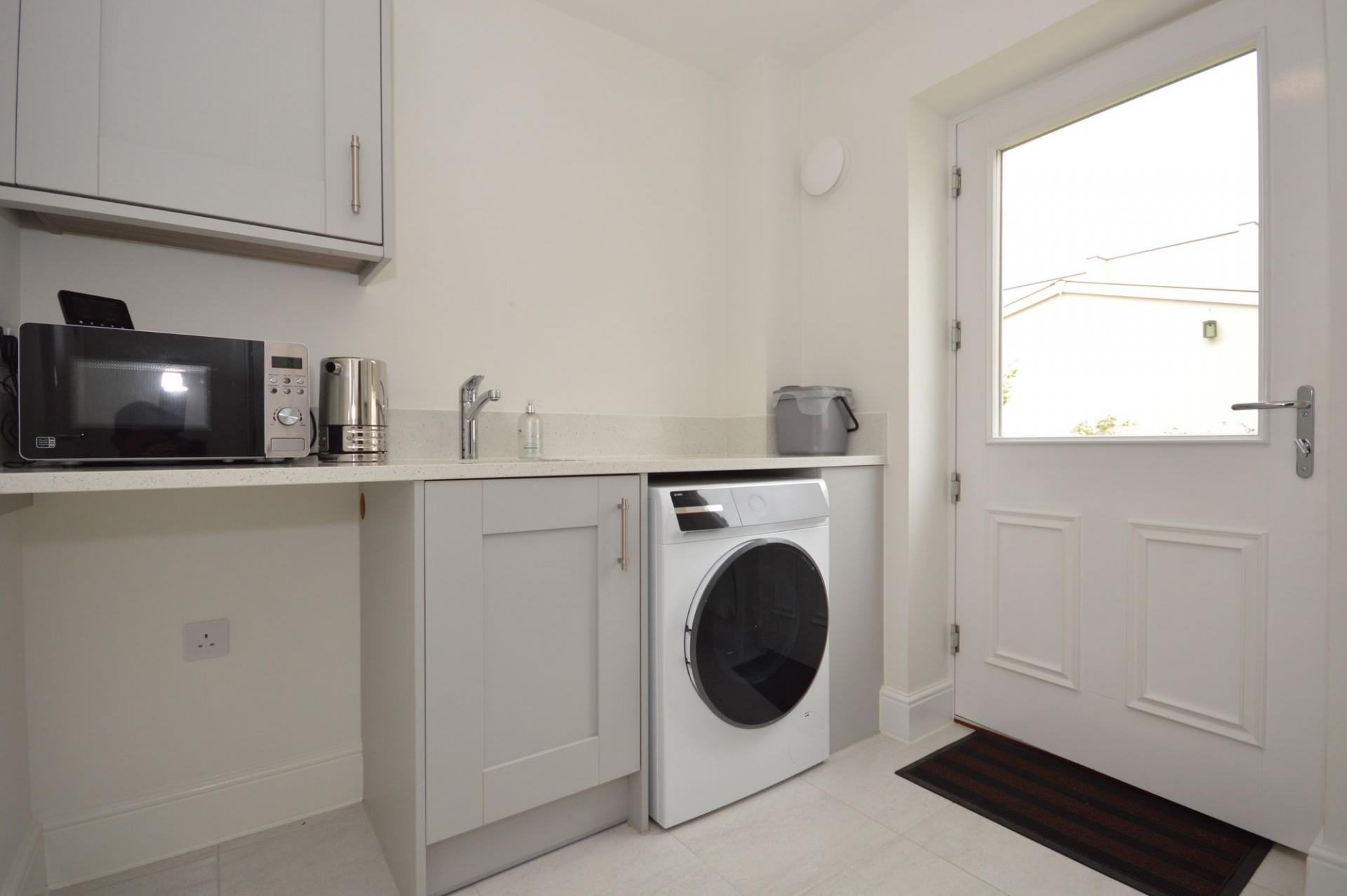 Adjacent to the kitchen is a separate utility room that continues the high-quality design. With matching quartz worktops and an abundance of additional cabinetry, this space provides practical solutions for storage and laundry needs. There’s also room for extra white goods, and a pedestrian door offers direct access to the rear garden.