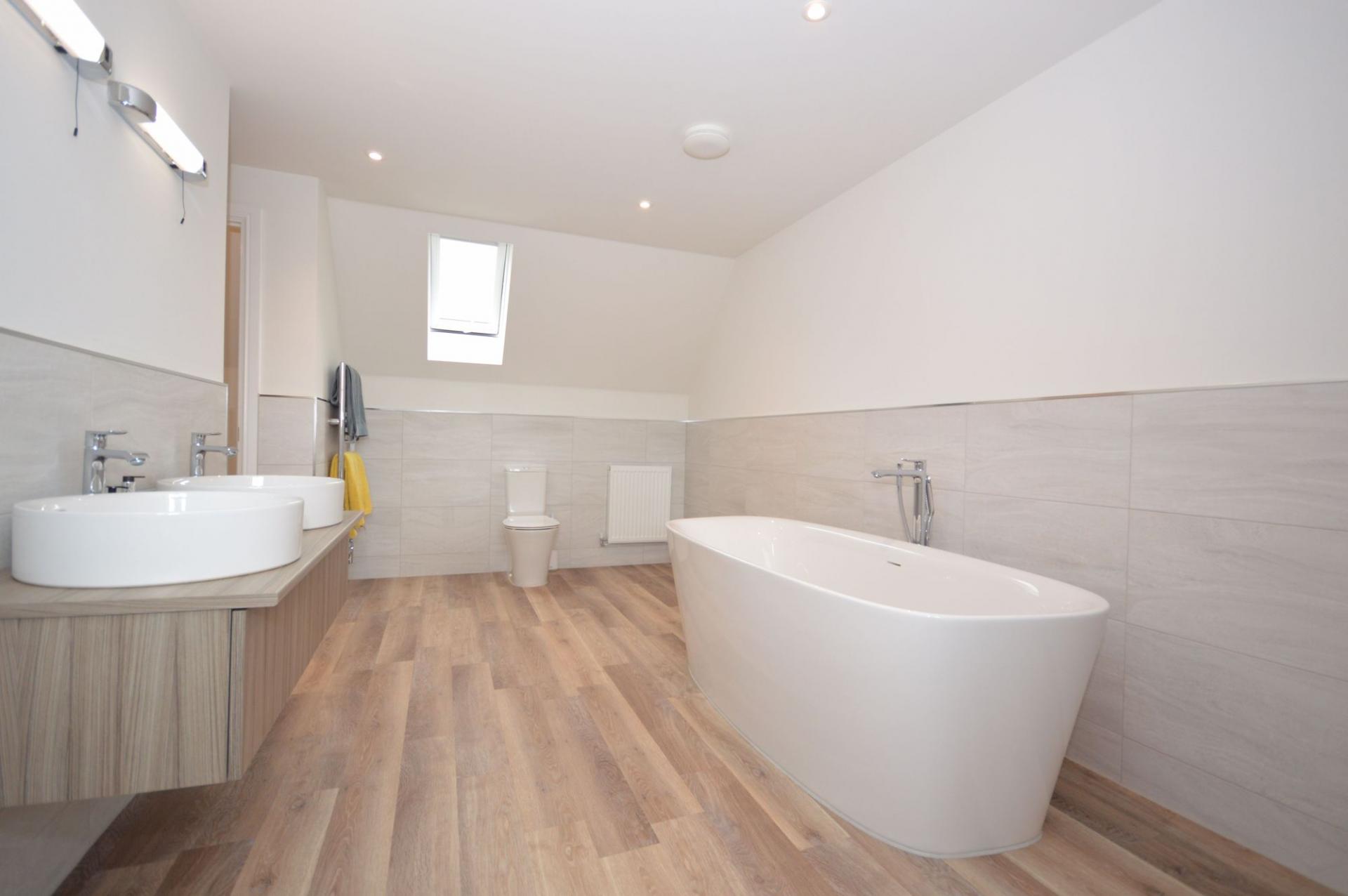 Continuing to the second floor, the master suite awaits, offering the ultimate in privacy and luxury. This vast bedroom occupies most of the top floor and provides far-reaching views to the front of the property. There is ample room for a range of large bedroom furniture, making it a serene and spacious retreat. The highlight of this space is the opulent ensuite bathroom, which spans over 14 feet in length. It includes both a double walk-in shower and a freestanding roll-top bath, perfect for unwinding after a long day. Dual floating wash hand basins add to the sense of luxury, making this bathroom not just a practical space, but a true sanctuary.