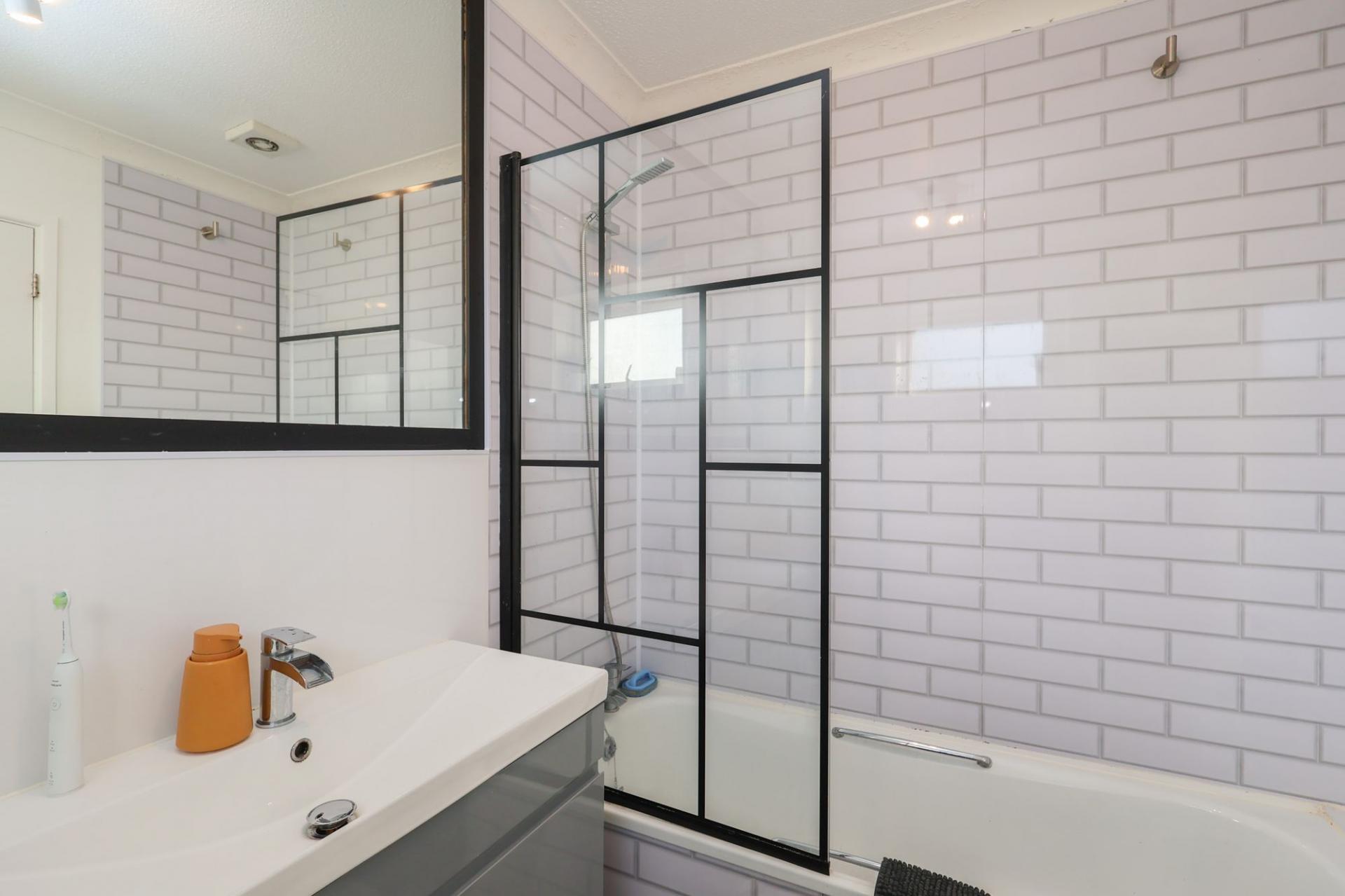 - CONTEMPORARY WHITE BATHROOM WITH SHOWER OVER BATH