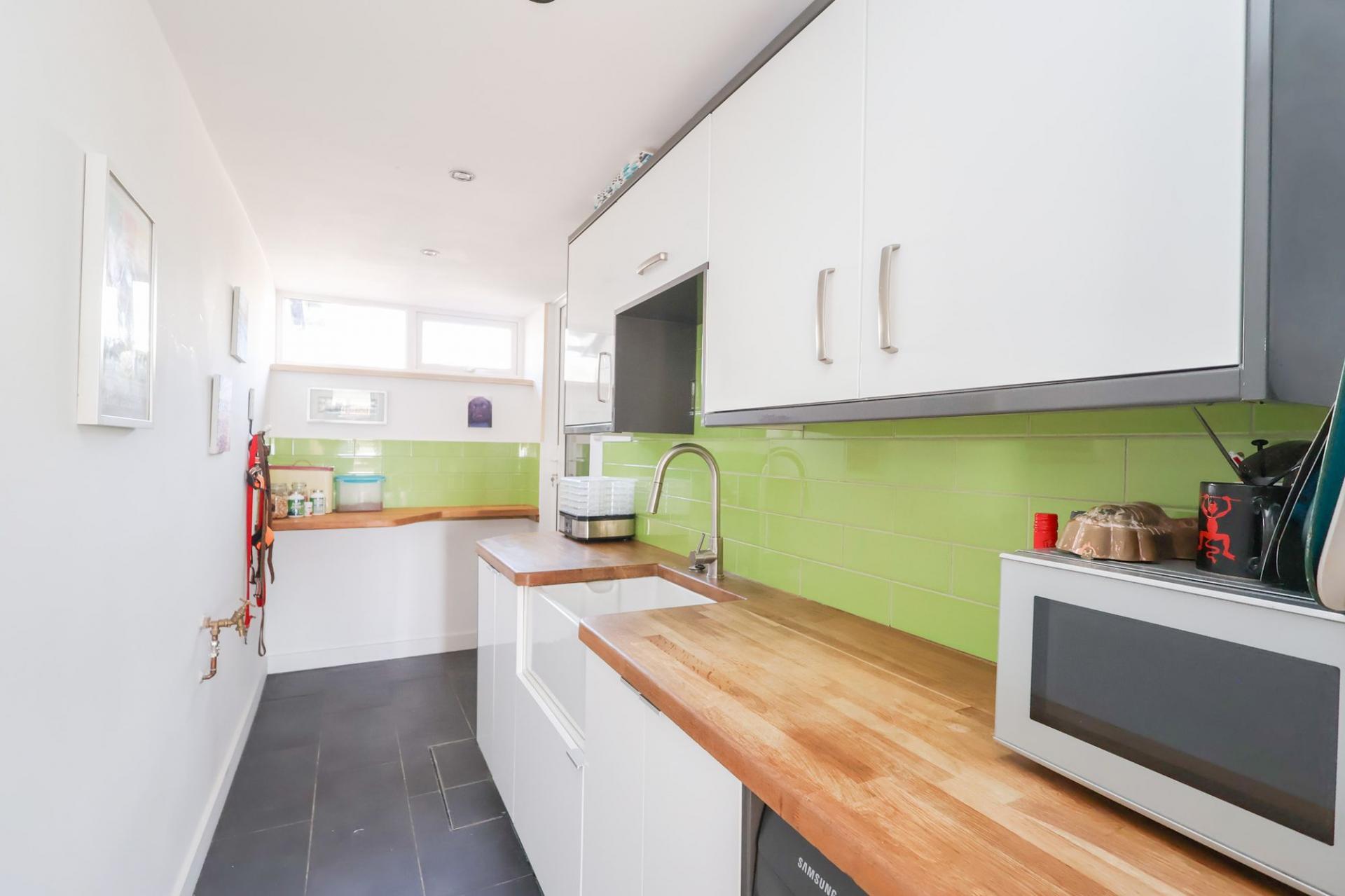 - ROYAL BLUE KITCHEN WITH WALNUT-TOPPED ISLAND UNIT