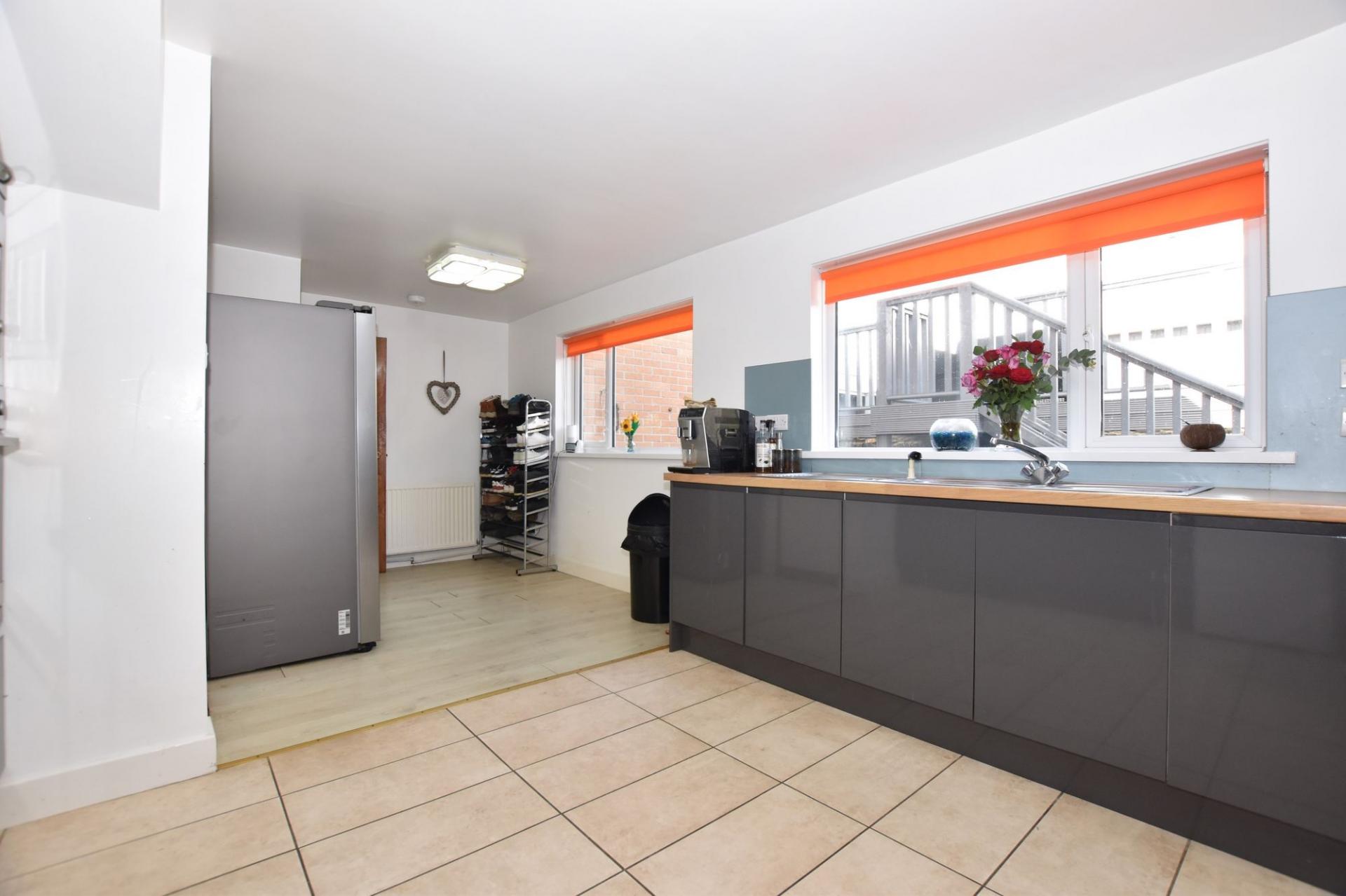 The heart of the home is the impressive 20-foot kitchen/diner, designed for modern living. It boasts a sleek and contemporary range of grey gloss units, complemented by an integrated eye-level oven. There is ample space to accommodate a large dining table, making it a perfect space for family meals and entertaining. A large rear-facing window allows for an abundance of natural light and offers pleasant garden views.