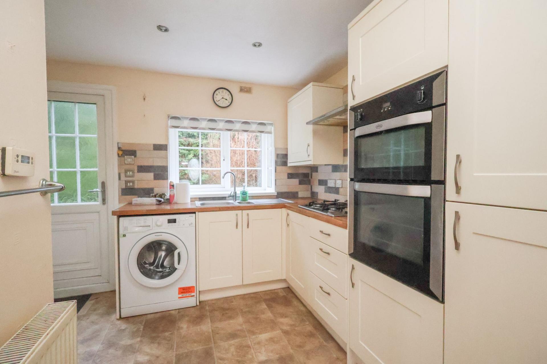 Filtering off from the lounge/diner is the kitchen fitted with a modern cream shaker kitchen, having oak style work surfaces and tiled splashbacks. There is an integrated eye level double oven, hob, extractor, back door access, and large airing cupboard.