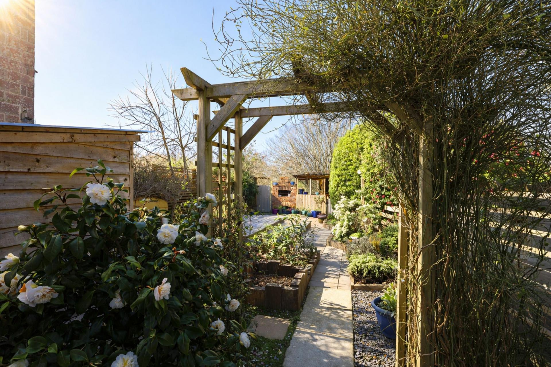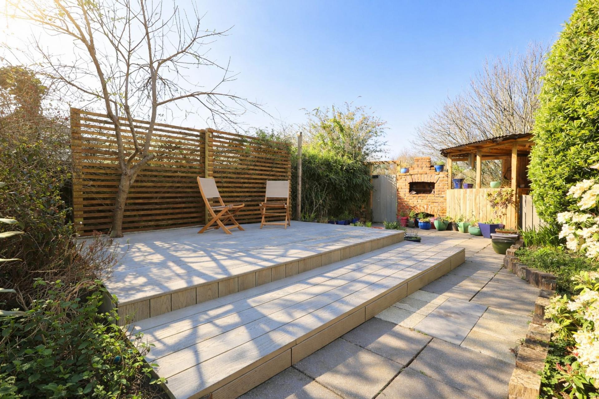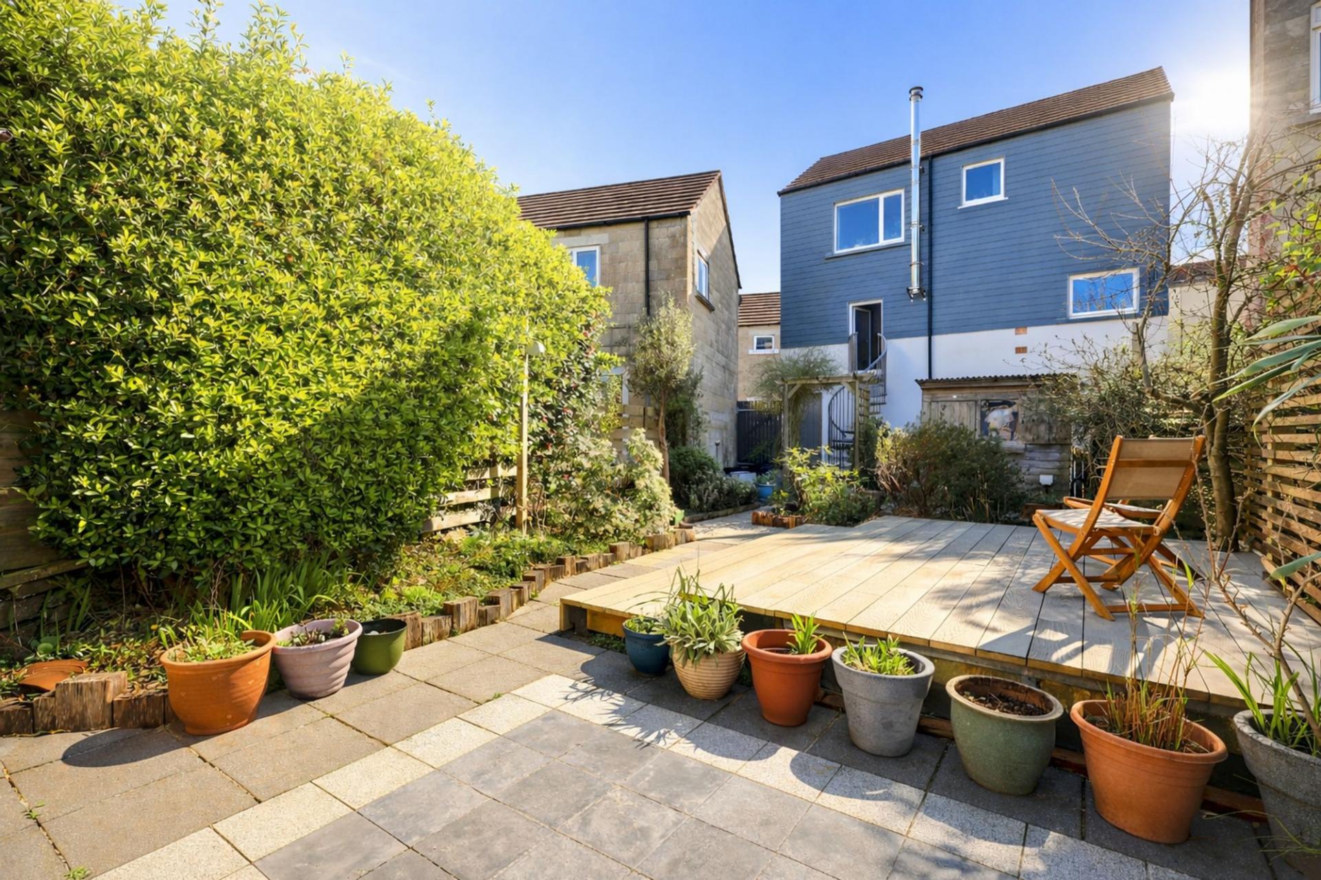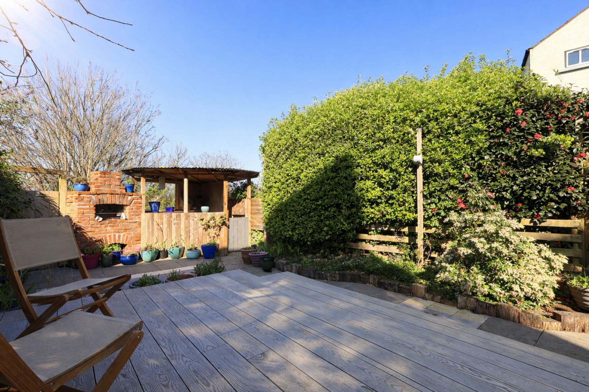 - BEAUTIFULLY ESTABLISHED REAR GARDEN WITH RAISED DECKING, STONE OVEN, AND CORNER BAR