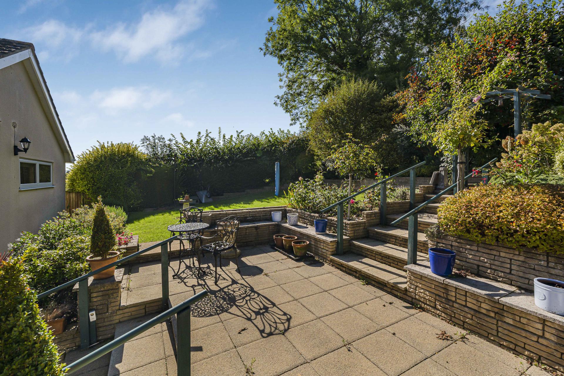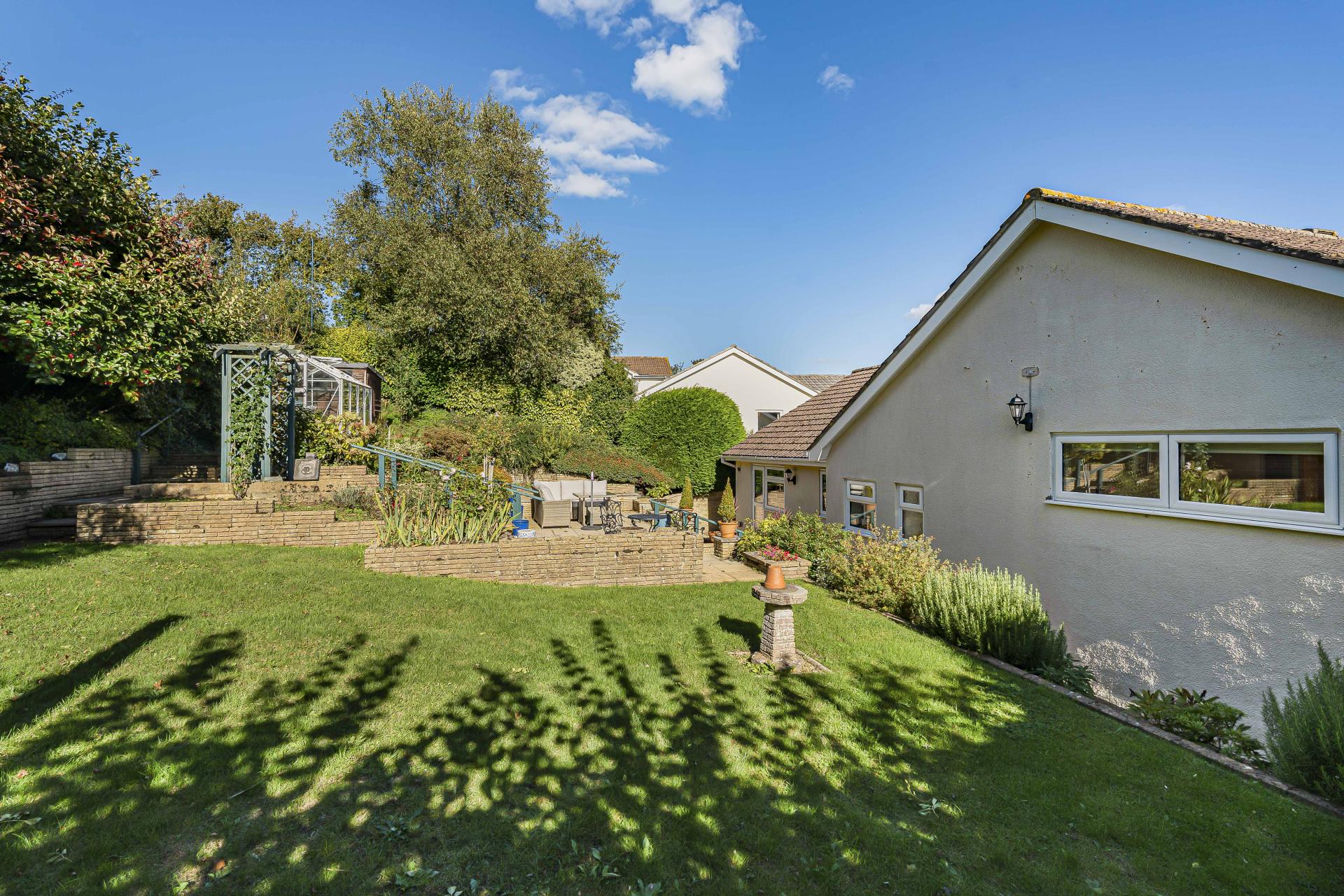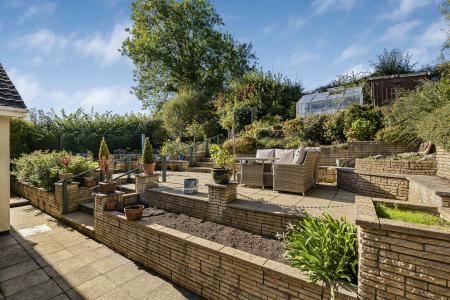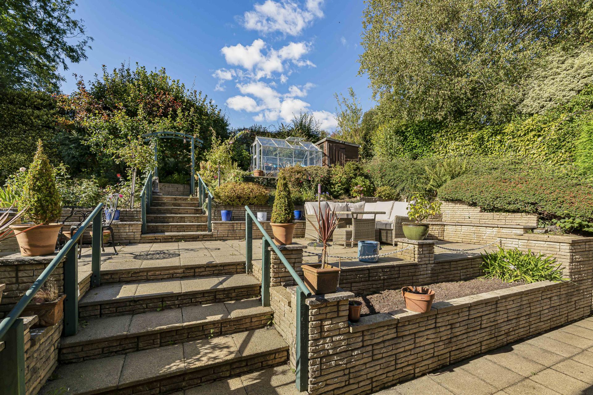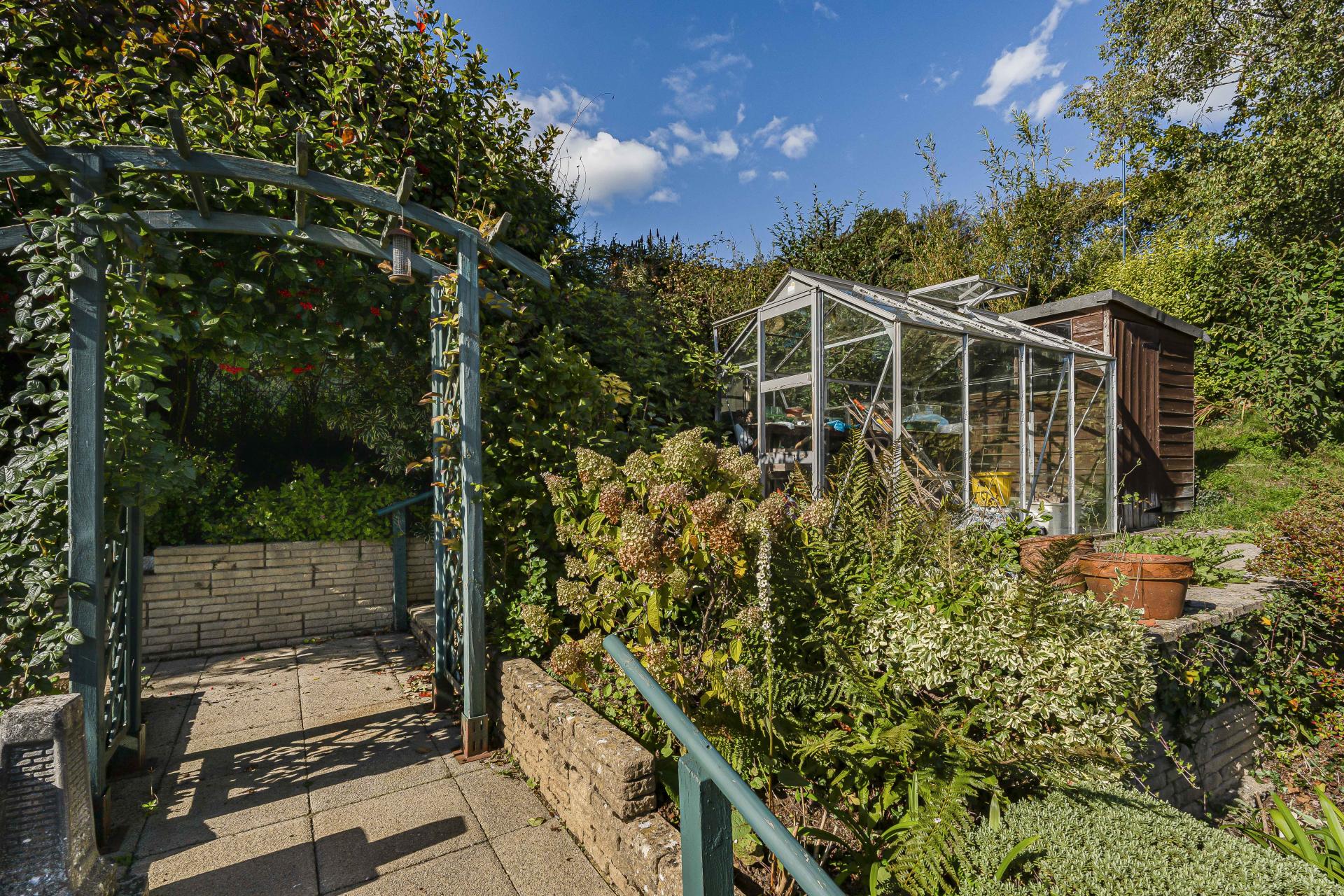 - Raised patio, arbour, greenhouse, shed & raised beds