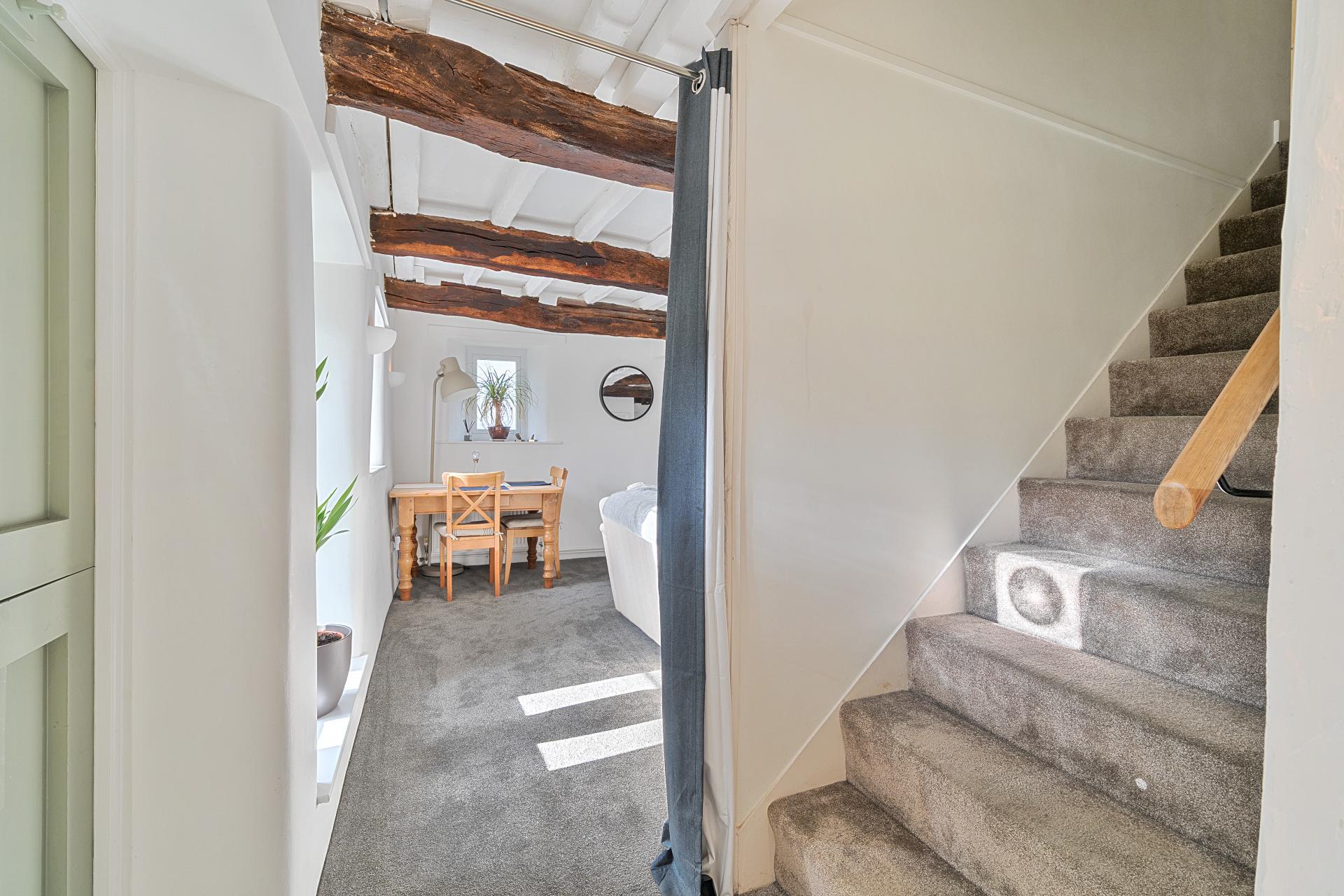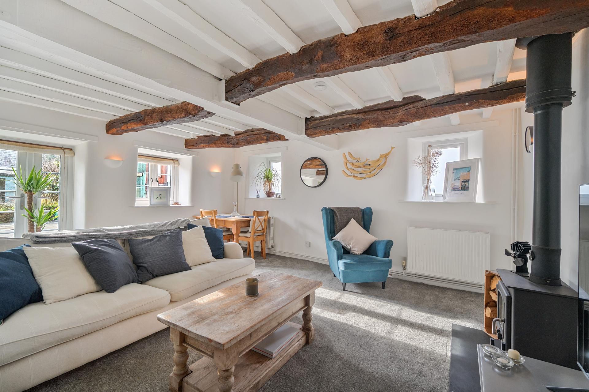 - Cosy sitting room with wood-burning stove – exposed beams and deep-set windows creating a warm, welc