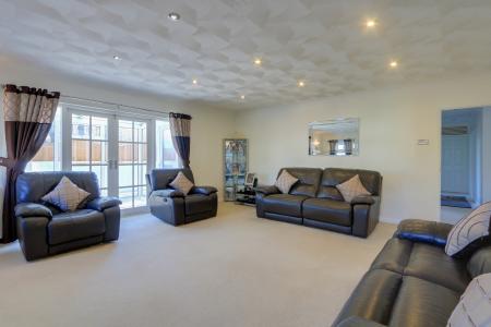 The spacious living room is flooded with light from dual-aspect windows and French doors that lead into the conservatory. An elegant fireplace with marble hearth and flame-effect electric heater adds a focal point, while plush carpeting makes the space feel cosy and inviting despite its generous proportions. The adjoining conservatory features a tiled floor and direct access to the garden - ideal for enjoying the outdoors all year round.
