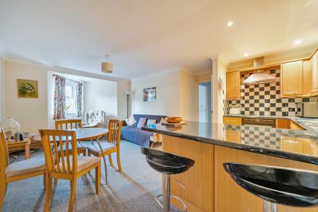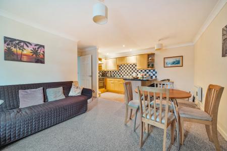The apartment benefits from slim line electric heating and double glazing. The entrance hall gives access to all rooms. The main open plan living room comprises a kitchen fitted with a range of wall and base units with worktops over incorporating a stainless-steel sink with mixer tap above. Appliances include a built-in oven, with an electric hob and extractor hood over, an integrated fridge/freezer and washing machine. The sitting area has a window overlooking the front elevation and there is plenty of room for a dining table and chairs.