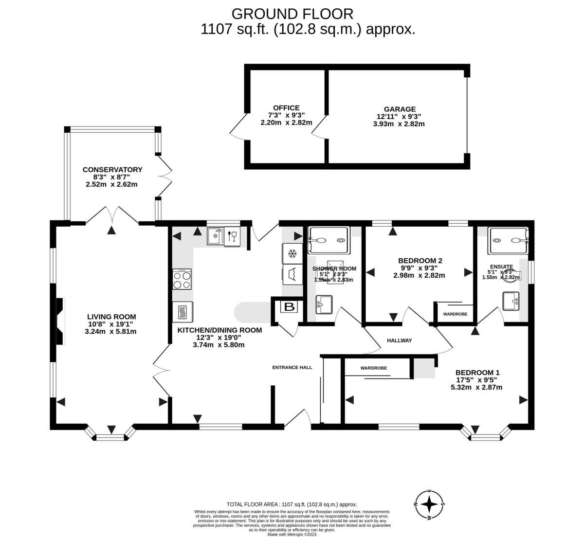 Outside, the garage not only accommodates your vehicle but also hosts a dedicated office space, and there is additional parking for two cars on the tarmac driveway, ensuring convenience for residents and guests alike. There are lawns at both ends of the property, a paved path from the rear of the garage to the driveway, and at the front, a gently sloping ramp provides easy wheelchair accessibility.