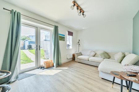 Inside, the home is beautifully presented with light and neutral décor throughout, and it feels warm and inviting with gas central heating and double glazing. The accommodation briefly compromises an entrance hall with a meter cupboard, a convenient cloakroom containing a WC and basin, a useful storage cupboard for coats and shoes and a staircase rising to the first floor. The modern kitchen dining room has worktops on two sides and a range of fitted white units providing ample cupboard space, a fan-oven, ceramic hob, floor space for an upright fridge/freezer, and space with plumbing for a washing machine. There is space for a table and six chairs to enjoy an evening meal with family or friends. The spacious lounge is filled with light from patio doors to the rear garden.