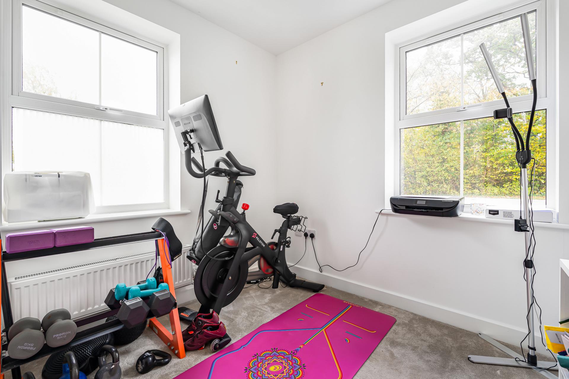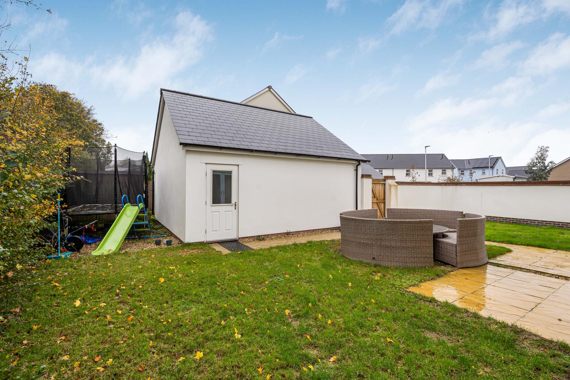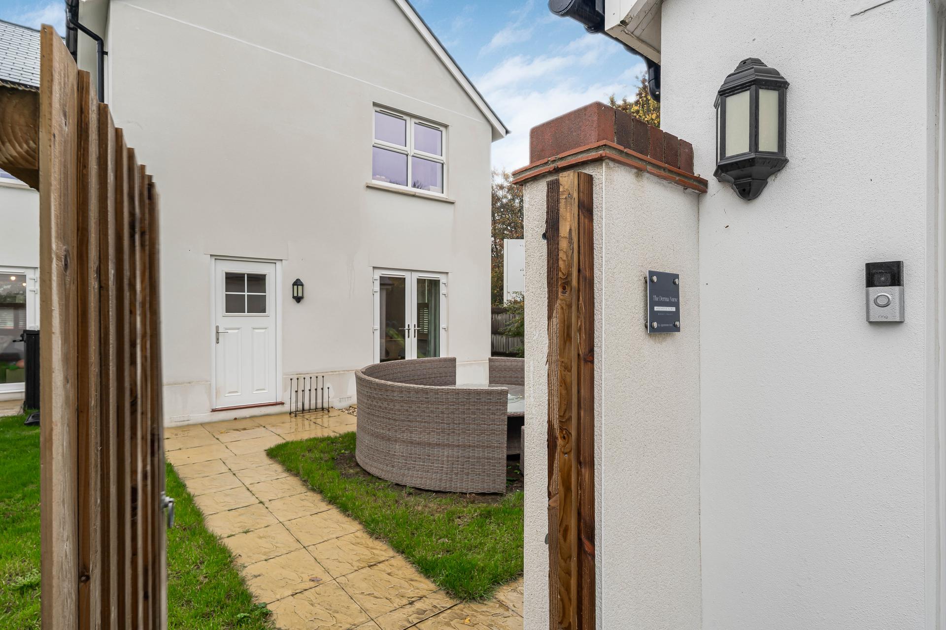 The rear garden is a lovely feature of the home, offering both privacy and a peaceful outlook with mature trees providing a natural backdrop. A spacious patio area extends from the rear of the property, creating the perfect spot for outdoor dining and entertaining. The garden is mainly laid to lawn, offering ample space for children to play or for those who enjoy gardening to add their own touches of colour and character throughout the seasons. A side gate provides convenient access to the driveway which provides parking for three vehicles. Half of the double garage has been thoughtfully converted into a stylish and functional treatment room, offering an ideal space for those wishing to run a business from home or create a dedicated wellness, therapy, or consulting area. Finished to a high standard, the room features modern Karndean flooring, recessed spotlights, and neutral décor, providing a calm and professional environment. A separate entrance from the garden ensures privacy and convenience for clients or visitors. The remaining half of the garage continues to offer valuable storage space.
