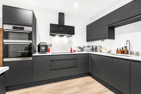 At the heart of the home lies the beautifully designed kitchen and dining area, thoughtfully upgraded to offer both luxury and functionality. The kitchen features striking matte-black cabinetry complemented by premium quartz worktops and matching quartz splash backs, creating a sleek, modern aesthetic. A range of integrated appliances includes a dishwasher, fridge freezer, double oven and an impressive six-ring induction hob with a statement extractor above, perfect for those who love to cook and entertain. A stylish breakfast bar provides a relaxed seating area for casual dining, while the adjoining dining space easily accommodates a large family table, making it ideal for gatherings and celebrations. A useful large cupboard provides excellent additional storage and could easily be used as a larder, offering ample space for household essentials. Flooded with natural light from dual-aspect windows and French doors opening directly to the garden, this room offers a seamless blend of contemporary design and everyday comfort. A door leads into the utility room with matching units and worktops, including a sink and integral tumble dryer and space for a washing machine. A wall cupboard houses the gas central heating boiler and completing this room there is a door out into the garden.