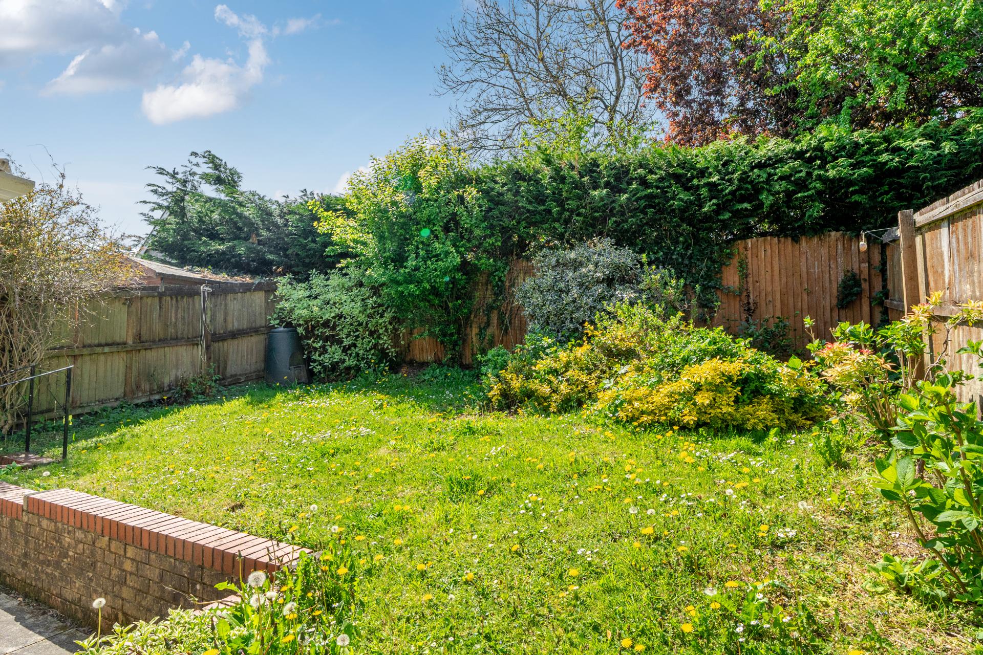 Outside, the property offers a single garage with power and light, and driveway parking for two to three cars. A pathway leads to the enclosed rear garden, which provides excellent privacy. A paved patio area is perfect for summer barbecues and outdoor dining, leading up to a neatly kept lawn bordered by mature planting.