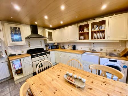 The KITCHEN/DINER is located at the rear of the house and is fitted with a large selection of wall and floor mounted units, solid Oak worktops and inset Belfast sink with swan neck mixer top over. There is a large Rangemaster gas and fan assisted oven with matching extractor hood over. The kitchen enjoys far reaching views of the local fields.