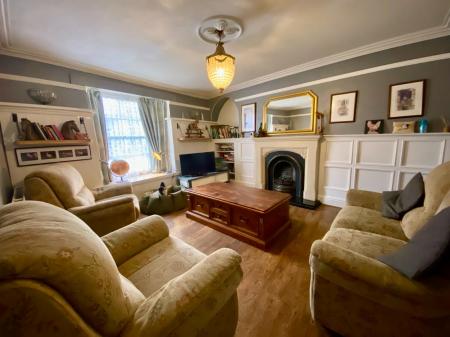 To the front of the house sits the LOUNGE. Bay window with single glazed sash window overlooking the town square. Focal cast iron fireplace with gas fire and stone surround, and wall mounted wood panelling.
